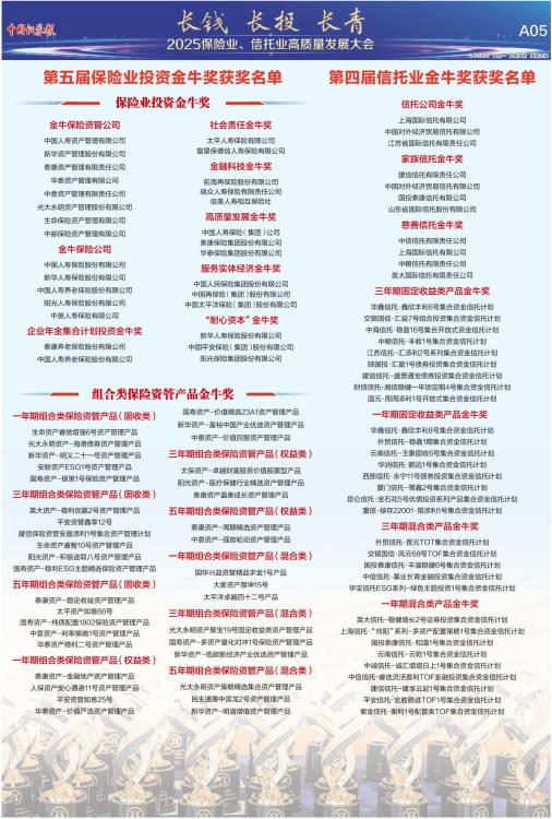 信托公司金牛奖 家族信托金牛奖慈善信托金牛奖 上海国际信托有限公司 中国对外经济贸易信托有限公司 江苏省国际信托有限责任公司 家族信托金牛奖 建信信托有限责任公司 中国对外经济贸易信托有限公司 国投泰康信托有限公司 山东省国际信托股份有限公司 慈善信托金牛奖 中信信托有限责任公司 上海国际信托有限公司 中粮信托有限责任公司 英大国际信托有限责任公司 三年期固定收益类产品金牛奖 华鑫信托·鑫欣丰利6号集合资金信托计划 交银国信·汇益7号组合投资集合资金信托计划 中海信托·稳盈16号集合开放式资金信托计划 中粮信托·丰收1号集合资金信托计划 江苏信托-汇添利2号系列集合资金信托计划 陕国投·汇盈1号债券投资集合资金信托计划 建信信托-盛景通宝债券投资集合资金信托计划 财信信托·湘信稳健一年锁定期4号集合资金信托计划 国元·周周添利1号开放式集合资金信托计划 一年期固定收益类产品金牛奖 华鑫信托·鑫欣丰利8号集合资金信托计划 外贸信托-稳鑫1期集合资金信托计划 云南信托-玉象固收6号集合资金信托计划 华润信托·鹏远1号集合资金信托计划 西部信托·永宁11号债券投资集合资金信托计划 厦门信托-鹭鑫2号集合资金信托计划 昆仑信托·宝石花5号优债投资系列产品集合资金信托计划 重信·禄存22001·周添利1号集合资金信托计划 三年期混合类产品金牛奖 外贸信托·晋元TOT集合资金信托计划 交银国信·风云68号TOF集合资金信托计划 国投泰康信托·丰溋稳健6号集合资金信托计划 中信信托·基业长青金融投资集合资金信托计划 华宝信托ESG系列-绿色主题投资1号集合资金信托计划 一年期混合类产品金牛奖 英大信托-稳健增长2号证券投资集合资金信托计划 上海信托·“向阳”系列-多资产配置策略1号集合资金信托计划 国投泰康信托·和溋1号集合资金信托计划 云南信托-云乾1号集合资金信托计划 中诚信托-诚汇增增日上1号集合资金信托计划 中信信托·睿选灵活套利TOF金融投资集合资金信托计划 建信信托-建享云起1号集合资金信托计划 平安信托·安胜稳进TOF1号集合资金信托计划 紫金信托·衡利1号配置类TOF集合资金信托计划