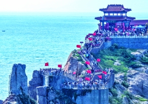 10月4日,游客在山东省荣成市成山头风景区游玩(无人机照片)。 新华社图文