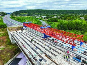 这是10月12日拍摄的京昆高速广元至绵阳段扩容工程牛头河大桥架梁作业现场(无人机照片)。 10月12日,由中铁五局承建的京昆高速广元至绵阳段扩容工程牛头河大桥完成最后一片T梁架设,标志绵阳段完成全部架梁,为全线建成通车奠定坚实基础。京昆高速广元至绵阳段扩容工程建成后,将使贯穿川陕的骨干公路流量进一步提升,使其成为成渝地区乃至我国西南地区通往华中华北、京津冀的又一条快捷通道。 新华社记者 王曦 摄