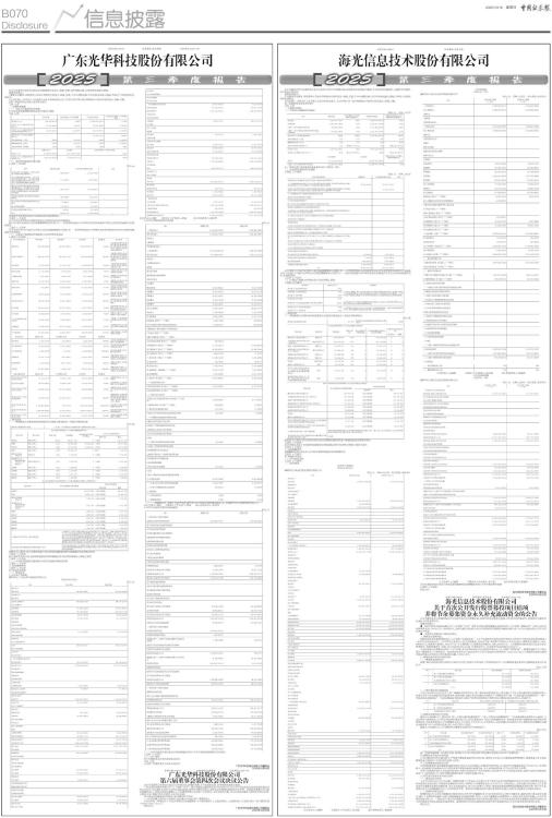 证券代码:002741 证券简称:光华科技 公告编号:2025-048 本公司及董事会全体成员保证信息披露的内容真实、准确、完整,没有虚假记载、误导性陈述或重大遗漏。 重要内容提示: 1.董事会及董事、高级管理人员保证季度报告的真实、准确、完整,不存在虚假记载、误导性陈述或重大遗漏,并承担个别和连带的法律责任。 2.公司负责人、主管会计工作负责人及会计机构负责人(会计主管人员)声明:保证季度报告中财务信息的真实、准确、完整。 3.第三季度财务会计报告是否经过审计 □是 √否 一、主要财务数据 (一) 主要会计数据和财务指标 公司是否需追溯调整或重述以前年度会计数据 □是 √否 ■ (二) 非经常性损益项目和金额 √适用 □不适用 单位:元 ■ 其他符合非经常性损益定义的损益项目的具体情况: □适用 √不适用 公司不存在其他符合非经常性损益定义的损益项目的具体情况。 将《公开发行证券的公司信息披露解释性公告第1号一一非经常性损益》中列举的非经常性损益项目界定为经常性损益项目的情况说明 □适用 √不适用 公司不存在将《公开发行证券的公司信息披露解释性公告第1号一一非经常性损益》中列举的非经常性损益项目界定为经常性损益的项目的情形。 (三) 主要会计数据和财务指标发生变动的情况及原因 √适用 □不适用 ■ 二、股东信息 (一) 普通股股东总数和表决权恢复的优先股股东数量及前十名股东持股情况表 单位:股 ■ 持股5%以上股东、前10名股东及前10名无限售流通股股东参与转融通业务出借股份情况 □适用 √不适用 前10名股东及前10名无限售流通股股东因转融通出借/归还原因导致较上期发生变化 □适用 √不适用 (二) 公司优先股股东总数及前10名优先股股东持股情况表 □适用 √不适用 三、其他重要事项 □适用 √不适用 四、季度财务报表 (一) 财务报表 1、合并资产负债表 编制单位:广东光华科技股份有限公司 2025年09月30日 单位:元 ■ ■ 法定代表人:郑靭 主管会计工作负责人:蔡雯 会计机构负责人:黄启秀 2、合并年初到报告期末利润表 单位:元 ■ 本期发生同一控制下企业合并的,被合并方在合并前实现的净利润为:元,上期被合并方实现的净利润为:元。 法定代表人:郑靭 主管会计工作负责人:蔡雯 会计机构负责人:黄启秀 3、合并年初到报告期末现金流量表 单位:元 ■ (二) 2025年起首次执行新会计准则调整首次执行当年年初财务报表相关项目情况 □适用 √不适用 (三) 审计报告 第三季度财务会计报告是否经过审计 □是 √否 公司第三季度财务会计报告未经审计。 广东光华科技股份有限公司董事会 2025年10月16日 证券代码:002741 证券简称:光华科技 公告编号:2025-047 广东光华科技股份有限公司 第六届董事会第四次会议决议公告 本公司及董事会全体成员保证公告内容真实、准确和完整,不存在虚假记载、误导性陈述或重大遗漏。 广东光华科技股份有限公司(以下简称“公司”)第六届董事会第四次会议于2025年10月15日在公司会议室以现场和通讯相结合的方式召开,会议通知于2025年10月8日通过电话、邮件及书面形式发出,本次会议由董事长陈汉昭先生主持。出席本次董事会会议的应到董事为9人,实际出席会议董事9人。公司高级管理人员列席了本次会议。本次会议的召集、召开以及参会董事人数均符合相关法律、法规及公司《章程》的有关规定,会议合法有效。 经出席会议的董事审议及表决,审议通过如下决议: 一、以9票同意、0票反对、0票弃权,审议通过《2025年第三季度报告》。 《2025年第三季度报告》详见公司指定信息披露媒体《中国证券报》、《上海证券报》、《证券时报》、《证券日报》和巨潮资讯网(www.cninfo.com.cn)。 特此公告。 广东光华科技股份有限公司董事会 2025年10月16日