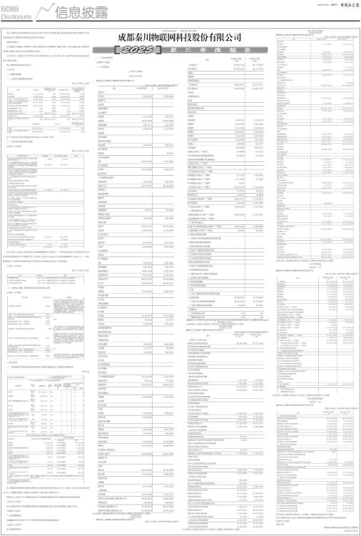 本公司董事会及全体董事保证本公告内容不存在任何虚假记载、误导性陈述或者重大遗漏,并对其内容的真实性、准确性和完整性依法承担法律责任。 重要内容提示: 公司董事会及董事、高级管理人员保证季度报告内容的真实、准确、完整,不存在虚假记载、误导性陈述或重大遗漏,并承担个别和连带的法律责任。 公司负责人、主管会计工作负责人及会计机构负责人(会计主管人员)保证季度报告中财务信息的真实、准确、完整。 第三季度财务报表是否经审计 □是√否 一、主要财务数据 (一)主要会计数据和财务指标 单位:元币种:人民币 ■ 注:“本报告期”指本季度初至本季度末3个月期间,下同。 (二)非经常性损益项目和金额 √适用 □不适用 单位:元币种:人民币 ■ 对公司将《公开发行证券的公司信息披露解释性公告第1号一一非经常性损益》未列举的项目认定为非经常性损益项目且金额重大的,以及将《公开发行证券的公司信息披露解释性公告第1号一一非经常性损益》中列举的非经常性损益项目界定为经常性损益的项目,应说明原因。 √适用 □不适用 单位:元币种:人民币 ■ (三)主要会计数据、财务指标发生变动的情况、原因 √适用 □不适用 ■ 二、股东信息 (一)普通股股东总数和表决权恢复的优先股股东数量及前十名股东持股情况表 单位:股 ■ 注:成都秦川物联网科技股份有限公司回购专用证券账户持股8,756,909股,占公司总股本的比例为5.21%(根据相关规定,回购专用证券账户不纳入前10名股东列示)。 持股5%以上股东、前10名股东及前10名无限售流通股股东参与转融通业务出借股份情况 □适用 √不适用 前10名股东及前10名无限售流通股股东因转融通出借/归还原因导致较上期发生变化 □适用√不适用 三、其他提醒事项 需提醒投资者关注的关于公司报告期经营情况的其他重要信息 □适用 √不适用 四、季度财务报表 (一)审计意见类型 □适用√不适用 (二)财务报表 合并资产负债表 2025年9月30日 编制单位:成都秦川物联网科技股份有限公司 单位:元币种:人民币审计类型:未经审计 ■ 公司负责人:邵泽华主管会计工作负责人:李婷会计机构负责人:罗媛 合并利润表 2025年1一9月 编制单位:成都秦川物联网科技股份有限公司 单位:元币种:人民币审计类型:未经审计 ■ 本期发生同一控制下企业合并的,被合并方在合并前实现的净利润为:0.00元,上期被合并方实现的净利润为:0.00元。 公司负责人:邵泽华主管会计工作负责人:李婷会计机构负责人:罗媛 合并现金流量表 2025年1一9月 编制单位:成都秦川物联网科技股份有限公司 单位:元币种:人民币审计类型:未经审计 ■ 公司负责人:邵泽华主管会计工作负责人:李婷会计机构负责人:罗媛 母公司资产负债表 2025年9月30日 编制单位:成都秦川物联网科技股份有限公司 单位:元币种:人民币审计类型:未经审计 ■ 公司负责人:邵泽华主管会计工作负责人:李婷会计机构负责人:罗媛 母公司利润表 2025年1一9月 编制单位:成都秦川物联网科技股份有限公司 单位:元币种:人民币审计类型:未经审计 ■ 公司负责人:邵泽华主管会计工作负责人:李婷会计机构负责人:罗媛 母公司现金流量表 2025年1一9月 编制单位:成都秦川物联网科技股份有限公司 单位:元币种:人民币审计类型:未经审计 ■ 公司负责人:邵泽华主管会计工作负责人:李婷会计机构负责人:罗媛 2025年起首次执行新会计准则或准则解释等涉及调整首次执行当年年初的财务报表 □适用√不适用 特此公告。 成都秦川物联网科技股份有限公司董事会 2025年10月16日 证券代码:688528 证券简称:秦川物联