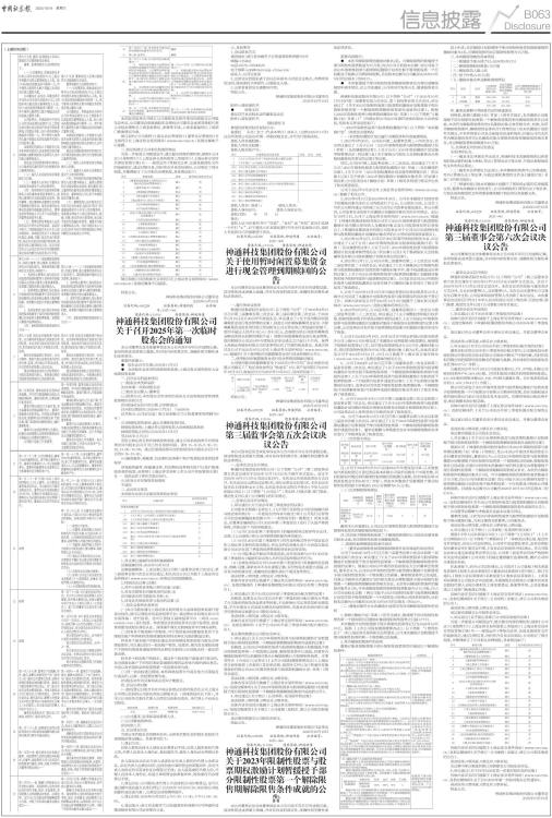 ■ ■ ■ 本次取消监事会并修订公司章程及其附件事项尚需提交公司股东会审议,公司董事会拟提请股东会授权公司董事会或者其授权代理人全权办理相关工商变更登记、备案等手续,上述变更最终以工商部门核准登记为准。 修订后的《公司章程》《股东会议事规则》《董事会议事规则》全文将同日在上海证券交易所网站(www.sse.com.cn)及指定媒体予以披露。 三、制定和修订公司相关制度的情况 为进一步促进公司规范运作,建立健全内部治理机制,根据《公司法》《章程指引》《上海证券交易所股票上市规则》《上海证券交易所自律监管指引第1号一一规范运作》等相关法律、法规及规范性文件的最新规定,通过对照自查,同时结合自身实际情况,公司制定了部分制度,并整理修订了公司相关治理制度,具体情况如下: ■ 制定和修订后的制度全文将同日在上海证券交易所网站(www.sse.com.cn)及指定媒体予以披露。 特此公告。 神通科技集团股份有限公司董事会 2025年10月18日 证券代码:605228 证券简称:神通科技 公告编号:2025-066 债券代码:111016 转债简称:神通转债 神通科技集团股份有限公司 关于召开2025年第一次临时股东会的通知 本公司董事会及全体董事保证本公告内容不存在任何虚假记载、误导性陈述或者重大遗漏,并对其内容的真实性、准确性和完整性承担法律责任。 重要内容提示: ● 股东会召开日期:2025年11月3日 ● 本次股东会采用的网络投票系统:上海证券交易所股东大会网络投票系统 一、召开会议的基本情况 (一)股东会类型和届次 2025年第一次临时股东会 (二)股东会召集人:董事会 (三)投票方式:本次股东会所采用的表决方式是现场投票和网络投票相结合的方式 (四)现场会议召开的日期、时间和地点 召开的日期时间:2025年11月3日 14点00分 召开地点:公司会议室(浙江省余姚市兰江街道谭家岭西路788号) (五)网络投票的系统、起止日期和投票时间。 网络投票系统:上海证券交易所股东大会网络投票系统 网络投票起止时间:自2025年11月3日 至2025年11月3日 采用上海证券交易所网络投票系统,通过交易系统投票平台的投票时间为股东会召开当日的交易时间段,即9:15-9:25,9:30-11:30,13:00-15:00;通过互联网投票平台的投票时间为股东会召开当日的9:15-15:00。 (六)融资融券、转融通、约定购回业务账户和沪股通投资者的投票程序 涉及融资融券、转融通业务、约定购回业务相关账户以及沪股通投资者的投票,应按照《上海证券交易所上市公司自律监管指引第1号 一 规范运作》等有关规定执行。 (七)涉及公开征集股东投票权 不适用 二、会议审议事项 本次股东会审议议案及投票股东类型 ■ 1、各议案已披露的时间和披露媒体 议案披露时间:2025年10月18日 议案披露媒体:上述议案已经公司第三届董事会第六次会议、第三届监事会第五次会议审议通过,相关决议公告已刊载于上海证券交易所网站(www.sse.com.cn)和指定信息披露媒体。 2、特别决议议案:议案2 3、对中小投资者单独计票的议案:议案1 4、涉及关联股东回避表决的议案:无 应回避表决的关联股东名称:无 5、涉及优先股股东参与表决的议案:无 三、股东会投票注意事项 (一)本公司股东通过上海证券交易所股东大会网络投票系统行使表决权的,既可以登陆交易系统投票平台(通过指定交易的证券公司交易终端)进行投票,也可以登陆互联网投票平台(网址:vote.sseinfo.com)进行投票。首次登陆互联网投票平台进行投票的,投资者需要完成股东身份认证。具体操作请见互联网投票平台网站说明。 (二)持有多个股东账户的股东,可行使的表决权数量是其名下全部股东账户所持相同类别普通股和相同品种优先股的数量总和。 持有多个股东账户的股东通过本所网络投票系统参与股东会网络投票的,可以通过其任一股东账户参加。投票后,视为其全部股东账户下的相同类别普通股和相同品种优先股均已分别投出同一意见的表决票。 持有多个股东账户的股东,通过多个股东账户重复进行表决的,其全部股东账户下的相同类别普通股和相同品种优先股的表决意见,分别以各类别和品种股票的第一次投票结果为准。 (三)同一表决权通过现场、本所网络投票平台或其他方式重复进行表决的,以第一次投票结果为准。 (四)股东对所有议案均表决完毕才能提交。 四、会议出席对象 (一)股权登记日收市后在中国证券登记结算有限责任公司上海分公司登记在册的公司股东有权出席股东会(具体情况详见下表),并可以以书面形式委托代理人出席会议和参加表决。该代理人不必是公司股东。 ■ (二)公司董事、监事和高级管理人员。 (三)公司聘请的律师。 (四)其他人员 五、会议登记方法 为保证本次股东会的顺利召开,出席本次股东会的股东及股东代表需提前登记确认。具体事项如下: 1、登记方式: 自然人股东应持本人身份证办理登记手续;自然人股东委托代理人的,代理人应持本人身份证、授权委托书、委托人身份证办理登记手续。 法人股东应由法定代表人或者法定代表人委托的代理人出席会议。法定代表人出席会议的,应持加盖公章的营业执照复印件、法定代表人身份证明书及身份证办理登记手续;法人股东委托代理人的,代理人应持本人身份证、加盖公章的营业执照复印件、授权委托书办理登记手续。 2、登记办法:公司股东或代