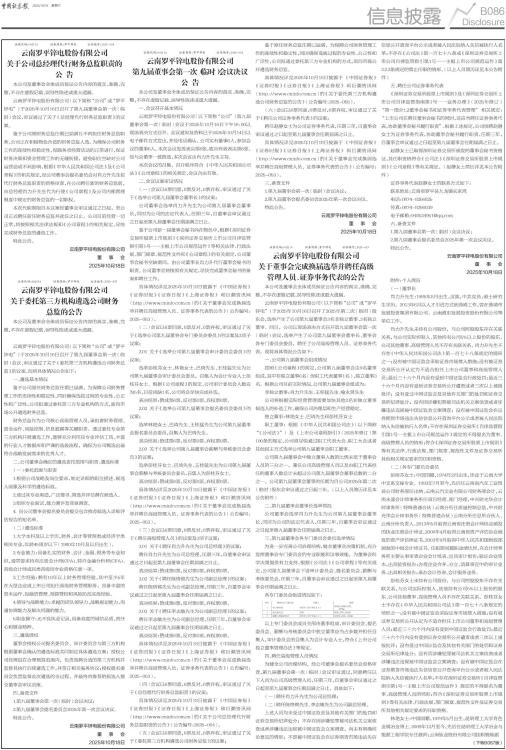 证券代码:002114 证券简称:罗平锌电 公告编号:2025-054 云南罗平锌电股份有限公司 关于公司总经理代行财务总监职责的公 告 本公司及董事会全体成员保证公告内容的真实、准确、完整,不存在虚假记载、误导性陈述或重大遗漏。 云南罗平锌电股份有限公司(以下简称“公司”或“罗平锌电”)于2025年10月16日召开了第九届董事会第一次(临时)会议,审议通过了关于《总经理代行财务总监职责》的议案。 鉴于公司原财务总监任期已届满且不再担任财务总监职务,公司正在积极物色合适的财务总监人选。为确保公司财务工作的连续性和稳定性,保障各项经营活动的正常进行,保证财务决策和资金管理工作的无缝衔接,避免职位空缺对公司运营造成不利影响,根据《中华人民共和国公司法》及《公司章程》的相关规定,经公司董事会提名委员会对肖力升先生拟代行财务总监职责的资格审查,在公司聘任新的财务总监前,由总经理肖力升先生代为行使《公司章程》及公司内部管理制度中规定的财务总监的一切职权。 本次代职期限自本议案经董事会审议通过之日起,至公司正式聘任新任财务总监并就任之日止。公司目前经营一切正常,将按照相关法律法规和《公司章程》的相关规定,尽快完成财务总监的遴选工作。 特此公告。 云南罗平锌电股份有限公司 董 事 会 2025年10月18日 证券代码:002114 证券简称:罗平锌电 公告编号:2025-055 云南罗平锌电股份有限公司 关于委托第三方机构遴选公司财务 总监的公告 本公司及董事会全体成员保证公告内容的真实、准确、完整,不存在虚假记载、误导性陈述或重大遗漏。 云南罗平锌电股份有限公司(以下简称“公司”或“罗平锌电”)于2025年10月16日召开了第九届董事会第一次(临时)会议,审议通过了关于《委托第三方机构遴选公司财务总监》的议案,现将具体情况公告如下: 一、遴选基本情况 鉴于公司原任财务总监任期已届满,为保障公司财务管理工作的连续性和稳定性,同时确保选拔过程的专业性、公正性和广泛性,公司拟通过委托第三方专业机构的方式,面向市场公开遴选财务总监。 财务总监作为公司核心高级管理人员,承担着财务管理、资金运作、风险控制、信息披露等关键职责。通过委托专业第三方机构开展遴选工作,能够充分利用其专业评估工具、丰富的行业人才数据库和严谨的选拔流程,确保为公司甄选出最符合战略发展需求的优秀人才。 二、公司董事会确定的遴选委托范围与职责、遴选标准 (一)委托范围与职责 1.根据公司战略及岗位要求,制定详细的职位描述、候选人画像及科学的遴选标准。 2.通过其专业渠道,广泛搜寻、筛选并评估潜在候选人。 3.组织专业面试、能力测评及背景调查。 4.向公司董事会提名委员会提交包含推荐候选人详细评估报告的短名单。 (二)遴选标准 1.大学本科及以上学历,财务、会计等管理类或经济学类相关专业,年龄45周岁以下(1980年10月及以后出生)。 2.专业能力:具备扎实的财务、会计、金融、税务等专业知识,通常要求持有注册会计师(CPA)、特许金融分析师(CFA)、高级会计师或同类高级别专业资格任意一项。 3.工作经验:拥有10年以上财务管理经验,其中至少5年在大型企业或上市公司担任高级财务管理职务,具备丰富的资本运作、投融资管理、预算管控和风险防范实战经验。 4.领导与战略能力:卓越的团队领导力、战略规划能力、沟通协调能力及解决问题的能力。 5.职业操守:无不良执业记录,具备高度的诚信品质、责任心和敬业精神。 三、遴选授权 董事会授权公司提名委员会、审计委员会与第三方机构根据董事会确认的遴选标准共同制定具体遴选方案;授权公司经理层在合理预算范围内,负责选聘合适的第三方机构并监督其执行后续遴选工作,并签订相关服务协议;授权提名委员会负责监督此次遴选的全过程,并最终将推荐的候选人提交董事会审议决策。 四、备查文件 1.第九届董事会第一次(临时)会议决议; 2.第九届董事会提名委员会2025年第一次会议决议。 特此公告。 云南罗平锌电股份有限公司 董 事 会 2025年10月18日 证券代码:002114 证券简称:罗平锌电 公告编号:2025-052 云南罗平锌电股份有限公司 第九届董事会第一次(临时)会议决议公 告 本公司及董事会全体成员保证公告内容的真实、准确、完整,不存在虚假记载、误导性陈述或重大遗漏。 一、会议召开基本情况 云南罗平锌电股份有限公司(以下简称“公司”)第九届董事会第一次(临时)会议于2025年10月16日下午16:00以现场表决方式召开。会议通知及资料已于2025年10月14日以电子邮件方式发出,并经电话确认。公司实有董事6人,参加会议的董事6人。本次会议发放表决票6张,收回有效表决票6张。经与会董事一致推选,本次会议由肖力升先生主持。 本次会议的召集、召开程序符合《中华人民共和国公司法》《公司章程》的相关规定,会议合法有效。 二、会议议案审议情况 (一)会议以6票同意,0票反对,0票弃权,审议通过了关于《选举公司第九届董事会董事长》的议案; 公司董事会选举肖力升先生为公司第九届董事会董事长,同时为公司的法定代表人,任期三年,自董事会审议通过之日起至第九届董事会任期届满之日止。 鉴于公司新一届董事会秘书尚在物色中,根据《深圳证券交易所股票上市规则》《深圳证券交易所上