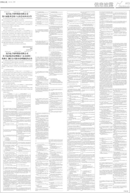证券代码:603002 证券简称:宏昌电子 公告编号:2025-038 宏昌电子材料股份有限公司 第六届监事会第十五次会议决议公告 本公司监事会及全体监事保证本公告内容不存在任何虚假记载、误导性陈述或者重大遗漏,并对其内容的真实性、准确性和完整性承担个别及连带责任。 宏昌电子材料股份有限公司(以下简称“本公司”或“公司”)于2025年10月15日以电子邮件方式发出召开第六届监事会第十五次会议的通知,于2025年10月20日以通讯投票表决的方式召开第六届监事会第十五次会议。会议应出席监事三名,实际出席监事三名。会议召开符合有关法律、法规和《公司章程》的规定。 会议审议通过了以下议案: 一、审议通过了《关于取消监事会暨修订〈公司章程〉的议案》。 根据《中华人民共和国公司法》(以下简称《公司法》)、《上市公司章程指引》、《上市公司治理准则》、等相关法律法规、规范性文件的规定,结合公司实际情况,同意对公司治理结构进行调整,不再设置监事会、监事,由董事会审计委员会承接监事会职权,并对《宏昌电子材料股份有限公司公司章程》(以下简称《公司章程》)进行修订,公司《监事会议事规则》相应废止,公司各项规章制度中涉及监事会、监事的规定不再适用。自股东大会审议通过取消监事会的有关议案之日起,公司第六届监事会监事职务自动免除。 关于取消监事会暨修订《公司章程》的事项尚需提交公司股东大会审议,在公司股东大会审议通过取消监事会前,公司第六届监事会仍将严格按照法律、法规及规范性文件的要求,勤勉尽责履行监督职能,维护公司及全体股东的合法利益。 议案表决情况:本议案有效表决票3票,赞成3票,反对0票,弃权0票。 特此公告。 宏昌电子材料股份有限公司 监事会 2025年10月22日 证券代码:603002 证券简称:宏昌电子 公告编号:2025-036 宏昌电子材料股份有限公司 关于取消监事会暨修订《公司章程》 及修订、制订公司部分治理制度的公告 本公司董事会及全体董事保证本公告内容不存在任何虚假记载、误导性陈述或者重大遗漏,并对其内容的真实性、准确性和完整性承担个别及连带责任。 宏昌电子材料股份有限公司(以下简称“本公司”或“公司”)于2025年10月20日召开第六届董事会第十九次会议、第六届监事会第十五次会议分别审议通过了《关于取消监事会暨修订〈公司章程〉的议案》、《关于修订、制订公司部分治理制度的议案》,具体内容如下: 一、关于取消监事会的具体情况 根据《中华人民共和国公司法》(以下简称《公司法》)、《上市公司章程指引》、《上市公司治理准则》等相关法律法规、规范性文件的规定,结合公司实际情况,董事会同意对公司治理结构进行调整,不再设置监事会、监事,由董事会审计委员会承接监事会职权,并对《宏昌电子材料股份有限公司章程》(以下简称《公司章程》)进行修订,公司《监事会议事规则》相应废止,公司各项规章制度中涉及监事会、监事的规定不再适用。 取消监事会暨修订《公司章程》的事项尚需提交公司股东大会审议,在公司股东大会审议通过取消监事会前,公司第六届监事会仍将严格按照法律、法规及规范性文件的要求,勤勉尽责履行监督职能,维护公司及全体股东的合法利益。 二、关于公司章程修订的具体情况 鉴于公司取消监事会,根据《公司法》、《上市公司章程指引》、《上海证券交易所股票上市规则》等相关法律、法规和规范性文件的规定,对《公司章程》进行修订。 另,公司董事会提请股东大会授权董事会,并由董事会授权经营层或其授权人办理因本次修订《公司章程》所涉及的工商变更登记备案等一切事宜。本次修订《公司章程》最终以工商登记机关核准的内容为准。 章程修订内容如下: ■ ■ ■ ■ ■ ■ ■ ■ ■