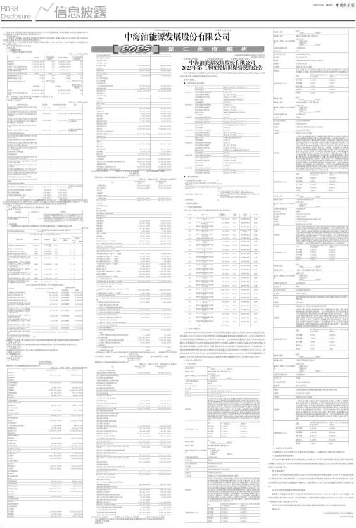 证券代码:600968 证券简称:海油发展 本公司董事会及全体董事保证本公告内容不存在任何虚假记载、误导性陈述或者重大遗漏,并对其内容的真实性、准确性和完整性承担法律责任。 重要内容提示: 公司董事会及董事、高级管理人员保证季度报告内容的真实、准确、完整,不存在虚假记载、误导性陈述或重大遗漏,并承担个别和连带的法律责任。 公司负责人、主管会计工作负责人及会计机构负责人(会计主管人员)保证季度报告中财务信息的真实、准确、完整。 第三季度财务报表是否经审计 □是 √否 一、主要财务数据 (一)主要会计数据和财务指标 单位:元 币种:人民币 ■ 注:“本报告期”指本季度初至本季度末3个月期间,下同。 (二)非经常性损益项目和金额 √适用 □不适用 单位:元 币种:人民币 ■ 对公司将《公开发行证券的公司信息披露解释性公告第1号一一非经常性损益》未列举的项目认定为非经常性损益项目且金额重大的,以及将《公开发行证券的公司信息披露解释性公告第1号一一非经常性损益》中列举的非经常性损益项目界定为经常性损益的项目,应说明原因。 □适用 √不适用 (三)主要会计数据、财务指标发生变动的情况、原因 √适用 □不适用 ■ 二、股东信息 (一)普通股股东总数和表决权恢复的优先股股东数量及前十名股东持股情况表 单位:股 ■ 持股5%以上股东、前10名股东及前10名无限售流通股股东参与转融通业务出借股份情况 □适用 √不适用 前10名股东及前10名无限售流通股股东因转融通出借/归还原因导致较上期发生变化 □适用 √不适用 三、其他提醒事项 需提醒投资者关注的关于公司报告期经营情况的其他重要信息 □适用 √不适用 四、季度财务报表 (一)审计意见类型 □适用 √不适用 (二)财务报表 合并资产负债表 2025年9月30日 编制单位:中海油能源发展股份有限公司 单位:元 币种:人民币 审计类型:未经审计 ■ ■ 公司负责人:周天育 主管会计工作负责人:种晓洁 会计机构负责人:郭振 合并利润表 2025年1一9月 编制单位:中海油能源发展股份有限公司 单位:元 币种:人民币 审计类型:未经审计 ■ 本期发生同一控制下企业合并的,被合并方在合并前实现的净利润为:0元, 上期被合并方实现的净利润为:0元。 公司负责人:周天育 主管会计工作负责人:种晓洁 会计机构负责人:郭振 合并现金流量表 2025年1一9月 编制单位:中海油能源发展股份有限公司 单位:元 币种:人民币 审计类型:未经审计 ■ 公司负责人:周天育 主管会计工作负责人:种晓洁 会计机构负责人:郭振 2025年起首次执行新会计准则或准则解释等涉及调整首次执行当年年初的财务报表 □适用 √不适用 特此公告。 中海油能源发展股份有限公司董事会 2025年10月20日 证券代码:600968 证券简称:海油发展 公告编号:2025-026 中海油能源发展股份有限公司 2025年第三季度授信担保情况的公告 本公司董事会及全体董事保证本公告内容不存在任何虚假记载、误导性陈述或者重大遗漏,并对其内容的真实性、准确性和完整性承担法律责任。 重要内容提示: ● 担保对象及基本情况 ■ ● 累计担保情况 ■ 一、担保情况概述 (一)担保的基本情况 2025年第三季度,公司对外提供授信担保的具体情况如下: ■ (二)内部决策程序 公司分别于2025年4月8日、2025年6月9日召开第五届董事会第十七次会议、2024年年度股东大会,审议通过了《关于公司2025年度对外担保计划及向金融机构申请授信额度的议案》,拟对公司控制的子公司提供新增授信担保额度不超过人民币36,500万元。上述担保额度经董事会及股东大会审议通过后,授权公司管理层在有关法律、法规及规范性文件允许范围内,从维护公司股东利益最大化的原则出发,全权办理相关担保事宜,包括但不限于:签署、更改相关协议,或办理与本担保事项相关的一切其他手续。上述担保额度授权有效期自2024年年度股东大会审议通过之日起至2025年年度股东大会召开之日止。具体内容详见公司于2025年4月10日在上海证券交易所网站(www.sse.com.cn)及指定信息披露媒体上披露的《关于2025年度对外担保计划及向金融机构申请授信额度的公告》(公告编号:2025-007)。 二、被担保人基本情况 (一)基本情况 ■ ■ ■ ■ ■ ■ ■ (二)被担保人失信情况 上述被担保人为公司全资子公司,截至本公告披露日,上述被担保人不属于失信被执行人。 三、担保的必要性和合理性 公司2025年第三季度为子公司提供担保,是为满足公司及子公司经营需要,符合公司整体利益和发展战略。公司对上述子公司的日常经营活动风险及决策能够有效控制,上述子公司资信状况良好,具备偿债能力,担保风险可控。 四、董事会意见 公司为子公司提供担保是为满足公司及子公司在经营过程中的资金需要。公司及子公司经营状况稳定,资信状况良好,担保风险可控。公司及子公司之间的互相担保不会损害公司和全体股东的利益,不会对公司的正常运作和业务发展造成不利影响。上述担保公平、对等,符合有关政策法规和《公司章程》规定。 五、累计对外担保数量及逾期担保的数量 截至本公告披露日,公司及子公司对外担保总额为人民币284,997万元(含本次),占公司最近一期经审计净资产的比例为10.49%。公司对控股子公司提供的担保总额为人民币275,600万元,占公司最近一期经审计净