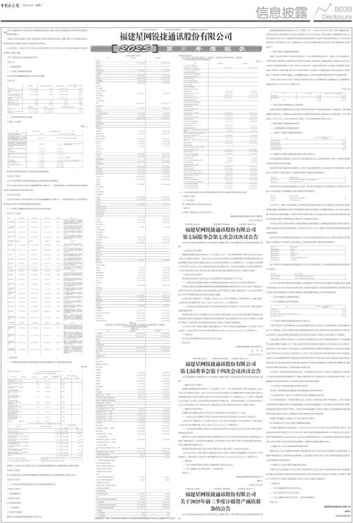 证券代码:002396 证券简称:星网锐捷 公告编号:定2025-004 本公司及董事会全体成员保证信息披露的内容真实、准确、完整,没有虚假记载、误导性陈述或重大遗漏。 重要内容提示: 1.董事会、监事会及董事、监事、高级管理人员保证季度报告的真实、准确、完整,不存在虚假记载、误导性陈述或重大遗漏,并承担个别和连带的法律责任。 2.公司负责人、主管会计工作负责人及会计机构负责人(会计主管人员)声明:保证季度报告中财务信息的真实、准确、完整。 3.第三季度财务会计报告是否经过审计 □是√否 一、主要财务数据 (一)主要会计数据和财务指标 公司是否需追溯调整或重述以前年度会计数据 □是√否 ■ (二)非经常性损益项目和金额 √适用 □不适用 单位:元 ■ 其他符合非经常性损益定义的损益项目的具体情况: □适用√不适用 公司不存在其他符合非经常性损益定义的损益项目的具体情况。 将《公开发行证券的公司信息披露解释性公告第1号一一非经常性损益》中列举的非经常性损益项目界定为经常性损益项目的情况说明 □适用√不适用 公司不存在将《公开发行证券的公司信息披露解释性公告第1号一一非经常性损益》中列举的非经常性损益项目界定为经常性损益的项目的情形。 (三)主要会计数据和财务指标发生变动的情况及原因 √适用 □不适用 ■ 二、股东信息 (一)普通股股东总数和表决权恢复的优先股股东数量及前十名股东持股情况表 单位:股 ■ 持股5%以上股东、前10名股东及前10名无限售流通股股东参与转融通业务出借股份情况 □适用√不适用 前10名股东及前10名无限售流通股股东因转融通出借/归还原因导致较上期发生变化 □适用√不适用 (二)公司优先股股东总数及前10名优先股股东持股情况表 □适用√不适用 三、其他重要事项 □适用√不适用 四、季度财务报表 (一)财务报表 1、合并资产负债表 编制单位:福建星网锐捷通讯股份有限公司 2025年09月30日 ■ 单位:元 法定代表人:阮加勇主管会计工作负责人:李寅彦会计机构负责人:吴丽丽 2、合并年初到报告期末利润表 单位:元 ■ 本期发生同一控制下企业合并的,被合并方在合并前实现的净利润为:0.00元,上期被合并方实现的净利润为:0.00元。 法定代表人:阮加勇主管会计工作负责人:李寅彦会计机构负责人:吴丽丽 3、合并年初到报告期末现金流量表 单位:元 ■ (二) 2025年起首次执行新会计准则调整首次执行当年年初财务报表相关项目情况 □适用√不适用 (三)审计报告 第三季度财务会计报告是否经过审计 □是√否 公司第三季度财务会计报告未经审计。 福建星网锐捷通讯股份有限公司董事会 2025年10月20日 证券代码:002396 证券简称:星网锐捷 公告编号:临2025-46 福建星网锐捷通讯股份有限公司 第七届监事会第七次会议决议公告 本公司及监事会全体成员保证公告内容真实、准确和完整,不存在虚假记载、误导性陈述或者重大遗漏。 一、监事会会议召开情况 福建星网锐捷通讯股份有限公司(以下简称:“公司”)第七届董事会第十四次会议通知于2025年10月10日以邮件方式发出,会议于2025年10月20日以现场的方式在福建省福州市高新区新港大道33号星网锐捷科技园三期A栋22楼会议室召开,本次会议应到董事九人,实到董事九人。公司监事、高级管理人员亦列席了本次会议,会议由董事长阮加勇先生召集并主持。本次会议的通知、召开和表决程序符合《中华人民共和国公司法》等有关法律、行政法规、部门规章、规范性文件和《公司章程》的规定。 二、监事会会议审议情况 经与会监事认真审议,本次会议以记名投票表决方式表决通过了以下决议: (一)本次会议以3票赞成,0票反对,0票弃权的表决结果,审议通过《2025年第三季度报告》 经审核,监事会认为董事会编制和审核的福建星网锐捷通讯股份有限公司《2025年第三季度报告》的程序符合法律、行政法规和中国证监会的规定,报告内容真实、准确、完整地反映了上市公司的实际情况,不存在任何虚假记载、误导性陈述或者重大遗漏。 《2025年第三季度报告》(公告编号:定2025-004)详见《证券时报》《中国证券报》《上海证券报》《证券日报》和巨潮资讯网(http://www.cninfo.com.cn)上刊登的公告。 (二)本次会议以3票赞成,0票反对,0票弃权的表决结果,审议通过《关于2025年前三季度计提资产减值准备的议案》 经审核,监事会认为:公司根据《企业会计准则》等相关规定,结合公司资产及经营的实际情况计提减值准备,更能公允地反映公司的财务状况和经营成果,相关决策程序符合有关法律、法规和《公司章程》等规定,不存在损害公司及股东利益的情形,同意公司计提资产减值损失。 《关于2025年前三季度计提资产减值准备的公告》详见公司指定信息披露媒体《证券时报》《中国证券报》《上海证券报》《证券日报》和巨潮资讯网(http://www.cninfo.com.cn)上刊登的公告。 三、备查文件 经与会监事签署的第七届监事会第七次会议决议。 特此公告。 福建星网锐捷通讯股份有限公司 监 事 会 2025年10月22日 证券代码:002396 证券简称:星网锐捷 公告编号:临2025-45 福建星网锐捷通讯股份有限公司 第七届董事会第十四次会议决议公告 本公司及董事会全体成员保证公告内容真实、准确和完整,不存在虚假记载、误导性陈述或者重大遗漏。 