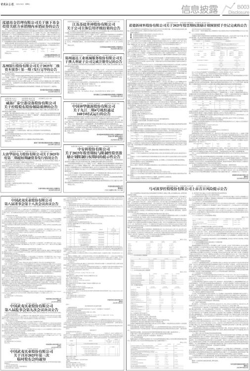 证券代码:001277 证券简称:速达股份 公告编号:2025-037 郑州速达工业机械服务股份有限公司关于澳大利亚子公司完成注册登记的公告 本公司及董事会全体成员保证信息披露的内容真实、准确、完整,没有虚假记载、误导性陈述或重大遗漏。 一、对外投资概述 郑州速达工业机械服务股份有限公司(以下简称“公司”)于2025年8月28日召开第四届董事会第十一次会议,审议通过了《关于拟设立境外子公司的议案》,同意于中国香港设立全资子公司(以下简称“香港公司”)作为公司境外投资的持股公司,再由香港公司在澳大利亚设立全资子公司(以下简称“澳洲公司”)。具体信息详见公司于2025年8月29日在《证券时报》《中国证券报》《上海证券报》《证券日报》及巨潮资讯网(http://www.cninfo.com.cn)披露的《关于对外投资设立境外子公司的公告》。 二、对外投资进展情况 近日,澳洲公司已完成注册登记,并取得注册证书,具体登记信息如下: 中文名称:速达工业(澳大利亚)有限公司 英文名称:Suda Industrial (Australia) Pty Ltd 公司编号:691 951 630 注册资本:30,000,000澳元 注册地址:Unit 15, 56 Buffalo Road, GLADESVILLE NSW 2111 特此公告。 郑州速达工业机械服务股份有限公司董事会 2025年10月22日