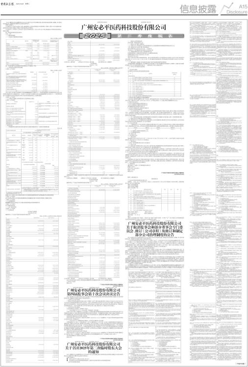 本公司董事会及全体董事保证本公告内容不存在任何虚假记载、误导性陈述或者重大遗漏,并对其内容的真实性、准确性和完整性依法承担法律责任。 重要内容提示: 公司董事会、监事会及董事、监事、高级管理人员保证季度报告内容的真实、准确、完整,不存在虚假记载、误导性陈述或重大遗漏,并承担个别和连带的法律责任。 公司负责人、主管会计工作负责人及会计机构负责人(会计主管人员)保证季度报告中财务信息的真实、准确、完整。 第三季度财务报表是否经审计 □是 √否 一、主要财务数据 (一)主要会计数据和财务指标 单位:元币种:人民币 ■ 注:“本报告期”指本季度初至本季度末3个月期间,下同。 (二)非经常性损益项目和金额 √适用 □不适用 单位:元币种:人民币 ■ 对公司将《公开发行证券的公司信息披露解释性公告第1号一一非经常性损益》未列举的项目认定为非经常性损益项目且金额重大的,以及将《公开发行证券的公司信息披露解释性公告第1号一一非经常性损益》中列举的非经常性损益项目界定为经常性损益的项目,应说明原因。 □适用 √不适用 (三)主要会计数据、财务指标发生变动的情况、原因 √适用 □不适用 ■ 二、股东信息 (一)普通股股东总数和表决权恢复的优先股股东数量及前十名股东持股情况表 单位:股 ■ 持股5%以上股东、前10名股东及前10名无限售流通股股东参与转融通业务出借股份情况 □适用 √不适用 前10名股东及前10名无限售流通股股东因转融通出借/归还原因导致较上期发生变化 □适用 √不适用 三、其他提醒事项 需提醒投资者关注的关于公司报告期经营情况的其他重要信息 □适用 √不适用 四、季度财务报表 (一)审计意见类型 □适用 √不适用 (二)财务报表 合并资产负债表 2025年9月30日 编制单位:广州安必平医药科技股份有限公司 单位:元币种:人民币审计类型:未经审计 ■ ■ 公司负责人:蔡向挺 主管会计工作负责人:侯全能 会计机构负责人:黄爱萍 合并利润表 2025年1一9月 编制单位:广州安必平医药科技股份有限公司 单位:元币种:人民币审计类型:未经审计 ■ 本期发生同一控制下企业合并的,被合并方在合并前实现的净利润为:0元, 上期被合并方实现的净利润为:0元。 公司负责人:蔡向挺 主管会计工作负责人:侯全能 会计机构负责人:黄爱萍 合并现金流量表 2025年1一9月 编制单位:广州安必平医药科技股份有限公司 单位:元币种:人民币审计类型:未经审计 ■ 公司负责人:蔡向挺 主管会计工作负责人:侯全能 会计机构负责人:黄爱萍 2025年起首次执行新会计准则或准则解释等涉及调整首次执行当年年初的财务报表 □适用√不适用 特此公告。 广州安必平医药科技股份有限公司董事会 2025年10月27日 证券代码:688393 证券简称:安必平 公告编号:2025-045 广州安必平医药科技股份有限公司 第四届监事会第十次会议决议公告 本公司监事会及全体监事保证本公告内容不存在任何虚假记载、误导性陈述或者重大遗漏,并对其内容的真实性、准确性和完整性承担个别及连带责任。 一、监事会会议召开情况 广州安必平医药科技股份有限公司(以下简称“公司”)第四届监事会第十次会议于2025年10月27日在公司会议室以现场和通讯相结合的方式召开。本次会议的通知于2025年10月24日以电子邮件、电话等通讯方式送达至公司全体监事。本次会议由监事会主席金信汝女士召集并主持,会议应参与表决的监事3名,实际参与表决的监事3名。本次会议的召集、召开符合相关法律、法规、规则及《公司章程》的有关规定。 二、监事会会议审议情况 与会监事经过认真审议,形成如下决议: (一)审议同意《关于公司〈2025年第三季度报告〉的议案》 公司《2025年第三季度报告》公允反映了公司报告期内的财务状况和经营成果,所包含的信息从各个方面真实地反映出公司报告期内的经营管理和财务状况等事项。所披露的信息真实、准确、完整,所载资料不存在任何虚假记载、误导性陈述或重大遗漏,并对其内容的真实性、准确性和完整性承担个别及连带责任。 表决结果:同意3票,反对0票,弃权0票。 具体内容详见公司同日在上海证券交易所(www.sse.com.cn)披露的《广州安必平医药科技股份有限公司2025年第三季度报告》。 (二)审议同意《关于撤销监事会暨废止〈监事会议事规则〉的议案》 为贯彻落实《公司法》、中国证监会《上市公司章程指引》《关于新〈公司法〉配套制度规则实施相关过渡期安排》等相关法律法规、规范性文件的规定,结合实际需要,公司将不再设置监事会及监事,监事会的职权调整由董事会审计委员会行使。《监事会议事规则》等与监事会及监事相关的制度相应废止。在公司股东大会审议通过取消监事会事项前,公司第四届监事会仍应严格按照《公司法》等法律法规和规范性文件的要求,勤勉尽责地履行监督职能,继续对公司经营、公司财务及公司董事、高级管理人员履职的合法合规性进行监督,维护公司和全体股东的利益。 表决结果:同意3票,反对0票,弃权0票 具体内容详见公司同日在上海证券交易所(www.sse.com.cn)披露的《关于取消监事会和部分董事会专门委员会、修订〈公司章程〉及修订和制定部分公司治理制度的公告》(公告编号:2025-048)。 本议案尚需提交公司股东大会审议。 特此公
