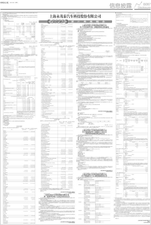 本公司董事会及全体董事保证本公告内容不存在任何虚假记载、误导性陈述或者重大遗漏,并对其内容的真实性、准确性和完整性承担法律责任。 重要内容提示: 公司董事会及董事、高级管理人员保证季度报告内容的真实、准确、完整,不存在虚假记载、误导性陈述或重大遗漏,并承担个别和连带的法律责任。 公司负责人、主管会计工作负责人及会计机构负责人(会计主管人员)保证季度报告中财务信息的真实、准确、完整。 第三季度财务报表是否经审计 □是 √否 一、主要财务数据 (一)主要会计数据和财务指标 单位:元 币种:人民币 ■ 注:“本报告期”指本季度初至本季度末3个月期间,下同。 1、年初至报告期末,公司开展员工持股计划产生的股份支付费用影响净利润 818.56 万元,扣除股份支付影响后的净利润为 5,836.08 万元。 2、年初至报告期末,公司经营活动产生的现金流量净额减少,主要系营业收入同比实现大幅增长,付现购买原材料备货金额大幅增加以及期末应收账款余额增加所致。 (二)非经常性损益项目和金额 √适用 □不适用 单位:元 币种:人民币 ■ 对公司将《公开发行证券的公司信息披露解释性公告第1号一一非经常性损益》未列举的项目认定为非经常性损益项目且金额重大的,以及将《公开发行证券的公司信息披露解释性公告第1号一一非经常性损益》中列举的非经常性损益项目界定为经常性损益的项目,应说明原因。 □适用 √不适用 (三)主要会计数据、财务指标发生变动的情况、原因 √适用 □不适用 ■ 二、股东信息 (一)普通股股东总数和表决权恢复的优先股股东数量及前十名股东持股情况表 单位:股 ■ 持股5%以上股东、前10名股东及前10名无限售流通股股东参与转融通业务出借股份情况 □适用 √不适用 前10名股东及前10名无限售流通股股东因转融通出借/归还原因导致较上期发生变化 □适用 √不适用 三、其他提醒事项 需提醒投资者关注的关于公司报告期经营情况的其他重要信息 □适用 √不适用 四、季度财务报表 (一)审计意见类型 □适用 √不适用 (二)财务报表 合并资产负债表 2025年9月30日 编制单位:上海永茂泰汽车科技股份有限公司 单位:元 币种:人民币 审计类型:未经审计 ■ ■ 公司负责人:徐宏主管会计工作负责人:范玥会计机构负责人:叶楚楚 合并利润表 2025年1一9月 编制单位:上海永茂泰汽车科技股份有限公司 单位:元 币种:人民币 审计类型:未经审计 ■ 公司负责人:徐宏主管会计工作负责人:范玥会计机构负责人:叶楚楚 合并现金流量表 2025年1一9月 编制单位:上海永茂泰汽车科技股份有限公司 单位:元 币种:人民币 审计类型:未经审计 ■ 公司负责人:徐宏主管会计工作负责人:范玥会计机构负责人:叶楚楚 2025年起首次执行新会计准则或准则解释等涉及调整首次执行当年年初的财务报表 □适用 √不适用 特此公告。 上海永茂泰汽车科技股份有限公司董事会 2025年10月28日 证券代码:605208 证券简称:永茂泰 公告编号:2025-069 上海永茂泰汽车科技股份有限公司 第三届董事会第十七次会议决议公告 本公司董事会及全体董事保证本公告内容不存在任何虚假记载、误导性陈述或者重大遗漏,并对其内容的真实性、准确性和完整性承担法律责任。 董事会会议召开情况 上海永茂泰汽车科技股份有限公司(以下简称“公司”)第三届董事会第十七次会议于2025年10月27日在上海市青浦区练塘镇章练塘路577号永茂泰公司会议室以现场结合通讯方式召开,会议通知和材料于2025年10月22日以电子邮件发送全体董事和高级管理人员。会议由董事长徐宏召集并主持,应出席董事9人,实际出席董事9人,全体高级管理人员列席会议。会议的召集和召开程序符合《公司法》和《公司章程》的规定,会议合法有效。 董事会会议审议情况 一、审议通过《2025年第三季度报告》。 详见2025年10月28日公司在《中国证券报》《上海证券报》《证券时报》《证券日报》和上海证券交易所网站www.sse.com.cn披露的《2025年第三季度报告》。 公司2025年第三季度报告的内容能够真实、准确、完整地反映公司的实际情况,不存在任何虚假记载、误导性陈述或重大遗漏,报告的编制和审议程序以及披露的内容和格式符合上海证券交易所的相关规定。 表决结果:同意9票,反对0票,弃权0票。 本议案事前已经审计委员会审议通过,审计委员会认为,公司2025年第三季度报告及摘要中的财务信息能够真实、准确、完整地反映公司的实际情况,不存在任何虚假记载、误导性陈述或重大遗漏。同意本报告并提交董事会审议。 二、审议通过《关于增加部分子公司担保额度的议案》。 详见2025年10月28日公司在《中国证券报》《上海证券报》《证券时报》《证券日报》和上海证券交易所网站www.sse.com.cn披露的《关于增加部分子公司担保额度的公告》。 表决结果:同意9票,反对0票,弃权0票。 三、审议通过《关于召开2025年第三次临时股东会的议案》。 详见2025年10月28日公司在《中国证券报》《上海证券报》《证券时报》《证券日报》和上海证券交易所网站www.sse.com.cn披露的《关于召开2025年第三次临时股东会的通知》和在上海证券交易所网站www.sse.com.cn披露的《2025年第三次临时股东会会议资料》。 表决结果:同意9票,反对0票,弃权0票。 特此公告。 上海永茂泰汽车科技股
