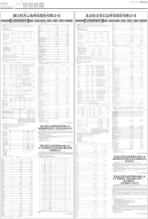 证券代码:301556 证券简称:托普云农 公告编号:2025-048 本公司及董事会全体成员保证信息披露的内容真实、准确、完整,没有虚假记载、误导性陈述或重大遗漏。 重要内容提示: 1.董事会及董事、高级管理人员保证季度报告的真实、准确、完整,不存在虚假记载、误导性陈述或重大遗漏,并承担个别和连带的法律责任。 2.公司负责人、主管会计工作负责人及会计机构负责人(会计主管人员)声明:保证季度报告中财务信息的真实、准确、完整。 3.第三季度财务会计报告是否经过审计 □是 √否 一、主要财务数据 (一) 主要会计数据和财务指标 公司是否需追溯调整或重述以前年度会计数据 □是 √否 ■ (二) 非经常性损益项目和金额 √适用 □不适用 单位:元 ■ 其他符合非经常性损益定义的损益项目的具体情况: □适用 √不适用 公司不存在其他符合非经常性损益定义的损益项目的具体情况。 将《公开发行证券的公司信息披露解释性公告第1号一一非经常性损益》中列举的非经常性损益项目界定为经常性损益项目的情况说明 □适用 √不适用 公司不存在将《公开发行证券的公司信息披露解释性公告第1号一一非经常性损益》中列举的非经常性损益项目界定为经常性损益的项目的情形。 (三) 主要会计数据和财务指标发生变动的情况及原因 √适用 □不适用 ■ 二、股东信息 (一) 普通股股东总数和表决权恢复的优先股股东数量及前十名股东持股情况表 单位:股 ■ 持股5%以上股东、前10名股东及前10名无限售流通股股东参与转融通业务出借股份情况 □适用 √不适用 前10名股东及前10名无限售流通股股东因转融通出借/归还原因导致较上期发生变化 □适用 √不适用 (二) 公司优先股股东总数及前10名优先股股东持股情况表 □适用 √不适用 (三) 限售股份变动情况 √适用 □不适用 单位:股 ■ 三、其他重要事项 □适用 √不适用 四、季度财务报表 (一) 财务报表 1、合并资产负债表 编制单位:浙江托普云农科技股份有限公司 2025年09月30日 单位:元 ■ 法定代表人:陈渝阳 主管会计工作负责人:朱娜 会计机构负责人:朱娜 2、合并年初到报告期末利润表 单位:元 ■ 本期发生同一控制下企业合并的,被合并方在合并前实现的净利润为:0.00元,上期被合并方实现的净利润为:0.00元。 法定代表人:陈渝阳 主管会计工作负责人:朱娜 会计机构负责人:朱娜 3、合并年初到报告期末现金流量表 单位:元 ■ (二) 2025年起首次执行新会计准则调整首次执行当年年初财务报表相关项目情况 □适用 √不适用 (三) 审计报告 第三季度财务会计报告是否经过审计 □是 √否 公司第三季度财务会计报告未经审计。 浙江托普云农科技股份有限公司董事会 2025年10月28日 证券代码:301556 证券简称:托普云农 公告编号:2025-046 浙江托普云农科技股份有限公司 第四届董事会第十七次会议决议公告 本公司及董事会全体成员保证信息披露的内容真实、准确、完整,没有虚假记载、误导性陈述或重大遗漏。 一、董事会会议召开情况 浙江托普云农科技股份有限公司(以下简称“公司”)第四届董事会第十七次会议于2025年10月27日在公司会议室以现场及通讯结合的方式召开,会议通知已于2025年10月24日以书面文件、电子邮件、微信、专人送达等方式送达全体董事。本次会议应出席董事7名,实际出席董事7名。本次会议由董事长陈渝阳先生主持,公司高级管理人员列席本次会议。本次会议的召开符合《中华人民共和国公司法》等有关法律法规、规范性文件和《公司章程》的规定,程序合法。 二、董事会会议审议情况 经与会董事认真讨论,审议并通过如下事项: 1、审议通过《关于公司2025年三季度报告的议案》 经审议,董事会认为公司编制的《2025年三季度报告》的内容和格式符合法律法规和中国证监会的规定,报告内容真实、准确、完整地反映了公司的实际情况,不存在任何虚假记载、误导性陈述或重大遗漏。 具体内容详见公司同日披露于巨潮资讯网(www.cninfo.com.cn)的《2025年三季度报告》(2025-048)。 表决结果:7票同意、0票反对、0票弃权。 该议案已经董事会审计委员会审议通过。 三、备查文件 1、第四届董事会第十七次会议决议; 2、第四届董事会审计委员会第八次会议决议。 特此公告。 浙江托普云农科技股份有限公司董事会 2025年10月28日 证券代码:301556 证券简称:托普云农 公告编号:2025-047 浙江托普云农科技股份有限公司 关于使用闲置自有资金进行现金管理的进展公告 本公司及董事会全体成员保证信息披露的内容真实、准确、完整,没有虚假记载、误导性陈述或重大遗漏。 浙江托普云农科技股份有限公司(以下简称“公司”)于2025年4月18日召开第四届董事会第十一次会议和第四届监事会第六次会议,审议通过了《关于使用闲置自有资金进行现金管理的议案》,同意在保证资金流动性和安全性的前提下,公司使用最高额度不超过10亿元、暂时闲置的自有资金进行现金管理,上述额度自股东会审议通过之日起12个月内有效,在前述额度和期限内,资金可以循环滚动使用。具体内容详见公司于2025年4月21日刊登在巨潮资讯网(www.cninfo.com.cn)上的《关于使用闲置自有资金进行现金管理的公告》(公告编号:2025-010)。 一、使用闲置自有资金进行现金管理的基本情况 截至2025年9月30日,公司暂未使用自有资