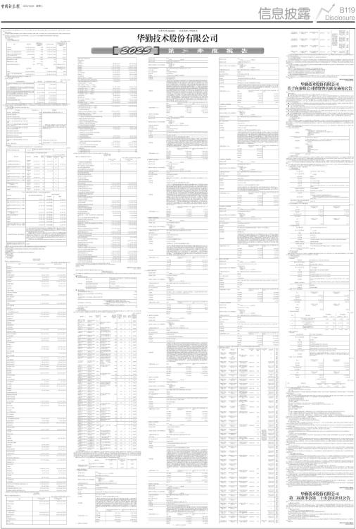 本公司董事会及全体董事保证本公告内容不存在任何虚假记载、误导性陈述或者重大遗漏,并对其内容的真实性、准确性和完整性承担法律责任。 重要内容提示: 公司董事会及董事、高级管理人员保证季度报告内容的真实、准确、完整,不存在虚假记载、误导性陈述或重大遗漏,并承担个别和连带的法律责任。 公司负责人、主管会计工作负责人及会计机构负责人(会计主管人员)保证季度报告中财务信息的真实、准确、完整。 第三季度财务报表是否经审计 □是 √否 一、主要财务数据 (一)主要会计数据和财务指标 单位:元币种:人民币 ■ 注:“本报告期”指本季度初至本季度末3个月期间,下同。 (二)非经常性损益项目和金额 √适用 □不适用 单位:元币种:人民币 ■ 对公司将《公开发行证券的公司信息披露解释性公告第1号一一非经常性损益》未列举的项目认定为非经常性损益项目且金额重大的,以及将《公开发行证券的公司信息披露解释性公告第1号一一非经常性损益》中列举的非经常性损益项目界定为经常性损益的项目,应说明原因。 □适用 √不适用 (三)主要会计数据、财务指标发生变动的情况、原因 √适用 □不适用 ■ 二、股东信息 (一)普通股股东总数和表决权恢复的优先股股东数量及前十名股东持股情况表 单位:股 ■ 持股5%以上股东、前10名股东及前10名无限售流通股股东参与转融通业务出借股份情况 □适用 √不适用 前10名股东及前10名无限售流通股股东因转融通出借/归还原因导致较上期发生变化 □适用 √不适用 三、其他提醒事项 需提醒投资者关注的关于公司报告期经营情况的其他重要信息 □适用 √不适用 四、季度财务报表 (一)审计意见类型 □适用 √不适用 (二)财务报表 合并资产负债表 2025年9月30日 编制单位:华勤技术股份有限公司 单位:元币种:人民币审计类型:未经审计 ■ 公司负责人:邱文生主管会计工作负责人:奚平华会计机构负责人:章子年 合并利润表 2025年1一9月 编制单位:华勤技术股份有限公司 单位:元币种:人民币审计类型:未经审计 ■ ■ 公司负责人:邱文生主管会计工作负责人:奚平华会计机构负责人:章子年 合并现金流量表 2025年1一9月 编制单位:华勤技术股份有限公司 单位:元币种:人民币审计类型:未经审计 ■ 公司负责人:邱文生主管会计工作负责人:奚平华会计机构负责人:章子年 2025年起首次执行新会计准则或准则解释等涉及调整首次执行当年年初的财务报表 □适用 √不适用 特此公告。 华勤技术股份有限公司董事会 2025年10月27日 证券代码:603296证券简称:华勤技术公告编号:2025-100 华勤技术股份有限公司 关于对外担保的进展公告 本公司董事会及全体董事保证本公告内容不存在任何虚假记载、误导性陈述或者重大遗漏,并对其内容的真实性、准确性和完整性承担法律责任。 重要内容提示: ● 担保对象及基本情况 ■ ● 累计担保情况 ■ 一、担保情况概述 (一)担保的基本情况 2025年第三季度,因申请银行贷款、银行承兑汇票、保函、履约担保和贸易融资等,华勤技术股份有限公司(以下简称“公司”)子公司合计签署165.16亿元担保协议。截至2025年9月30日,为全资子公司、控股子公司提供担保情况如下: 单位:人民币亿元 ■ (二)内部决策程序 公司分别于2025年4月23日召开了第二届董事会第十五次会议、2025年5月14日召开了2024年年度股东大会,审议通过了《关于2025年度对外担保预计的议案》,预计2025年年度公司为控股子公司提供担保、控股子公司间互相担保的总额不超过430亿元人民币,其中包含公司往期存续至2025年3月31日未到期对外担保余额244.66亿元人民币。股东大会批准授权公司董事长或董事长指定的授权代理人在上述担保总额范围内根据实际情况确定担保主体、担保方式、担保金额、调剂额度和具体担保内容等相关事宜,并签署相关各项法律文件,公司不再另行召开董事会或股东大会进行审议。具体内容详见公司披露的《华勤技术关于2025年度对外担保预计的公告》(公告编号:2025-034)。 截至2025年9月30日,公司担保金额均在公司审议通过的担保额度以内,担保额度使用情况如下: ■ 二、被担保人基本情况 (一)被担保人1基本情况 ■ (二)被担保人2基本情况 ■ (三)被担保人3基本情况 ■ (四)被担保人4基本情况 ■ (五)被担保人5基本情况 ■ (六)被担保人6基本情况 ■ (七)被担保人7基本情况 ■ (八)被担保人8基本情况 ■ (九)被担保人9基本情况 ■ (十)被担保人10基本情况 ■ (十一)被担保人11基本情况 ■ (十二)被担保人12基本情况 ■ (十三)被担保人13基本情况 ■ (十四)被担保人14基本情况 ■ (十五)被担保人15基本情况 ■ (十六)被担保人16基本情况 ■ 上述被担保人信用状况良好,不属于失信被执行人,不存在影响其偿债能力的重大或有事项。 三、担保协议的主要内容 ■ ■ 注1:应金融机构要求担保起始时间与其内部核准授信额度时间或首笔债权发生日相一致,或需涵盖未结清业务发生日,故导致担保起始时间不同于担保协议签署时间。 注2:广东东勤科技有限公司已于2025年9月8日更名为广东远图未来科技有限公司。 四、担保的必要性和合理性 以上对外担保系为满足公司及子公司的生产经营需要,有利于公司的稳健经营和长远发展,被担保人具备偿债能力。被担保对象运营状况稳健,资信记录良