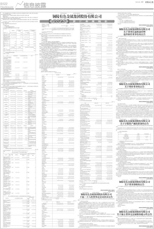 本公司及除董事朱明先生外的董事会全体成员保证信息披露的内容真实、准确、完整,没有虚假记载、误导性陈述或重大遗漏。 董事朱明先生因个人原因暂无法履职,不能保证公告内容真实、准确、完整。 重要内容提示: 1.董事会及除朱明先生外的董事、高级管理人员保证季度报告的真实、准确、完整,不存在虚假记载、误导性陈述或重大遗漏,并承担个别和连带的法律责任。 董事朱明先生因个人原因暂无法履职,无法保证季度报告内容的真实、准确、完整。请投资者特别关注。 2.公司负责人、主管会计工作负责人及会计机构负责人(会计主管人员)声明:保证季度报告中财务信息的真实、准确、完整。 3.第三季度财务会计报告是否经过审计 □是 √否 一、主要财务数据 (一) 主要会计数据和财务指标 公司是否需追溯调整或重述以前年度会计数据 □是 √否 ■ (二) 非经常性损益项目和金额 √适用 □不适用 单位:元 ■ 其他符合非经常性损益定义的损益项目的具体情况: □适用 √不适用 公司不存在其他符合非经常性损益定义的损益项目的具体情况。 将《公开发行证券的公司信息披露解释性公告第1号一一非经常性损益》中列举的非经常性损益项目界定为经常性损益项目的情况说明 □适用 √不适用 公司不存在将《公开发行证券的公司信息披露解释性公告第1号一一非经常性损益》中列举的非经常性损益项目界定为经常性损益的项目的情形。 (三) 主要会计数据和财务指标发生变动的情况及原因 √适用 □不适用 ■ 二、股东信息 (一) 普通股股东总数和表决权恢复的优先股股东数量及前十名股东持股情况表 单位:股 ■ ■ 持股5%以上股东、前10名股东及前10名无限售流通股股东参与转融通业务出借股份情况 □适用 √不适用 前10名股东及前10名无限售流通股股东因转融通出借/归还原因导致较上期发生变化 □适用 √不适用 (二) 公司优先股股东总数及前10名优先股股东持股情况表 □适用 √不适用 三、其他重要事项 √适用 □不适用 (一)定向可转债(铜陵定02)转股、赎回及摘牌情况 1.2023年7月12日,中国证券监督管理委员会核发了《关于同意铜陵有色金属集团股份有限公司发行股份和可转换公司债券购买资产并募集配套资金注册的批复》(证监许可〔2023〕1529号),同意公司发行可转换公司债券募集配套资金不超过214,600万元的注册申请。 2.根据中国证券登记结算有限责任公司深圳分公司(以下简称“中登公司”)出具的《证券初始登记确认书》,本次向特定对象发行可转换公司债券募集配套资金合计发行可转债21,460,000张,债券代码“124024”、债券简称“铜陵定02”,该等可转债已于2023年10月23日在中登公司完成了登记。存续期为自发行之日起6年,即2023年9月21日至2029年9月20日。 3.截至2025年9月30日,“铜陵定02”(债券代码:124024)已全部转换成公司无限售条件流通股,本次合计转股股数为670,587,109股。具体内容请见公司于2025年10月10日在巨潮资讯网披露的《关于2025年第三季度可转换公司债券转股情况的公告》。 4.“铜陵定02”于2025年9月4日触发有条件赎回条款。公司于当日召开十届二十四次董事会审议通过了《公司关于提前赎回“铜陵定02”的议案》。截至赎回登记日(2025年10月10日),“铜陵定02”已全部转股,本次赎回“铜陵定02”的数量为0张,本次赎回共计支付赎回款0.00元。具体内容请见公司于2025年10月17日在巨潮资讯网披露的《关于铜陵定02赎回结果的公告》。 5.自2025年10月17日起,“铜陵定02”在深圳证券交易所摘牌。具体内容请见公司于2025年10月17日在巨潮资讯网披露的《关于铜陵定02摘牌的公告》。 (二)仙人桥矿业关破清算有关事项 公司于2020年12月10日召开九届八次董事会会议,审议通过了《公司关于控股子公司停产及关破清算的议案》,鉴于句容市仙人桥矿业有限公司(以下简称“仙人桥矿业”)资源濒临枯竭,经济效益较差,短期内扭亏无望,为更好地促进矿山板块资源整合,减轻运营负担,维护公司及股东利益,公司董事会同意对控股子公司仙人桥矿业实施停产并关破清算,详细内容请见公司于2020年12月11日披露在巨潮资讯网上的《关于控股子公司停产及关破清算的提示性公告》。 根据公司前期收到的句容市人民法院《民事裁定书》,裁定受理申请人铜陵有色金属集团铜冠物资有限公司对被申请人句容市仙人桥矿业有限公司的破产清算申请;近期,公司收到句容市人民法院《决定书》,指定句容市仙人桥矿业有限公司清算组为仙人桥矿业破产清算管理人。目前,管理人正在根据有关规定开展仙人桥矿业破产清算工作。本事项对公司本年度财务状况、经营成果不会产生重大影响,具体以破产清算执行结果和会计师审计结果为准。 四、季度财务报表 (一) 财务报表 1、合并资产负债表 编制单位:铜陵有色金属集团股份有限公司 2025年09月30日 单位:元 ■ 法定代表人:主管会计工作负责人:会计机构负责人:_____________ 丁士启姚 兵 朱 敏 2、合并年初到报告期末利润表 单位:元 ■ ■ 法定代表人:主管会计工作负责人:会计机构负责人:_____________ 丁士启姚 兵 朱 敏 3、合并年初到报告期末现金流量表 单位:元 ■ 法定代表人:主管会计工作负责人:会计机构负责人:_____________ 丁士启姚 兵 朱 敏 (二) 2025年起首次执行新会计准则调整首次执行当年年初