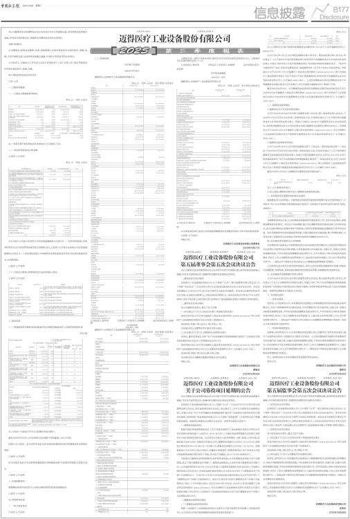 本公司董事会及全体董事保证本公告内容不存在任何虚假记载、误导性陈述或者重大遗漏,并对其内容的真实性、准确性和完整性依法承担法律责任。 重要内容提示: 公司董事会、监事会及董事、监事、高级管理人员保证季度报告内容的真实、准确、完整,不存在虚假记载、误导性陈述或重大遗漏,并承担个别和连带的法律责任。 公司负责人、主管会计工作负责人及会计机构负责人(会计主管人员)保证季度报告中财务信息的真实、准确、完整。 第三季度财务报表是否经审计 □是 √否 一、主要财务数据 (一)主要会计数据和财务指标 单位:元 币种:人民币 ■ 注:“本报告期”指本季度初至本季度末3个月期间,下同。 (二)非经常性损益项目和金额 √适用 □不适用 单位:元 币种:人民币 ■ 对公司将《公开发行证券的公司信息披露解释性公告第1号一一非经常性损益》未列举的项目认定为非经常性损益项目且金额重大的,以及将《公开发行证券的公司信息披露解释性公告第1号一一非经常性损益》中列举的非经常性损益项目界定为经常性损益的项目,应说明原因。 □适用 √不适用 (三)主要会计数据、财务指标发生变动的情况、原因 √适用 □不适用 ■ 二、股东信息 (一)普通股股东总数和表决权恢复的优先股股东数量及前十名股东持股情况表 单位:股 ■ 注:上述前十大股东中不含公司回购专用证券账户。 截至2025年9月30日,公司回购专用证券账户持股数量2,592,575股。 持股5%以上股东、前10名股东及前10名无限售流通股股东参与转融通业务出借股份情况 □适用 √不适用 前10名股东及前10名无限售流通股股东因转融通出借/归还原因导致较上期发生变化 □适用 √不适用 三、其他提醒事项 需提醒投资者关注的关于公司报告期经营情况的其他重要信息 □适用 √不适用 四、季度财务报表 (一)审计意见类型 □适用 √不适用 (二)财务报表 合并资产负债表 2025年9月30日 编制单位:迈得医疗工业设备股份有限公司 单位:元 币种:人民币 审计类型:未经审计 ■ 公司负责人:林军华 主管会计工作负责人:林君辉 会计机构负责人:林君辉 合并利润表 2025年1一9月 编制单位:迈得医疗工业设备股份有限公司 单位:元 币种:人民币 审计类型:未经审计 ■ 本期发生同一控制下企业合并的,被合并方在合并前实现的净利润为:0元, 上期被合并方实现的净利润为: 0 元。 公司负责人:林军华 主管会计工作负责人:林君辉 会计机构负责人:林君辉 合并现金流量表 2025年1一9月 编制单位:迈得医疗工业设备股份有限公司 单位:元 币种:人民币 审计类型:未经审计 ■ 公司负责人:林军华 主管会计工作负责人:林君辉 会计机构负责人:林君辉 2025年起首次执行新会计准则或准则解释等涉及调整首次执行当年年初的财务报表 □适用 √不适用 特此公告。 迈得医疗工业设备股份有限公司董事会 2025年10月27日 证券代码:688310 证券简称:迈得医疗 公告编号:2025-040 迈得医疗工业设备股份有限公司 第五届董事会第五次会议决议公告 本公司董事会及全体董事保证本公告内容不存在任何虚假记载、误导性陈述或者重大遗漏,并对其内容的真实性、准确性和完整性依法承担法律责任。 一、董事会会议召开情况 迈得医疗工业设备股份有限公司(以下简称“公司”)第五届董事会第五次会议(以下简称“本次会议”)于2025年10月27日以现场加通讯的方式在公司会议室召开。本次会议的通知已于2025年10月22日以电子邮件方式送达全体董事。本次会议由董事长林军华先生主持,应出席会议董事7人,实际出席会议董事7人。本次会议的召开符合《中华人民共和国公司法》等法律、行政法规以及《迈得医疗工业设备股份有限公司章程》的相关规定。 二、董事会会议审议情况 经与会董事审议表决,通过了如下议案: (一)审议通过了《关于公司2025年第三季度报告的议案》 具体内容详见公司于同日披露在上海证券交易所网站(www.sse.com.cn)的《迈得医疗工业设备股份有限公司2025年第三季度报告》。 表决结果:同意:7票;反对:0 票;弃权:0 票。 本议案已经公司董事会审计委员会审议通过。 (二)审议通过了《关于公司募投项目延期的议案》 经审议,董事会同意公司将“年产35台药械组合类智能装备扩建项目”达到预定可使用状态的时间从2025年11月调整至2026年11月。 具体内容详见公司于同日披露在上海证券交易所网站(www.sse.com.cn)的《迈得医疗工业设备股份有限公司关于公司募投项目延期的公告》(公告编号:2025-042)。 表决结果:同意:7票;反对:0票;弃权:0票。 本议案已经公司董事会战略决策委员会审议通过。 特此公告。 迈得医疗工业设备股份有限公司 董事会 2025年10月28日 证券代码:688310 证券简称:迈得医疗 公告编号:2025-042 迈得医疗工业设备股份有限公司 关于公司募投项目延期的公告 本公司董事会及全体董事保证本公告内容不存在任何虚假记载、误导性陈述或者重大遗漏,并对其内容的真实性、准确性和完整性依法承担法律责任。 迈得医疗工业设备股份有限公司(以下简称“公司”)于2025年10月27日召开第五届董事会第五次会议、第五届监事会第五次会议,审议通过了《关于公司募投项目延期的议案》,同意公司对“年产35台药械组合类智能装备扩建项目”达到预定可使用状态的日期进行延期。保荐机构广发