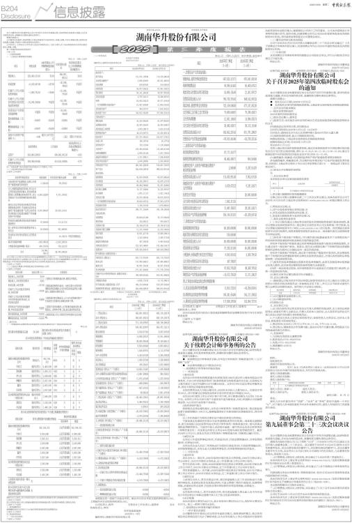本公司董事会及全体董事保证本公告内容不存在任何虚假记载、误导性陈述或者重大遗漏,并对其内容的真实性、准确性和完整性承担法律责任。 重要内容提示: 公司董事会及董事、高级管理人员保证季度报告内容的真实、准确、完整,不存在虚假记载、误导性陈述或重大遗漏,并承担个别和连带的法律责任。 公司负责人、主管会计工作负责人及会计机构负责人(会计主管人员)保证季度报告中财务信息的真实、准确、完整。 第三季度财务报表是否经审计 □是 √否 一、主要财务数据 (一)主要会计数据和财务指标 单位:元 币种:人民币 ■ 注:“本报告期”指本季度初至本季度末3个月期间,下同。 (二)非经常性损益项目和金额 √适用 □不适用 单位:元 币种:人民币 ■ 对公司将《公开发行证券的公司信息披露解释性公告第1号一一非经常性损益》未列举的项目认定为非经常性损益项目且金额重大的,以及将《公开发行证券的公司信息披露解释性公告第1号一一非经常性损益》中列举的非经常性损益项目界定为经常性损益的项目,应说明原因。 □适用 √不适用 (三)主要会计数据、财务指标发生变动的情况、原因 √适用 □不适用 ■ 二、股东信息 (一)普通股股东总数和表决权恢复的优先股股东数量及前十名股东持股情况表 单位:股 ■ 持股5%以上股东、前10名股东及前10名无限售流通股股东参与转融通业务出借股份情况 □适用 √不适用 前10名股东及前10名无限售流通股股东因转融通出借/归还原因导致较上期发生变化 □适用 √不适用 三、其他提醒事项 需提醒投资者关注的关于公司报告期经营情况的其他重要信息 □适用 √不适用 四、季度财务报表 (一)审计意见类型 □适用 √不适用 (二)财务报表 合并资产负债表 2025年9月30日 编制单位:湖南华升股份有限公司 单位:元 币种:人民币 审计类型:未经审计 ■ 公司负责人:谢平 主管会计工作负责人:梁勇军 会计机构负责人:李珂 合并利润表 2025年1一9月 编制单位:湖南华升股份有限公司 单位:元 币种:人民币 审计类型:未经审计 ■ 本期发生同一控制下企业合并的,被合并方在合并前实现的净利润为:0元, 上期被合并方实现的净利润为:0元。 公司负责人:谢平 主管会计工作负责人:梁勇军 会计机构负责人:李珂 合并现金流量表 2025年1一9月 编制单位:湖南华升股份有限公司 单位:元 币种:人民币 审计类型:未经审计 ■ 公司负责人:谢平 主管会计工作负责人:梁勇军 会计机构负责人:李珂 2025年起首次执行新会计准则或准则解释等涉及调整首次执行当年年初的财务报表 □适用 √不适用 特此公告。 湖南华升股份有限公司董事会 2025年10月28日 证券代码:600156 证券简称:华升股份 公告编号:临2025-049 湖南华升股份有限公司 关于续聘会计师事务所的公告 本公司董事会及全体董事保证本公告内容不存在任何虚假记载、误导性陈述或者重大遗漏,并对其内容的真实性、准确性和完整性承担法律责任。 重要内容提示: ● 拟续聘的会计师事务所名称:众华会计师事务所(特殊普通合伙)(以下简称“众华”) ● 本议案尚需提交公司股东会审议 一、拟续聘会计师事务所的基本情况 (一)机构信息 1.基本信息 众华会计师事务所(特殊普通合伙)的前身是1985年成立的上海社科院会计师事务所,于2013年经财政部等部门批准转制成为特殊普通合伙企业,注册地址为上海市嘉定工业区叶城路1630号5幢1088室。众华自1993年起从事证券服务业务,具有丰富的证券服务业务经验。 众华的首席合伙人为陆士敏先生,2024年末合伙人人数为68人,注册会计师共359人,其中签署过证券服务业务审计报告的注册会计师超过180人。 众华2024年度的上市公司审计客户共73家,审计收费总额为人民币9,193.46万元。众华的上市公司审计客户主要涉及行业为制造业,水利、环境和公共设施管理业等,与公司同行业的客户共48家。 2.投资者保护能力 按照相关法律法规的规定,众华会计师事务所(特殊普通合伙)购买职业保险累计赔偿限额20,000万元,能够覆盖因审计失败导致的民事赔偿责任,符合相关规定。 近三年在执业行为相关民事诉讼中承担民事责任的情况: 宁波圣莱达电器股份有限公司证券虚假陈述责任纠纷案:因圣莱达虚假陈述,浙江省高级人民法院等判决众华会计师事务所(特殊普通合伙)需与圣莱达承担连带赔偿责任,宁波市中级人民法院在最新一案中判决众华会计师事务所(特殊普通合伙)对圣莱达的偿付义务在40%范围内承担连带赔偿责任。截至2024年12月31日,涉及众华会计师事务所(特殊普通合伙)的赔偿已履行完毕。 3.诚信记录 众华近三年受到刑事处罚0次、行政处罚2次、行政监管措施4次、自律监管措施0次、纪律处分0次。 众华25名从业人员近三年因执业行为受到行政处罚3次、行政监管措施12次、自律监管措施3次,未有从业人员受到刑事处罚、自律监管措施和纪律处分。 (二)项目信息 1.基本信息 项目合伙人:周忠华,2008年取得中国注册会计师资格,2008年开始从事上市公司审计,2023年开始在众华执业,近三年签署1家上市公司审计报告。 签字注册会计师:张琪,2020年取得中国注册会计师资格,2020年开始从事上市公司审计,2023年开始在众华执业,近三年签署1家上市公司审计报告。 项目质量复核人:沈书豪,2008年取得中国注册会计师资格,2015年开始从事上市公司