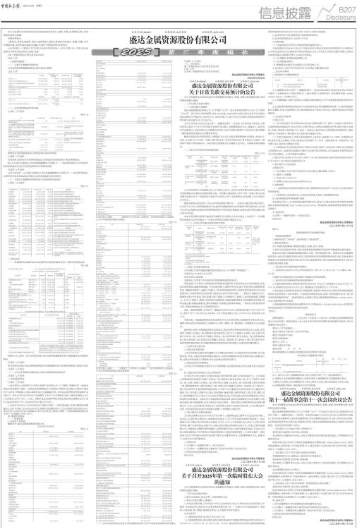 本公司及董事会全体成员保证信息披露的内容真实、准确、完整,没有虚假记载、误导性陈述或重大遗漏。 重要内容提示: 1.董事会、监事会及董事、监事、高级管理人员保证季度报告的真实、准确、完整,不存在虚假记载、误导性陈述或重大遗漏,并承担个别和连带的法律责任。 2.公司负责人、主管会计工作负责人及会计机构负责人(会计主管人员)声明:保证季度报告中财务信息的真实、准确、完整。 3.第三季度财务会计报告是否经过审计 □是 √否 一、主要财务数据 (一) 主要会计数据和财务指标 公司是否需追溯调整或重述以前年度会计数据 □是 √否 ■ (二) 非经常性损益项目和金额 √适用 □不适用 单位:元 ■ 其他符合非经常性损益定义的损益项目的具体情况: √适用 □不适用 本报告期,其他符合非经常性损益定义的损益项目系收到的个税手续费返还。 将《公开发行证券的公司信息披露解释性公告第1号一一非经常性损益》中列举的非经常性损益项目界定为经常性损益项目的情况说明 □适用 √不适用 公司不存在将《公开发行证券的公司信息披露解释性公告第1号一一非经常性损益》中列举的非经常性损益项目界定为经常性损益的项目的情形。 (三) 主要会计数据和财务指标发生变动的情况及原因 √适用 □不适用 单位:元 ■ 二、股东信息 (一) 普通股股东总数和表决权恢复的优先股股东数量及前十名股东持股情况表 单位:股 ■ 持股5%以上股东、前10名股东及前10名无限售流通股股东参与转融通业务出借股份情况 □适用 √不适用 前10名股东及前10名无限售流通股股东因转融通出借/归还原因导致较上期发生变化 □适用 √不适用 (二) 公司优先股股东总数及前10名优先股股东持股情况表 □适用 √不适用 三、其他重要事项 √适用 □不适用 1、报告期内,公司控股子公司四川鸿林矿业有限公司(以下简称“鸿林矿业”)收到木里县应急管理局下发的《木里县应急管理局关于同意四川鸿林矿业有限公司菜园子铜金矿矿山试生产的批复》,经查,鸿林矿业已完成基建任务,木里县应急管理局同意鸿林矿业试生产。详见公司于2025年9月3日披露的《关于子公司鸿林矿业矿山建设进展的公告》(公告编号:2025-049)。目前,鸿林矿业正按照国家相关规定及法律法规要求试生产运行,试运行时间3个月(2025年9月10日至12月10日)。 2、2025年9月25日,公司2024年员工持股计划第一个锁定期届满,本期可解锁股票数量为2,690,750股,占公司2024年员工持股计划总数的50%,占公司目前总股本的0.39%。详见公司于2025年9月25日披露的《关于2024年员工持股计划第一个锁定期届满的提示性公告》(公告编号:2025-055)。 四、季度财务报表 (一) 财务报表 1、合并资产负债表 编制单位:盛达金属资源股份有限公司 2025年09月30日 单位:元 ■ ■ 法定代表人:赵庆 主管会计工作负责人:孙延庆 会计机构负责人:孙延庆 2、合并年初到报告期末利润表 单位:元 ■ 法定代表人:赵庆 主管会计工作负责人:孙延庆 会计机构负责人:孙延庆 3、合并年初到报告期末现金流量表 单位:元 ■ (二) 2025年起首次执行新会计准则调整首次执行当年年初财务报表相关项目情况 □适用 √不适用 (三) 审计报告 第三季度财务会计报告是否经过审计 □是 √否 公司第三季度财务会计报告未经审计。 盛达金属资源股份有限公司董事会 2025年10月28日 证券代码:000603 证券简称:盛达资源 公告编号:2025-060 盛达金属资源股份有限公司 关于日常关联交易预计的公告 本公司及董事会全体成员保证信息披露的内容真实、准确、完整,没有虚假记载、误导性陈述或重大遗漏。 一、日常关联交易基本情况 (一)日常关联交易概述 盛达金属资源股份有限公司(以下简称“公司”)及合并报表范围内子公司(以下简称“子公司”)因日常生产经营需要,预计2025年度、2026年度与关联方发生各类日常关联交易总金额合计不超过15,280.00万元。2024年度,公司及子公司与关联方实际发生的各类日常关联交易总额为14,767.50万元。 公司于2025年10月27日召开第十一届董事会第十一次会议,以6票同意、0票反对、0票弃权审议通过了《关于日常关联交易预计的议案》,关联董事赵庆先生、赵敏女士、赵彦全先生回避表决。议案在提交公司董事会审议前,已经公司独立董事专门会议审议,独立董事一致同意将该议案提交公司董事会审议。 根据《深圳证券交易所股票上市规则》及公司《关联交易管理制度》的规定,连续12个月内,公司及子公司与同一关联人进行的交易(含本次关联交易)累计超过公司最近一期经审计净资产绝对值的5%,本次关联交易需提交公司股东大会审议,关联股东需回避表决。 (二)预计日常关联交易类别和金额 单位:万元 ■ 公司实际控制人为赵满堂先生,公司预计2025年、2026年日常关联交易的交易对方均为受赵满堂先生或其近亲属控制的企业。因关联人数量较多,预计与单一关联人发生交易金额未达到公司上一年度经审计净资产0.5%的,以同一实际控制人及其关联人为口径进行合并列示。 根据《深圳证券交易所上市公司自律监管指引第7号一一交易与关联交易》相关规定,公司及子公司与上述同受赵满堂先生或其近亲属控制的企业开展的日常关联交易,公司及子公司可以根据实际情况内部调剂使用相关日常关联交易额度,具体交易内容和