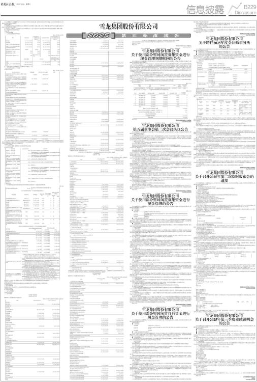 本公司董事会及全体董事保证本公告内容不存在任何虚假记载、误导性陈述或者重大遗漏,并对其内容的真实性、准确性和完整性承担法律责任。 重要内容提示: 公司董事会及董事、高级管理人员保证季度报告内容的真实、准确、完整,不存在虚假记载、误导性陈述或重大遗漏,并承担个别和连带的法律责任。 公司负责人、主管会计工作负责人及会计机构负责人(会计主管人员)保证季度报告中财务信息的真实、准确、完整。 第三季度财务报表是否经审计 □是√否 一、主要财务数据 (一)主要会计数据和财务指标 单位:元币种:人民币 ■ 注:“本报告期”指本季度初至本季度末3个月期间,下同。 (二)非经常性损益项目和金额 √适用□不适用 单位:元币种:人民币 ■ 对公司将《公开发行证券的公司信息披露解释性公告第1号一一非经常性损益》未列举的项目认定为非经常性损益项目且金额重大的,以及将《公开发行证券的公司信息披露解释性公告第1号一一非经常性损益》中列举的非经常性损益项目界定为经常性损益的项目,应说明原因。 □适用√不适用 (三)主要会计数据、财务指标发生变动的情况、原因 √适用 □不适用 ■ 二、股东信息 (一)普通股股东总数和表决权恢复的优先股股东数量及前十名股东持股情况表 单位:股 ■ 持股5%以上股东、前10名股东及前10名无限售流通股股东参与转融通业务出借股份情况 □适用√不适用 前10名股东及前10名无限售流通股股东因转融通出借/归还原因导致较上期发生变化 □适用√不适用 三、其他提醒事项 需提醒投资者关注的关于公司报告期经营情况的其他重要信息 □适用√不适用 四、季度财务报表 (一)审计意见类型 □适用√不适用 (二)财务报表 合并资产负债表 2025年9月30日 编制单位:雪龙集团股份有限公司 单位:元币种:人民币审计类型:未经审计 ■ ■ 公司负责人:贺财霖主管会计工作负责人:张家骅会计机构负责人:张家骅 合并利润表 2025年1一9月 编制单位:雪龙集团股份有限公司 单位:元币种:人民币审计类型:未经审计 ■ 本期发生同一控制下企业合并的,被合并方在合并前实现的净利润为:0元, 上期被合并方实现的净利润为:0元。 公司负责人:贺财霖主管会计工作负责人:张家骅会计机构负责人:张家骅 合并现金流量表 2025年1一9月 编制单位:雪龙集团股份有限公司 单位:元币种:人民币审计类型:未经审计 ■ 公司负责人:贺财霖主管会计工作负责人:张家骅会计机构负责人:张家骅 2025年起首次执行新会计准则或准则解释等涉及调整首次执行当年年初的财务报表 □适用√不适用 特此公告。 雪龙集团股份有限公司董事会 2025年10月27日 证券代码:603949 证券简称:雪龙集团 公告编号:2025-069 雪龙集团股份有限公司 关于使用部分暂时闲置募集资金进行现金管理到期赎回的公告 本公司董事会及全体董事保证本公告内容不存在任何虚假记载、误导性陈述或者重大遗漏,并对其内容的真实性、准确性和完整性依法承担法律责任。 雪龙集团股份有限公司(以下简称“公司”)于2024年10月28日分别召开第四届董事会第十六次会议及第四届监事会第十五次会议,审议通过《关于公司使用部分暂时闲置募集资金进行现金管理的议案》,同意公司使用不超过合计人民币1.5亿元(含1.5亿元)的暂时闲置募集资金进行现金管理,用于购买安全性高、流动性好、有保本约定的投资产品(包括但不限于结构性存款、大额存单等安全性高的保本型产品),使用期限自第四届董事会第十六次会议审议通过之日起12个月内。在上述额度及决议有效期内,资金可循环滚动使用。具体内容详见公司于2024年10月29日在上海证券交易所网站(www.sse.com.cn)及指定媒体披露的《雪龙集团股份有限公司关于使用部分暂时闲置募集资金进行现金管理的公告》(公告编号:2024-043)。 一、本次使用暂时闲置募集资金进行现金管理到期赎回的情况 公司于2024年11月13日使用闲置募集资金2,000万元向宁波银行股份有限公司认购了单位结构性存款7202404360产品,产品起息日为2024年11月14日,产品期限343天。具体内容详见公司于2024年11月14日在上海证券交易所网站(www.sse.com.cn)及指定媒体披露的《雪龙集团股份有限公司关于使用部分暂时闲置募集资金进行现金管理的进展公告》(公告编号:2024-049)。 该产品到期日为2025年10月23日,收益兑付日为2025年10月27日,公司已赎回本金2,000万元,公司获得理财收益总计38.53万元,收益符合预期。现对暂时闲置募集资金进行现金管理赎回情况及时披露。 赎回具体情况如下: 单位:万元 ■ 二、截至本公告日,公司最近十二个月使用闲置募集资金现金管理的情况 金额:万元 ■ 特此公告。 雪龙集团股份有限公司董事会 2025年10月28日 证券代码:603949 证券简称:雪龙集团 公告编号:2025-070 雪龙集团股份有限公司 第五届董事会第二次会议决议公告 本公司董事会及全体董事保证本公告内容不存在任何虚假记载、误导性陈述或者重大遗漏,并对其内容的真实性、准确性和完整性承担法律责任。 一、董事会会议召开情况 雪龙集团股份有限公司(以下简称“公司”)第五届董事会第二次会议于2025年10月27日在宁波市北仑区黄山西路211号公司会议室以现场结合通讯的会议方式召开,会议通知于2025年10月23日以专人送达、邮件等方式发出。本次会议由公司董