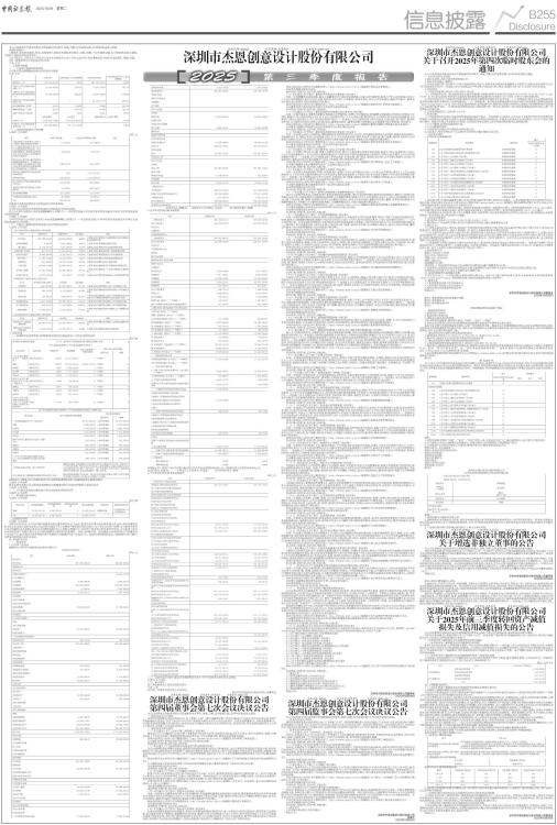 本公司及董事会全体成员保证信息披露的内容真实、准确、完整,没有虚假记载、误导性陈述或重大遗漏。 重要内容提示: 1.董事会、监事会及董事、监事、高级管理人员保证季度报告的真实、准确、完整,不存在虚假记载、误导性陈述或重大遗漏,并承担个别和连带的法律责任。 2.公司负责人、主管会计工作负责人及会计机构负责人(会计主管人员)声明:保证季度报告中财务信息的真实、准确、完整。 3.第三季度财务会计报告是否经过审计 □是 √否 一、主要财务数据 (一) 主要会计数据和财务指标 公司是否需追溯调整或重述以前年度会计数据 □是 √否 ■ (二) 非经常性损益项目和金额 √适用 □不适用 单位:元 ■ 其他符合非经常性损益定义的损益项目的具体情况: □适用 √不适用 公司不存在其他符合非经常性损益定义的损益项目的具体情况。 将《公开发行证券的公司信息披露解释性公告第1号一一非经常性损益》中列举的非经常性损益项目界定为经常性损益项目的情况说明 □适用 √不适用 公司不存在将《公开发行证券的公司信息披露解释性公告第1号一一非经常性损益》中列举的非经常性损益项目界定为经常性损益的项目的情形。 (三) 主要会计数据和财务指标发生变动的情况及原因 √适用 □不适用 ■ 二、股东信息 (一) 普通股股东总数和表决权恢复的优先股股东数量及前十名股东持股情况表 单位:股 ■ 持股5%以上股东、前10名股东及前10名无限售流通股股东参与转融通业务出借股份情况 □适用 √不适用 前10名股东及前10名无限售流通股股东因转融通出借/归还原因导致较上期发生变化 □适用 √不适用 (二) 公司优先股股东总数及前10名优先股股东持股情况表 □适用 √不适用 (三) 限售股份变动情况 √适用 □不适用 单位:股 ■ 三、其他重要事项 √适用 □不适用 2025年10月27日,公司召开第四届董事会独立董事第四次专门会议、董事会审计委员会2025年第五次会议、第四届董事会第七次会议及第四届监事会第七次会议审议通过《关于出售资产暨关联交易的议案》,为了优化公司资产结构,公司拟将全资子公司杰恩建筑100%股权以现金方式出售给持股5%以上的股东姜峰先生;在完成工商变更且相关条件符合后,公司拟将与设计业务相关的资产负债以现金方式出售给姜峰先生控制的杰恩建筑。经双方协商同意,杰恩建筑100%股权转让价款确定为1,574.89万元,拟出售设计业务相关的资产负债转让价款确定为19,844.32万元。本次交易构成关联交易,未构成重大资产重组。本事项尚需经股东会审议通过。 四、季度财务报表 (一) 财务报表 1、合并资产负债表 编制单位:深圳市杰恩创意设计股份有限公司 2025年09月30日 单位:元 ■ ■ 法定代表人:杨凯利 主管会计工作负责人:吕成业 会计机构负责人:敖倩 2、合并年初到报告期末利润表 单位:元 ■ 本期发生同一控制下企业合并的,被合并方在合并前实现的净利润为:元,上期被合并方实现的净利润为:元。 法定代表人:杨凯利 主管会计工作负责人:吕成业 会计机构负责人:敖倩 3、合并年初到报告期末现金流量表 单位:元 ■ (二) 2025年起首次执行新会计准则调整首次执行当年年初财务报表相关项目情况 □适用 √不适用 (三) 审计报告 第三季度财务会计报告是否经过审计 □是 √否 公司第三季度财务会计报告未经审计。 深圳市杰恩创意设计股份有限公司董事会 证券代码:300668 证券简称:杰恩设计 公告编号:2025-055 深圳市杰恩创意设计股份有限公司 第四届董事会第七次会议决议公告 本公司及董事会全体成员保证信息披露的内容真实、准确、完整,没有虚假记载、误导性陈述或重大遗漏。 一、董事会会议召开情况 深圳市杰恩创意设计股份有限公司(以下简称“公司”)第四届董事会第七次会议通知已于2025年10月24日通过电子邮件及其他通讯方式送达,会议于2025年10月27日以现场结合通讯方式在公司会议室召开。会议应出席董事7人,实际出席董事7人,公司监事及高级管理人员列席会议,本次会议由公司董事长高汴京先生召集和主持,会议的召集、召开和表决程序符合《公司法》等法律、法规和《公司章程》的规定。 二、董事会会议审议情况 (一)审议通过《关于〈2025年第三季度报告〉的议案》 董事会认为:公司编制的《2025年第三季度报告》全文符合法律、法规和中国证监会的有关规定,报告内容真实、准确、完整地反映了公司2025年第三季度的经营情况和财务状况,不存在虚假记载、误导性陈述或重大遗漏。 具体内容详见公司同日在巨潮资讯网上(http://www.cninfo.com.cn)披露的《2025年第三季度报告》。 公司董事会审计委员会2025年第五次会议审议通过此议案。 表决结果:同意7票,反对0票,弃权0票。 (二)审议通过《关于使用闲置自有资金进行现金管理的议案》 为充分利用阶段性闲置自有资金,提高自有资金使用效率,增加公司资金收益,为公司和股东获得较好的投资回报,同时在确保公司日常运营和资金安全的前提下,董事会同意使用不超过人民币25,000万元的闲置自有资金进行现金管理,该额度自股东会审议通过之日起12个月内有效,且单个产品的投资期限不超过12个月,在上述投资额度和期限范围内,资金可以循环滚动使用。 具体内容详见公司同日在巨潮资讯网上(http://www.cninfo.com.cn)披露的《关于使