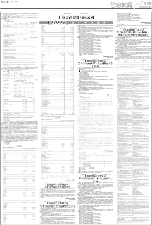 本公司董事会及全体董事保证本公告内容不存在任何虚假记载、误导性陈述或者重大遗漏,并对其内容的真实性、准确性和完整性承担法律责任。 重要内容提示: 公司董事会、监事会及董事、监事、高级管理人员保证季度报告内容的真实、准确、完整,不存在虚假记载、误导性陈述或重大遗漏,并承担个别和连带的法律责任。 公司负责人、主管会计工作负责人及会计机构负责人(会计主管人员)保证季度报告中财务信息的真实、准确、完整。 第三季度财务报表是否经审计 □是 √否 一、主要财务数据 (一)主要会计数据和财务指标 单位:元币种:人民币 ■ 注:“本报告期”指本季度初至本季度末3个月期间,下同。 (二)非经常性损益项目和金额 √适用 □不适用 单位:元币种:人民币 ■ 对公司将《公开发行证券的公司信息披露解释性公告第1号一一非经常性损益》未列举的项目认定为非经常性损益项目且金额重大的,以及将《公开发行证券的公司信息披露解释性公告第1号一一非经常性损益》中列举的非经常性损益项目界定为经常性损益的项目,应说明原因。 □适用 √不适用 (三)主要会计数据、财务指标发生变动的情况、原因 √适用 □不适用 ■ 二、股东信息 (一)普通股股东总数和表决权恢复的优先股股东数量及前十名股东持股情况表 单位:股 ■ 持股5%以上股东、前10名股东及前10名无限售流通股股东参与转融通业务出借股份情况 □适用 √不适用 前10名股东及前10名无限售流通股股东因转融通出借/归还原因导致较上期发生变化 □适用 √不适用 三、其他提醒事项 需提醒投资者关注的关于公司报告期经营情况的其他重要信息 √适用 □不适用 公司于2024年9月12日披露了《上海贵酒股份有限公司关于公司实际控制人被采取刑事强制措施的公告》(2024-064),公司实际控制人韩啸先生因海银财富管理有限公司涉嫌非法集资被公安机关采取刑事强制措施。据悉,目前韩啸先生所涉案件已按照集资诈骗案被公安机关移送至检察院审查起诉,韩啸先生仍处于羁押状态。公司于同日披露了《上海贵酒股份有限公司关于控股股东及其一致行动人的股份被司法冻结的公告》(2024-063),公司控股股东上海贵酒企业发展有限公司及其一致行动人合计持有公司216,740,245股已全部被司法冻结,占公司总股本的64.80%。 公司已于2025年1月25日、3月22日、4月12日在上海证券交易所网站(www.sse.com.cn)及公司指定信息披露媒体披露了《关于公司股票可能被实施退市风险警示的风险提示公告》(2025-004)、《关于公司股票可能被实施退市风险警示的第二次风险提示公告》(2025-010)及《关于公司股票可能被实施退市风险警示的第三次风险提示公告》(2025-013)。 因公司2024年度经审计的扣除非经常性损益前后的净利润低者为负值,且扣除与主营业务无关的业务收入和不具备商业实质的收入后的营业收入低于 3 亿元,触及《上海证券交易所股票上市规则》第 9.3.2 条第一款第(一)项规定,公司股票已于2025年4月23日被实施退市风险警示并在风险警示板交易,股票价格的日涨跌幅限制为“5%”。具体详见《上海贵酒股份有限公司关于公司股票停牌并实施退市风险警示的公告》(2025-022)。 公司于2025年7月15日及8月26日分别披露了《上海贵酒股份有限公司2025年半年度业绩预亏公告》(2025-037)和《上海贵酒股份有限公司2025年半年度报告》(2025-045),公司业绩变化的主要原因是:首先,报告期当期,白酒行业复苏未达预期,加之政策影响较大,行业整体承压。消费增长动能不足导致终端动销放缓,产品价格倒挂成为行业普遍现象。白酒产业仍处于去库存周期,产业向优势产区、优势企业、优势品牌集中的趋势明显,中小品牌酒企愈加受到挤压。公司亦受此行业环境的影响;其次,从2023年年末开始,受多方面因素影响,公司资金承压,返利返货无法兑现,市场投放减少。同时叠加公司实际控制人被公安机关采取强制措施和控股股东及其一致行动人所持公司股票被司法冻结等一系列事件影响,经销商关系受挫,对于补货、备货持更加审慎观望态度,导致公司营业收入持续下降;最后,2025年上半年公司陆续收到银行及供应商等诉讼,案件所涉逾期利息等费用增加,影响公司当期损益。 敬请广大投资者谨慎投资,注意投资风险。 四、季度财务报表 (一)审计意见类型 □适用 √不适用 (二)财务报表 合并资产负债表 2025年9月30日 编制单位:上海贵酒股份有限公司 单位:元币种:人民币审计类型:未经审计 ■ ■ 公司负责人:朱诺主管会计工作负责人:周苗会计机构负责人:周苗 合并利润表 2025年1一9月 编制单位:上海贵酒股份有限公司 单位:元币种:人民币审计类型:未经审计 ■ 本期发生同一控制下企业合并的,被合并方在合并前实现的净利润为:0元, 上期被合并方实现的净利润为:0元。 公司负责人:朱诺主管会计工作负责人:周苗会计机构负责人:周苗 合并现金流量表 2025年1一9月 编制单位:上海贵酒股份有限公司 单位:元币种:人民币审计类型:未经审计 ■ 公司负责人:朱诺主管会计工作负责人:周苗会计机构负责人:周苗 2025年起首次执行新会计准则或准则解释等涉及调整首次执行当年年初的财务报表 □适用 √不适用 特此公告。 上海贵酒股份有限公司董事会 2025年10月24日 证券代码:600696 证券简称:*ST岩石 公告编号:2025-049 上海贵酒股