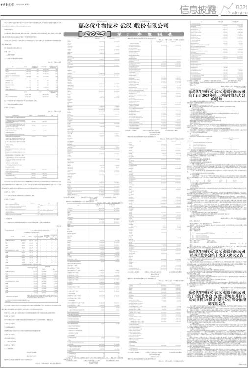 本公司董事会及全体董事保证本公告内容不存在任何虚假记载、误导性陈述或者重大遗漏,并对其内容的真实性、准确性和完整性依法承担法律责任。 重要内容提示: 公司董事会、监事会及董事、监事、高级管理人员保证季度报告内容的真实、准确、完整,不存在虚假记载、误导性陈述或重大遗漏,并承担个别和连带的法律责任。 公司负责人、主管会计工作负责人及会计机构负责人(会计主管人员)保证季度报告中财务信息的真实、准确、完整。 第三季度财务报表是否经审计 □是 √否 一、主要财务数据 (一)主要会计数据和财务指标 单位:元 币种:人民币 ■ 注:“本报告期”指本季度初至本季度末3个月期间,下同。 (二)非经常性损益项目和金额 √适用 □不适用 单位:元 币种:人民币 ■ 对公司将《公开发行证券的公司信息披露解释性公告第1号一一非经常性损益》未列举的项目认定为非经常性损益项目且金额重大的,以及将《公开发行证券的公司信息披露解释性公告第1号一一非经常性损益》中列举的非经常性损益项目界定为经常性损益的项目,应说明原因。 □适用 √不适用 (三)主要会计数据、财务指标发生变动的情况、原因 √适用 □不适用 ■ 二、股东信息 (一)普通股股东总数和表决权恢复的优先股股东数量及前十名股东持股情况表 单位:股 ■ 注:公司前10名股东及前10名无限售股东中有嘉必优生物技术(武汉)股份有限公司回购专用证券账户,截止报告期末持有公司股份1,504,586股,占公司总股本的0.89%。 持股5%以上股东、前10名股东及前10名无限售流通股股东参与转融通业务出借股份情况 □适用 √不适用 前10名股东及前10名无限售流通股股东因转融通出借/归还原因导致较上期发生变化 □适用 √不适用 三、其他提醒事项 需提醒投资者关注的关于公司报告期经营情况的其他重要信息 □适用 √不适用 四、季度财务报表 (一)审计意见类型 □适用 √不适用 (二)财务报表 合并资产负债表 2025年9月30日 编制单位:嘉必优生物技术(武汉)股份有限公司 单位:元 币种:人民币 审计类型:未经审计 ■ 公司负责人:易德伟 主管会计工作负责人:王华标 会计机构负责人:熊浩 合并利润表 2025年1一9月 编制单位:嘉必优生物技术(武汉)股份有限公司 单位:元 币种:人民币 审计类型:未经审计 ■ 本期发生同一控制下企业合并的,被合并方在合并前实现的净利润为:0元, 上期被合并方实现的净利润为: 0 元。 公司负责人:易德伟 主管会计工作负责人:王华标 会计机构负责人:熊浩 合并现金流量表 2025年1一9月 编制单位:嘉必优生物技术(武汉)股份有限公司 单位:元 币种:人民币 审计类型:未经审计 ■ 公司负责人:易德伟 主管会计工作负责人:王华标 会计机构负责人:熊浩 母公司资产负债表 2025年9月30日 编制单位:嘉必优生物技术(武汉)股份有限公司 单位:元 币种:人民币审计类型:未经审计 ■ 公司负责人:易德伟 主管会计工作负责人:王华标 会计机构负责人:熊浩 母公司利润表 2025年1一9月 编制单位:嘉必优生物技术(武汉)股份有限公司 单位:元 币种:人民币 审计类型:未经审计 ■ 公司负责人:易德伟 主管会计工作负责人:王华标 会计机构负责人:熊浩 母公司现金流量表 2025年1一9月 编制单位:嘉必优生物技术(武汉)股份有限公司 单位:元 币种:人民币 审计类型:未经审计 ■ 公司负责人:易德伟 主管会计工作负责人:王华标 会计机构负责人:熊浩 2025年起首次执行新会计准则或准则解释等涉及调整首次执行当年年初的财务报表 □适用 √不适用 特此公告。 嘉必优生物技术(武汉)股份有限公司董事会 2025年10月28日 证券代码:688089 证券简称:嘉必优 公告编号:2025-078 嘉必优生物技术(武汉)股份有限公司 关于召开2025年第二次临时股东大会的通知 本公司董事会及全体董事保证公告内容不存在任何虚假记载、误导性陈述或者重大遗漏,并对其内容的真实性、准确性和完整性依法承担法律责任。 重要内容提示: ● 股东大会召开日期:2025年11月18日 ● 本次股东大会采用的网络投票系统:上海证券交易所股东大会网络投票系统 一、召开会议的基本情况 (一)股东大会类型和届次 2025年第二次临时股东大会 (二)股东大会召集人:董事会 (三)投票方式:本次股东大会所采用的表决方式是现场投票和网络投票相结合的方式 (四)现场会议召开的日期、时间和地点 召开日期时间:2025年11月18日 14点00分 召开地点:武汉市东湖新技术开发区高科园三路89号公司会议室 (五)网络投票的系统、起止日期和投票时间。 网络投票系统:上海证券交易所股东大会网络投票系统 网络投票起止时间:自2025年11月18日 至2025年11月18日 采用上海证券交易所网络投票系统,通过交易系统投票平台的投票时间为股东大会召开当日的交易时间段,即9:15-9:25,9:30-11:30,13:00-15:00;通过互联网投票平台的投票时间为股东大会召开当日的9:15-15:00。 (六)融资融券、转融通、约定购回业务账户和沪股通投资者的投票程序 涉及融资融券、转融通业务、约定购回业务相关账户以及沪股通投资者的投票,应按照《上海证券交易所科创板上市公司自律监管指引第1号 一 规范运作》等有关规定执行。 (七)涉及公开征集股东投票权 无 二、会议审议事项 本次股东大会审议议案及投票股东类型 ■ 1、说明各议案已披露的时间和披露媒体 本