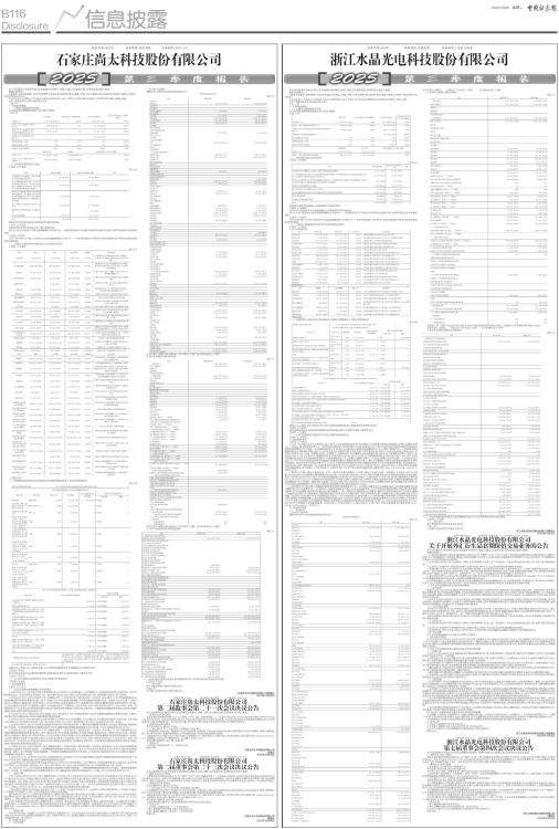 证券代码:002273 证券简称:水晶光电 公告编号:(2025)069号 本公司及董事会全体成员保证信息披露的内容真实、准确、完整,没有虚假记载、误导性陈述或重大遗漏。 重要内容提示: 1.董事会及董事、高级管理人员保证季度报告的真实、准确、完整,不存在虚假记载、误导性陈述或重大遗漏,并承担个别和连带的法律责任。 2.公司负责人、主管会计工作负责人及会计机构负责人(会计主管人员)声明:保证季度报告中财务信息的真实、准确、完整。 3.第三季度财务会计报告是否经过审计 □是 √否 一、主要财务数据 (一) 主要会计数据和财务指标 公司是否需追溯调整或重述以前年度会计数据 □是 √否 ■ (二) 非经常性损益项目和金额 √适用 □不适用 单位:元 ■ 其他符合非经常性损益定义的损益项目的具体情况: □适用 √不适用 公司不存在其他符合非经常性损益定义的损益项目的具体情况。 将《公开发行证券的公司信息披露解释性公告第1号一一非经常性损益》中列举的非经常性损益项目界定为经常性损益项目的情况说明 □适用 √不适用 公司不存在将《公开发行证券的公司信息披露解释性公告第1号一一非经常性损益》中列举的非经常性损益项目界定为经常性损益的项目的情形。 (三) 主要会计数据和财务指标发生变动的情况及原因 √适用 □不适用 1、资产负债表项目: ■ 2、利润表项目: ■ 二、股东信息 (一) 普通股股东总数和表决权恢复的优先股股东数量及前十名股东持股情况表 单位:股 ■ 持股5%以上股东、前10名股东及前10名无限售流通股股东参与转融通业务出借股份情况 □适用 √不适用 前10名股东及前10名无限售流通股股东因转融通出借/归还原因导致较上期发生变化 □适用 √不适用 (二) 公司优先股股东总数及前10名优先股股东持股情况表 □适用 √不适用 三、其他重要事项 √适用 □不适用 1、为进一步完善公司法人治理结构,建立、健全公司长效激励约束机制,充分调动公司管理者的积极性和创造性,经第六届董事会第三十一次会议、第六届监事会第二十一次会议及2025年第二次临时股东大会审议通过《关于〈浙江水晶光电科技股份有限公司2025年限制性股票激励计划(草案)〉及其摘要的议案》等,同意公司实施2025年限制性股票激励计划(以下简称“激励计划”)。本激励计划的激励对象为公司董事长李夏云女士1人,股份来源为公司股票回购专用证券账户中的股份50.00万股,占公司总股本的比例为0.04%,本次授予价格为10.07元/股。本激励计划为一次性授予,无预留权益。此次激励计划的有效期不超过48个月,自限制性股票授予完成日(即2025年8月5日)起12个月后分三期解除限售,锁定期分别为12个月、24个月、36个月,各期解除限售的比例分别为40%、30%、30%,同时对激励对象设置公司层面的业绩考核和个人绩效考核要求。公司经第六届董事会第三十三次会议和第六届监事会第二十三次会议审议通过了《关于向公司2025年限制性股票激励计划激励对象授予限制性股票的议案》,确定本次激励计划规定的限制性股票的授予条件已经成就,同意2025年7月23日为授予日,以10.07元/股的价格向符合条件的1名激励对象授予50.00万股限制性股票,相关股票已于2025年8月5日授予登记完成。以上具体事宜详见2025年7月5日、2025年7月15日、2025年7月22日、2025年7月24日、2025年8月6日披露于信息披露媒体《证券时报》《中国证券报》《上海证券报》《证券日报》和信息披露网站巨潮资讯网(http://www.cninfo.com.cn)上的相关公告。 2、根据公司《第八期员工持股计划(草案)》及相关法律法规规定,公司第八期员工持股计划第一批股票已于2025年10月16日届满,2025年10月17日为解锁日,解锁股数为30.00万股,占公司总股本的0.02%,本员工持股计划剩余45.00万股股票将按照相关规定继续锁定。具体事宜详见2025年10月15日的信息披露媒体《证券时报》《中国证券报》《上海证券报》《证券日报》和信息披露网站巨潮资讯网(www.cninfo.com.cn)上的相关公告;报告期内,公司第七期员工持股计划有1名持有人离职,按照相关规定,以原始出资强制收回其尚未解锁的2.40万股股票。截至本报告披露日,该员工持股计划163位持有人中共有9名持有人因离职或违纪被开除被取消参与资格,由公司以原始出资强制收回合计25.40万股股票,股票择机出售后剩余收益归公司所有。 3、报告期内,公司完成第七届董事会换届选举及聘任高管等相关工作。公司第七届董事会由12名董事组成,其中非独立董事7名,独立董事4名,职工代表董事1名。公司创始人、原董事长林敏先生基于公司长远发展考虑,为了有序推进管理层更替和平稳过渡,卸任董事长职务,由公司原董事、副总经理李夏云女士接任董事长一职。林敏先生仍继续担任公司董事、战略与可持续发展委员会主任委员、薪酬与考核委员会委员,其未来将聚焦于推进管理团队代际传承和人才梯队建设,同时支持推动公司长远战略布局、全球化进程及重大项目突破。与此同时,公司根据《中华人民共和国公司法》《上市公司章程指引(2025年修订)》《深圳证券交易所股票上市规则》等有关法律法规、规范性文件的最新规定,相应调整治理组织架构,废止《监事会议事规则》,原监事会的职权由董事会审计委员会承接,并及时修订了《公司章程》以及部分公司治理制度,确