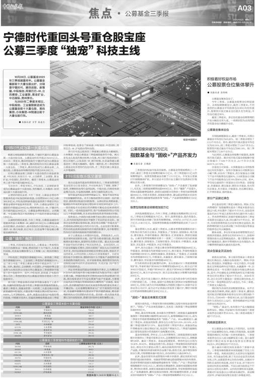 ● 本报记者 王鹤静 三季度国内权益市场表现强势,公募基金管理规模再上一个台阶,截至三季度末总规模突破35万亿元。在三季度超2万亿元的规模增量中,股票型指数基金贡献了1.01万亿元,不仅龙头宽基ETF规模继续扩张,多只成功卡位的行业主题ETF及债券ETF规模也实现大涨。 此外,三季度债市持续调整也为“固收+”产品提供了发展窗口,尤其是二级债基规模增加超4900亿元。多只“爆款”产品诞生,例如永赢稳健增强债券、景顺长城景颐丰利债券三季度均新增规模超200亿元,中欧丰利债券、富国裕利债券、睿远稳益增强30天持有债券、景顺长城稳健增益债券等“固收+”产品新增规模都在150亿元以上。 股票型指数基金规模增加超万亿 天相投顾数据显示,今年三季度,公募基金规模新增2.23万亿元,三季度末总规模超35万亿元。其中,股票型基金、混合型基金、货币市场型基金贡献了较多的规模增量,分别为1.14万亿元、0.58万亿元、0.46万亿元,仅股票型指数基金规模增量就达到了1.01万亿元。 基金管理人方面,截至三季度末,公募非货管理规模排名前十的机构分别为易方达基金、华夏基金、广发基金、富国基金、南方基金、嘉实基金、华泰柏瑞基金、博时基金、汇添富基金、景顺长城基金;公募非货管理规模排名第十一至第二十的机构分别为招商基金、鹏华基金、国泰基金、工银瑞信基金、华安基金、中欧基金、永赢基金、天弘基金、中银基金、兴证全球基金。 其中,易方达基金三季度公募非货管理规模新增超2500亿元,华夏基金、富国基金均新增超1500亿元,南方基金、华泰柏瑞基金均新增超1000亿元,景顺长城基金、国泰基金、广发基金、汇添富基金均新增超800亿元,中欧基金、永赢基金、嘉实基金、工银瑞信基金、鹏华基金、华安基金均新增超500亿元。 作为机构资金重仓配置的品种,龙头宽基ETF三季度规模继续扩张,华泰柏瑞沪深300ETF规模增加超500亿元,易方达沪深300ETF发起式、华夏沪深300ETF、嘉实沪深300ETF规模均增加超300亿元,南方中证500ETF、易方达创业板ETF规模均新增超200亿元。 此外,部分行业主题ETF、债券ETF已成为资金参与相关板块行情的重要工具。三季度,富国中证港股通互联网ETF规模增加超490亿元,目前已成为全市场规模最大的港股主题ETF;国泰中证全指证券公司ETF、易方达中证香港证券投资主题ETF、博时可转债ETF的新增规模也都在200亿元以上。 “固收+”基金迎来爆发式发展 值得注意的是,三季度在债市持续调整以及股市持续走强的背景下,“固收+”产品迎来发展窗口,尤其是二级债基三季度规模增加超4900亿元。 例如,基金经理高楠、余国豪共同管理的二级债基永赢稳健增强债券三季度规模大幅增至348.59亿元,新增规模超270亿元,成为三季度全市场新增规模最多的“固收+”产品。Wind数据显示,截至三季度末,该基金的股票、债券仓位分别为21.23%、82.10%,A份额三季度回报率为7.37%。基金经理在三季报中表示,该基金的运作策略基本以稳定债底打底,权益资产增强为主,三季度的超额收益主要靠权益部分的选股和行业配置来实现。 基金经理徐栋、李怡文、江山共同管理的二级债基景顺长城景颐丰利债券A三季度回报率近15%,总规模增至257.95亿元,规模暴增126倍。截至三季度末,该基金配置股票、债券的仓位分别为18.40%、90.42%。据基金经理介绍,该基金三季度维持较高的股票仓位,重仓方向主要是AI算力,减仓创新药的同时,增配了机器人产业链,并继续持有游戏和有色金属个股;债券方面,逐步增加债券组合久期,可转债整体偏中低仓位,持仓结构以大盘品种为主。 此外,基金经理华李成管理的中欧丰利债券、黄纪亮和刘兴旺管理的富国裕利债券、侯振新管理的睿远稳益增强30天持有债券、彭成军管理的景顺长城稳健增益债券等“固收+”产品三季度的新增规模都在150亿元以上,富国优化增强债券、景顺长城景颐双利债券、博时恒乐债券、景顺长城景盛双息收益债券、华安乾煜债券发起式、广发聚鑫债券、鹏华双债加利债券、博时稳健增利债券、汇添富双享回报债券等“固收+”产品三季度新增规模都在百亿元以上。