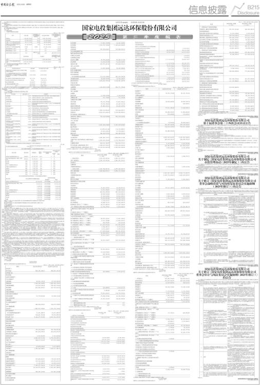 本公司董事会及全体董事保证本公告内容不存在任何虚假记载、误导性陈述或者重大遗漏,并对其内容的真实性、准确性和完整性承担法律责任。 重要内容提示: 公司董事会及董事、高级管理人员保证季度报告内容的真实、准确、完整,不存在虚假记载、误导性陈述或重大遗漏,并承担个别和连带的法律责任。 公司负责人陈斌、主管会计工作负责人黄樱及会计机构负责人(会计主管人员)李伟保证季度报告中财务信息的真实、准确、完整。 第三季度财务报表是否经审计 □是 √否 一、主要财务数据 (一)主要会计数据和财务指标 单位:元 币种:人民币 ■ 注:“本报告期”指本季度初至本季度末3个月期间,下同。 (二)非经常性损益项目和金额 √适用 □不适用 单位:元 币种:人民币 ■ 对公司将《公开发行证券的公司信息披露解释性公告第1号一一非经常性损益》未列举的项目认定为非经常性损益项目且金额重大的,以及将《公开发行证券的公司信息披露解释性公告第1号一一非经常性损益》中列举的非经常性损益项目界定为经常性损益的项目,应说明原因。 □适用 √不适用 (三)主要会计数据、财务指标发生变动的情况、原因 √适用 □不适用 ■ 二、股东信息 (一)普通股股东总数和表决权恢复的优先股股东数量及前十名股东持股情况表 单位:股 ■ 持股5%以上股东、前10名股东及前10名无限售流通股股东参与转融通业务出借股份情况 □适用 √不适用 前10名股东及前10名无限售流通股股东因转融通出借/归还原因导致较上期发生变化 □适用 √不适用 三、其他提醒事项 需提醒投资者关注的关于公司报告期经营情况的其他重要信息 √适用 □不适用 1.报告期内,公司召开第十届董事会第二十五次(临时)会议、第二十七次(临时)会议、第三十一次(临时)会议、第三十三次(临时)会议、2025年第三次(临时)股东大会,审议通过了关于重大资产重组的报告书(草案)、调整交易方案、签订补充协议等事项。2025年9月,公司收到中国证券监督管理委员会出具的《关于同意国家电投集团远达环保股份有限公司发行股份购买资产并募集配套资金注册的批复》(证监许可〔2025〕2191号),相关事项获正式批复。(上述事项详见2025年4月17日、6月10日、9月1日、9月17日、10月1日《上海证券报》、《中国证券报》)。 2.报告期内,经第十届董事会第三十次会议、公司2025年第四次(临时)股东大会审议通过,公司取消监事会,公司现任监事不再担任监事职务,由董事会审计与风险委员会行使《公司法》规定的监事会的职权。同时,根据《上市公司章程指引》等法律法规和规范性文件,结合公司实际情况,公司对《公司章程》及其附件《公司股东会议事规则》《公司董事会议事规则》进行了修订,全文已在上海证券交易所网站披露。(上述事项详见2025年8月30日、9月16日《上海证券报》、《中国证券报》)。 3.报告期内,公司参加了重庆市证监局、重庆市上市公司协会组织的重庆辖区2025年投资者网上集体接待日暨半年度业绩说明会活动,针对2025年半年度的经营成果及财务指标的具体情况、重大资产重组相关进展等与投资者进行了互动交流和沟通。(该事项详见2025年9月26日《上海证券报》、《中国证券报》)。 4.报告期内,经公司第十届董事会第三十一次(临时)会议审议通过了《关于公司经理层2024年度考核评价结果和绩效奖金分配方案的议案》,(该事项详见2025年9月1日《上海证券报》、《中国证券报》)。截至目前公司已按规定完成相应绩效奖金的发放。 5.报告期内,经公司第十届董事会第二十九次(临时)会议审议通过《关于审议远达环保参股与中煤西安公司合作成立合资公司的议案》,实施中煤集团所属燃煤电厂烟气治理特许经营业务和水岛治理特许经营业务。合资公司注册地在重庆,远达环保持股49%,中煤西安公司持股51%。合资公司初始注册资本金500万元,后续根据项目投资进度,适时将注册资本金增至1.2亿元,公司认缴5,880万元(初始出资245万元)(该事项详见2025年7月26日《上海证券报》、《中国证券报》)。截止目前,合资公司已完成工商注册登记。 6.报告期内,经第十届董事会第二十七次(临时)会议、第十届董事会第三十次会议、公司第四次(临时)股东大会审议,通过了《关于修订〈国家电投集团远达环保股份有限公司信息披露管理制度(2025年修订)〉的议案》《关于修订公司〈募集资金管理办法(2025年修订)〉的议案》。上述制度全文已在上海证券交易所网站披露。(该事项详见2025年6月10日、8月30日、9月16日《上海证券报》《中国证券报》)。 7.报告期内,经第十届董事会第二十七次(临时)会议审议通过,对董事会专门委员会委员组成进行调整及增补。公司调整现战略与投资委员会委员马天峰先生为审计与风险委员会委员;增补董事胡一栋先生为战略与投资委员会委员。经第十届董事会第三十三次(临时)会议审议通过,增补姚小彦先生为战略投资与可持续发展委员会委员(原战略与投资委员会)。薪酬与考核委员会、提名委员会人员组成情况未发生变化(该事项详见2025年6月10日、9月17日《上海证券报》《中国证券报》)。截至目前,董事会专门委员会的增补及调整工作已经全部完成。 8.报告期内,经第十届董事会第二十六次会议审议通过,根据财政部颁布的《关于印发〈企业会计准则解释