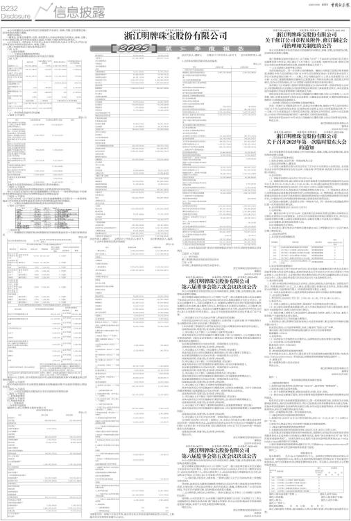 本公司及董事会全体成员保证信息披露的内容真实、准确、完整,没有虚假记载、误导性陈述或重大遗漏。 重要内容提示: 1.董事会、监事会及董事、监事、高级管理人员保证季度报告的真实、准确、完整,不存在虚假记载、误导性陈述或重大遗漏,并承担个别和连带的法律责任。 2.公司负责人、主管会计工作负责人及会计机构负责人(会计主管人员)声明:保证季度报告中财务信息的真实、准确、完整。 3.第三季度财务会计报告是否经过审计 □是 √否 一、主要财务数据 (一) 主要会计数据和财务指标 公司是否需追溯调整或重述以前年度会计数据 □是 √否 ■ (二) 非经常性损益项目和金额 √适用 □不适用 单位:元 ■ 其他符合非经常性损益定义的损益项目的具体情况: □适用 √不适用 公司不存在其他符合非经常性损益定义的损益项目的具体情况。 将《公开发行证券的公司信息披露解释性公告第1号一一非经常性损益》中列举的非经常性损益项目界定为经常性损益项目的情况说明 □适用 √不适用 公司不存在将《公开发行证券的公司信息披露解释性公告第1号一一非经常性损益》中列举的非经常性损益项目界定为经常性损益的项目的情形。 (三) 主要会计数据和财务指标发生变动的情况及原因 √适用 □不适用 ■ 二、股东信息 (一) 普通股股东总数和表决权恢复的优先股股东数量及前十名股东持股情况表 单位:股 ■ 持股5%以上股东、前10名股东及前10名无限售流通股股东参与转融通业务出借股份情况 □适用 √不适用 前10名股东及前10名无限售流通股股东因转融通出借/归还原因导致较上期发生变化 □适用 √不适用 (二) 公司优先股股东总数及前10名优先股股东持股情况表 □适用 √不适用 三、其他重要事项 □适用 √不适用 四、季度财务报表 (一) 财务报表 1、合并资产负债表 编制单位:浙江明牌珠宝股份有限公司 2025年09月30日 单位:元 ■ ■ 法定代表人:虞阿五 主管会计工作负责人:俞可飞 会计机构负责人:陈燕 2、合并年初到报告期末利润表 单位:元 ■ 本期发生同一控制下企业合并的,被合并方在合并前实现的净利润为:0.00元,上期被合并方实现的净利润为:0.00元。 法定代表人:虞阿五 主管会计工作负责人:俞可飞 会计机构负责人:陈燕 3、合并年初到报告期末现金流量表 单位:元 ■ (二) 2025年起首次执行新会计准则调整首次执行当年年初财务报表相关项目情况 □适用 √不适用 (三) 审计报告 第三季度财务会计报告是否经过审计 □是 √否 公司第三季度财务会计报告未经审计。 浙江明牌珠宝股份有限公司 董事会 2025年10月30日 证券代码:002574 证券简称:明牌珠宝 公告编号:2025-032 浙江明牌珠宝股份有限公司 第六届董事会第六次会议决议公告 本公司及董事会全体成员保证公告内容的真实、准确、完整,没有虚假记载、误导性陈述或重大遗漏。 浙江明牌珠宝股份有限公司(以下简称“公司”)第六届董事会第六次会议通知于2025年10月23日发出,会议于2025年10月28日以现场加通讯方式在公司召开。会议应出席董事七人,实际出席董事七人(副董事长虞豪华先生因行程原因委托董事长虞阿五先生出席,独立董事吕岩女士、林明波先生以通讯方式参加),公司监事、高级管理人员列席了会议。会议由公司董事长虞阿五先生主持,会议的召开符合《公司法》及《公司章程》的有关规定。会议以书面投票表决的形式审议并通过了如下议案: 一、审议通过《关于公司2025年第三季度报告的议案》 内容详见2025年10月30日公司披露在《证券时报》《证券日报》《中国证券报》及巨潮资讯网上的《2025年第三季度报告》。 《2025年第三季度报告》相关财务信息已经公司董事会审计委员会审议通过。 议案表决结果:同意7票;反对0票;弃权0票。 二、审议通过《关于修订〈公司章程〉及附件的议案》 具体内容详见公司同日披露在巨潮资讯网上的《公司章程》、《公司章程》修订对照表及附件《股东会议事规则》《董事会议事规则》《累积投票制度实施细则》《网络投票实施细则》。 本议案还需要提交公司2025年第一次临时股东大会审议。 议案表决结果:同意7票;反对0票;弃权0票。 三、审议通过《关于修订〈独立董事工作制度〉的议案》 具体内容详见公司同日披露在巨潮资讯网上的《独立董事工作制度》。 本议案还需要提交公司2025年第一次临时股东大会审议。 议案表决结果:同意7票;反对0票;弃权0票。 四、审议通过《关于修订〈对外担保制度〉的议案》 具体内容详见公司同日披露在巨潮资讯网上的《对外担保制度》。 本议案还需要提交公司2025年第一次临时股东大会审议。 议案表决结果:同意7票;反对0票;弃权0票。 五、审议通过《关于修订〈募集资金管理办法〉的议案》 具体内容详见公司同日披露在巨潮资讯网上的《募集资金管理办法》。 本议案还需要提交公司2025年第一次临时股东大会审议。 议案表决结果:同意7票;反对0票;弃权0票。 六、审议通过《关于修订公司部分治理制度的议案》 具体内容详见公司同日披露在巨潮资讯网上的相关治理制度。其中《关联交易内部决策制度》还需要提交公司2025年第一次临时股东大会审议。 议案表决结果:同意7票;反对0票;弃权0票。 七、审议通过《关于制定〈股份回购管理制度〉的议案》 具体内