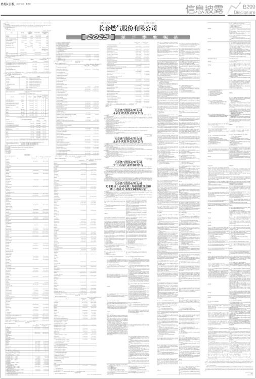 本公司董事会及全体董事保证本公告内容不存在任何虚假记载、误导性陈述或者重大遗漏,并对其内容的真实性、准确性和完整性承担法律责任。 重要内容提示: 公司董事会、监事会及董事、监事、高级管理人员保证季度报告内容的真实、准确、完整,不存在虚假记载、误导性陈述或重大遗漏,并承担个别和连带的法律责任。 公司负责人、主管会计工作负责人及会计机构负责人(会计主管人员)保证季度报告中财务信息的真实、准确、完整。 第三季度财务报表是否经审计 □是 √否 一、主要财务数据 (一)主要会计数据和财务指标 单位:元 币种:人民币 ■ 注:“本报告期”指本季度初至本季度末3个月期间,下同。 (二)非经常性损益项目和金额 √适用 □不适用 单位:元 币种:人民币 ■ 对公司将《公开发行证券的公司信息披露解释性公告第1号一一非经常性损益》未列举的项目认定为非经常性损益项目且金额重大的,以及将《公开发行证券的公司信息披露解释性公告第1号一一非经常性损益》中列举的非经常性损益项目界定为经常性损益的项目,应说明原因。 □适用 √不适用 (三)主要会计数据、财务指标发生变动的情况、原因 √适用 □不适用 ■ 二、股东信息 (一)普通股股东总数和表决权恢复的优先股股东数量及前十名股东持股情况表 单位:股 ■ 持股5%以上股东、前10名股东及前10名无限售流通股股东参与转融通业务出借股份情况 □适用 √不适用 前10名股东及前10名无限售流通股股东因转融通出借/归还原因导致较上期发生变化 □适用√不适用 三、其他提醒事项 需提醒投资者关注的关于公司报告期经营情况的其他重要信息 □适用 √不适用 四、季度财务报表 (一)审计意见类型 □适用 √不适用 (二)财务报表 合并资产负债表 2025年9月30日 编制单位:长春燃气股份有限公司 单位:元 币种:人民币 审计类型:未经审计 ■ 公司负责人:董志宇 主管会计工作负责人:张大海 会计机构负责人:李东辉 合并利润表 2025年1一9月 编制单位:长春燃气股份有限公司 单位:元 币种:人民币 审计类型:未经审计 ■ ■ 司负责人:董志宇 主管会计工作负责人:张大海 会计机构负责人:李东辉 合并现金流量表 2025年1一9月 编制单位:长春燃气股份有限公司 单位:元 币种:人民币 审计类型:未经审计 ■ 公司负责人:董志宇 主管会计工作负责人:张大海 会计机构负责人:李东辉 母公司资产负债表 2025年9月30日 编制单位:长春燃气股份有限公司 单位:元 币种:人民币 审计类型:未经审计 ■ 公司负责人:董志宇 主管会计工作负责人:张大海 会计机构负责人:李东辉 母公司利润表 2025年1一9月 编制单位:长春燃气股份有限公司 单位:元 币种:人民币审计类型:未经审计 ■ 公司负责人:董志宇 主管会计工作负责人:张大海 会计机构负责人:李东辉 母公司现金流量表 2025年1一9月 编制单位:长春燃气股份有限公司 单位:元 币种:人民币审计类型:未经审计 ■ 公司负责人:董志宇 主管会计工作负责人:张大海 会计机构负责人:李东辉 2025年起首次执行新会计准则或准则解释等涉及调整首次执行当年年初的财务报表 □适用 √不适用 特此公告。 长春燃气股份有限公司董事会 2025年10月28日 ·证券代码:600333 证券简称:长春燃气 公告编号:2025-019 长春燃气股份有限公司 九届十次董事会决议公告 本公司董事会及全体董事保证本公告内容不存在任何虚假记载、误导性陈述或者重大遗漏,并对其内容的真实性、准确性和完整性承担个别及连带责任。 一、董事会会议召开情况 长春燃气股份有限公司(以下简称“公司”)九届十次董事会于2025年10月28日在公司五楼会议室以现场结合通讯方式召开。会议应到董事10人,实际到会10人。公司监事、财务总监、董事会秘书列席了会议。会议由公司董事长董志宇主持。会议的召集召开符合《公司法》和《公司章程》相关要求,所作决议合法有效。 二、董事会会议审议情况 1、审议通过《公司2025年第三季度报告》 表决结果:同意10票,反对0票,弃权0票。 本议案已经董事会审计委员会审核通过。季度报告详见上海证券交易所网站(www.sse.com.cn)。 2、审议通过《关于修订〈公司章程〉及取消监事会的议案》 表决结果:同意10票,反对0票,弃权0票。 此议案需提交股东会审议。 3、审议通过《关于修订、废止公司部分制度的议案》 表决结果:同意10票,反对0票,弃权0票。 此议案需提交股东会审议。 议案2、议案3详细内容请见上海证券交易所网站(www.sse.com.cn)披露的《长春燃气关于修订〈公司章程〉及取消监事会和修订、废止部分制度的公告》(公告编号:2025-021)。 4、审议通过《关于补选公司董事的议案》 表决结果:同意10票,反对0票,弃权0票。 具体内容请见上海证券交易所网站(www.sse.com.cn)披露的《长春燃气关于补选公司董事的公告》(公告编号:2025-022)。 此议案需提交股东会审议。 5、审议通过《关于召开2025年第一次临时股东会的议案》 公司决定召开2025年第一次临时股东会,审议议案2、议案3及议案4相关内容,股东会会议通知另行公告。 表决结果:同意10票,反对0票,弃权0票。 长春燃气股份有限公司 董事会 2025年10月29日 证券代码:600333 证券简称:长春燃气 公告编号:2025-020 长春燃气股份有限公司 九届十次监事会决议公告 本公司监事会及全体监事保证本公告内容不