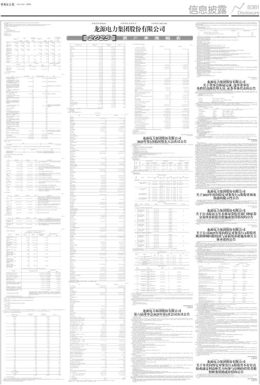 本公司及董事会全体成员保证信息披露的内容真实、准确、完整,没有虚假记载、误导性陈述或重大遗漏。 重要内容提示: 1.董事会及董事、高级管理人员保证季度报告的真实、准确、完整,不存在虚假记载、误导性陈述或重大遗漏,并承担个别和连带的法律责任。 2.公司负责人、主管会计工作负责人及会计机构负责人(会计主管人员)声明:保证季度报告中财务信息的真实、准确、完整。 3.第三季度财务会计报告是否经过审计 □是 √否 一、主要财务数据 (一) 主要会计数据和财务指标 公司是否需追溯调整或重述以前年度会计数据 √是 □否 追溯调整或重述原因 同一控制下企业合并 ■ (二) 非经常性损益项目和金额 √适用 □不适用 单位:元 ■ 其他符合非经常性损益定义的损益项目的具体情况: √适用 □不适用 ■ 将《公开发行证券的公司信息披露解释性公告第1号一一非经常性损益》中列举的非经常性损益项目界定为经常性损益项目的情况说明 √适用 □不适用 ■ (三) 主要会计数据和财务指标发生变动的情况及原因 √适用 □不适用 1、合并资产负债表项目 单位:元 ■ 2、合并利润表项目 单位:元 ■ 3、合并现金流量表项目 单位:元 ■ 二、股东信息 (一) 普通股股东总数和表决权恢复的优先股股东数量及前十名股东持股情况表 单位:股 ■ 持股5%以上股东、前10名股东及前10名无限售流通股股东参与转融通业务出借股份情况 □适用 √不适用 前10名股东及前10名无限售流通股股东因转融通出借/归还原因导致较上期发生变化 □适用 √不适用 (二) 公司优先股股东总数及前10名优先股股东持股情况表 □适用 √不适用 三、其他重要事项 √适用 □不适用 (一) 装机容量 2025年1-9月,本集团净新增新能源控股装机容量2,274.19兆瓦,其中新增风电控股装机容量1,134.70兆瓦、光伏控股装机容量1,169.49兆瓦,减少生物质发电控股装机容量30.00兆瓦。截至2025年9月30日,本集团控股装机容量为43,417.39兆瓦,其中风电31,543.47兆瓦,光伏11,867.82兆瓦,其他可再生能源6.10兆瓦。 截至2025年9月30日,本集团控股装机容量详情如下: ■ (二) 平均利用小时与发电量 2025年1-9月,本集团风电平均利用小时数为1,511小时,较2024年同期下降95小时,主要是因为风速同比下降。 截至2025年9月30日,本集团按合并报表口径累计完成发电量56,546,706兆瓦时,较2024年同期同比下降0.53%,剔除火电影响同比增长13.81%。其中,风电发电量46,187,944兆瓦时,较去年同期同比增长5.30%;光伏发电量10,354,443兆瓦时,较去年同期同比增长77.98%。 截至2025年9月30日,本集团2025年控股发电量详情如下: ■ 注:本公告中提供的数字经过整数调整,因此若总计数字与所列各项之和出现尾数差异,皆因整数调整所致。 四、季度财务报表 (一) 财务报表 1、合并资产负债表 编制单位:龙源电力集团股份有限公司 2025年09月30日 单位:元 ■ 法定代表人:宫宇飞 主管会计工作负责人:杨文静 会计机构负责人:刘勇 2、合并年初到报告期末利润表 单位:元 ■ 本期发生同一控制下企业合并的,被合并方在合并前实现的净利润为:5,273,690.22元,上期被合并方实现的净利润为:9,716,138.80元。 法定代表人:宫宇飞 主管会计工作负责人:杨文静 会计机构负责人:刘勇 3、合并年初到报告期末现金流量表 单位:元 ■ (二) 2025年起首次执行新会计准则调整首次执行当年年初财务报表相关项目情况 □适用 √不适用 (三) 审计报告 第三季度财务会计报告是否经过审计 □是 √否 公司第三季度财务会计报告未经审计。 龙源电力集团股份有限公司董事会 2025年10月29日 证券代码:001289 证券简称:龙源电力 公告编号:2025-060 龙源电力集团股份有限公司 2025年第1次临时股东大会决议公告 本公司及董事会全体成员保证信息披露内容真实、准确和完整,没有虚假记载、误导性陈述或者重大遗漏。 龙源电力集团股份有限公司(以下简称“公司”或“本公司”)已于2025年10月29日召开2025年第1次临时股东大会(以下简称“本次股东大会”或“本次会议”),有关本次股东大会的决议及表决情况如下: 一、特别提示 1.本次股东大会无其他新增议案,无变更、否决议案的情况。 2.本次股东大会不涉及变更以往股东大会已通过的决议。 二、会议召开情况 1. 会议召开方式:现场及网络投票相结合 2. 会议召开时间: (1)现场会议时间:2025年10月29日(星期三) (2)网络投票时间:2025年10月29日(星期三) 其中,通过深圳证券交易所交易系统进行的网络投票的具体时间为:2025年10月29日9:15-9:25,9:30-11:30,13:00-15:00 通过深圳证券交易所互联网投票系统投票的具体时间为:2025年10月29日9:15-15:00 3. 会议召开地点:北京市西城区阜成门北大街6号(c幢)3层会议室 4. 会议召集人:公司董事会 5. 会议主持人:公司董事长宫宇飞先生。 6. 本次会议的召开符合《中华人民共和国公司法》《上市公司股东会规则》等有关法律、行政法规、部门规章、规范性文件和《龙源电力集团股份有限公司章程》(以下简称“《公司章程》”)的规定。 三、本次会议出席情况 1.股东的出席情况 ■ 2.公司董事、监事和高级管理人员的出席情况 公司在任董事9人,出席7人,陈杰女士、张彤先生因公请假;在任监事3人,刘晋冀先生、郝静茹女士因公请假;高级管理人员杨文静女士、丁鶄女士、潘敏先生、史文义先生列席了本次会议。 四、提案审议