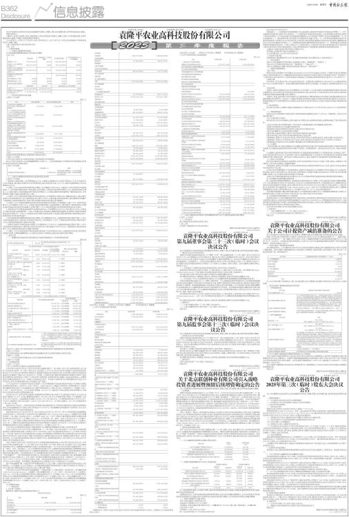 本公司及董事会全体成员保证信息披露的内容真实、准确、完整,没有虚假记载、误导性陈述或重大遗漏。 重要内容提示: 1.董事会、监事会及董事、监事、高级管理人员保证季度报告的真实、准确、完整,不存在虚假记载、误导性陈述或重大遗漏,并承担个别和连带的法律责任。 2.公司负责人、主管会计工作负责人及会计机构负责人(会计主管人员)声明:保证季度报告中财务信息的真实、准确、完整。 3.第三季度财务会计报告是否经过审计 □是 √否 一、主要财务数据 (一) 主要会计数据和财务指标 公司是否需追溯调整或重述以前年度会计数据 □是 √否 ■ (二) 非经常性损益项目和金额 √适用 □不适用 单位:元 ■ 其他符合非经常性损益定义的损益项目的具体情况: □适用 √不适用 公司不存在其他符合非经常性损益定义的损益项目的具体情况。 将《公开发行证券的公司信息披露解释性公告第1号一一非经常性损益》中列举的非经常性损益项目界定为经常性损益项目的情况说明 √适用 □不适用 ■ (三) 主要会计数据和财务指标发生变动的情况及原因 √适用 □不适用 1、营业收入本报告期比上年同期增加125.71%,主要系公司积极应对玉米种子市场供大于求、行业库存压力加大的挑战,通过强化市场研判与优化营销政策,加大市场开拓力度,公司子公司隆平发展销售收入同比逆势增加2.89亿元。 2、归属于上市公司股东的净利润本报告期较上年同期减少亏损14.80%,主要系以下两方面因素共同影响所致:(1)本报告期内隆平发展主营业务收入同比增加,主营业务毛利率同比增加7.39%,使得净利润同比增加;(2)本报告期内,在境外基准利率不断加息的情况下,公司通过银团贷款有效降低了整体融资成本,并有效控制汇率敞口风险,财务费用同比下降。 3、归属于上市公司股东的净利润年初至报告期末比上年同期增加亏损39.62%,剔除2024年公司转让隆平生物10.94%股权获得的3.4亿元投资收益,同比减亏18.60%,主要系通过组织结构优化、降本增效等举措提升了运营效率,同时财务费用同比显著下降,使得隆平发展经营业绩实现大幅减亏。 4、归属于上市公司股东的扣除非经常性损益的净利润本报告期比上年同期减少亏损11.77%、年初至报告期末比上年同期减少亏损19.85%,主要原因系报告期内得益于运营效率提升与财务费用下降等因素的共同驱动,隆平发展经营业绩实现大幅减亏,使得归属于上市公司股东的扣除非经常性损益的净利润同比减亏。 5、经营活动产生的现金流量净额年初至报告期末比上年同期增加10.85亿元,同比增长252.78%,主要系以下两方面因素共同影响所致:一方面,公司通过优化市场渠道,调整改革销售政策,销售商品、提供劳务收到的现金同比增加;另一方面,公司持续优化库存管理、组织结构及工作流程,提高运营效率,相应的购买商品、接受劳务支付的现金同比减少。 6、基本每股收益及稀释每股收益本报告期较上年同期增加23.64%,主要原因系本报告期内归属于上市公司的净利润同比减少亏损所致;年初至报告期末比上年同期减少31.16%,主要原因系年初至报告期末归属于上市公司股东的净利润同比增加亏损所致。 7、加权平均净资产收益率本报告期较上年同期增加3.77个百分点,主要原因系本报告期内归属于上市公司股东的净利润同比减少亏损所致;年初至报告期末比上年同期减少3.08个百分点,主要原因系本报告期内归属于上市公司股东的净利润同比增加亏损所致。 8、归属于上市公司股东的所有者权益本报告期末较上年度末增加20.16%,主要原因系本年度完成向特定对象发行股票、定增资金募集到位,公司总股本及资本公积增加,使得本报告期末净资产增加。 二、股东信息 (一) 普通股股东总数和表决权恢复的优先股股东数量及前十名股东持股情况表 单位:股 ■ 持股5%以上股东、前10名股东及前10名无限售流通股股东参与转融通业务出借股份情况 □适用 √不适用 前10名股东及前10名无限售流通股股东因转融通出借/归还原因导致较上期发生变化 □适用 √不适用 (二) 公司优先股股东总数及前10名优先股股东持股情况表 □适用 √不适用 三、其他重要事项 √适用 □不适用 1.关于公司向特定对象发行A股股票相关事项 公司分别于2024年8月5日、8月27日召开第九届董事会第十二次(临时)会议、第九届监事会第七次(临时)会议及2024年第一次(临时)股东大会,审议通过了《关于公司符合向特定对象发行A股股票条件的议案》和《关于公司2024年度向特定对象发行A股股票方案的议案》等相关议案,本次向特定对象发行股票的拟募集资金总额预计不超过120,000.00万元(含本数),扣除相关发行费用后的募集资金净额拟全部用于偿还银行贷款及补充流动资金,有助于公司优化资产负债结构、改善财务状况,增强公司高质量研发投入、运营发展及产业整合的资金实力,进一步提升公司种业龙头地位。本次发行认购对象为公司控股股东中信农业,为公司关联方,本次交易构成关联交易,不构成重大资产重组。 公司于2025年4月7日收到中国证监会出具的《关于同意袁隆平农业高科技股份有限公司向特定对象发行股票注册的批复》(证监许可〔2025〕700号)。2025年4月21日,天健会计师事务所(特殊普通合伙)对本次发行募集资金到达发行人本次募集资金专用账户的情况进行了审验,并出具