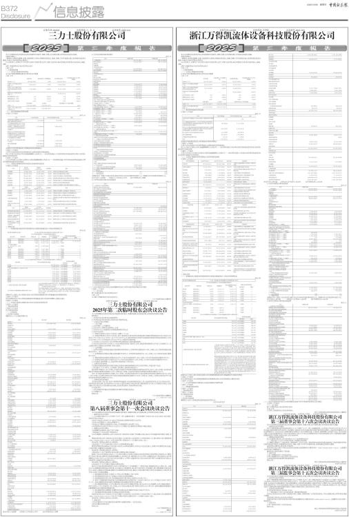 证券代码:002224 证券简称:三 力 士 公告编号:2025-041 三力士股份有限公司 本公司及董事会全体成员保证信息披露的内容真实、准确、完整,没有虚假记载、误导性陈述或重大遗漏。 重要内容提示: 1.董事会、监事会及董事、监事、高级管理人员保证季度报告的真实、准确、完整,不存在虚假记载、误导性陈述或重大遗漏,并承担个别和连带的法律责任。 2.公司负责人、主管会计工作负责人及会计机构负责人(会计主管人员)声明:保证季度报告中财务信息的真实、准确、完整。 3.第三季度财务会计报告是否经过审计 □是 √否 一、主要财务数据 (一) 主要会计数据和财务指标 公司是否需追溯调整或重述以前年度会计数据 □是 √否 ■ (二) 非经常性损益项目和金额 √适用 □不适用 单位:元 ■ 其他符合非经常性损益定义的损益项目的具体情况: □适用 √不适用 公司不存在其他符合非经常性损益定义的损益项目的具体情况。 将《公开发行证券的公司信息披露解释性公告第1号一一非经常性损益》中列举的非经常性损益项目界定为经常性损益项目的情况说明 □适用 √不适用 公司不存在将《公开发行证券的公司信息披露解释性公告第1号一一非经常性损益》中列举的非经常性损益项目界定为经常性损益的项目的情形。 (三) 主要会计数据和财务指标发生变动的情况及原因 √适用 □不适用 ■ 二、股东信息 (一) 普通股股东总数和表决权恢复的优先股股东数量及前十名股东持股情况表 单位:股 ■ 持股5%以上股东、前10名股东及前10名无限售流通股股东参与转融通业务出借股份情况 □适用 √不适用 前10名股东及前10名无限售流通股股东因转融通出借/归还原因导致较上期发生变化 □适用 √不适用 (二) 公司优先股股东总数及前10名优先股股东持股情况表 □适用 √不适用 三、其他重要事项 □适用 √不适用 四、季度财务报表 (一) 财务报表 1、合并资产负债表 编制单位:三力士股份有限公司 单位:元 ■ 法定代表人:吴琼瑛 主管会计工作负责人:何平 会计机构负责人:张卿 2、合并年初到报告期末利润表 单位:元 ■ 本期发生同一控制下企业合并的,被合并方在合并前实现的净利润为:元,上期被合并方实现的净利润为:元。 法定代表人:吴琼瑛 主管会计工作负责人:何平 会计机构负责人:张卿 3、合并年初到报告期末现金流量表 单位:元 ■ (二) 2025年起首次执行新会计准则调整首次执行当年年初财务报表相关项目情况 □适用 √不适用 (三) 审计报告 第三季度财务会计报告是否经过审计 □是 √否 公司第三季度财务会计报告未经审计。 三力士股份有限公司董事会 证券代码:002224 证券简称:三力士 公告编号:2025-040 三力士股份有限公司 2025年第二次临时股东会决议公告 本公司及董事会全体成员保证信息披露内容的真实、准确和完整,没有虚假记载、误导性陈述或重大遗漏。 特别提示: 1、本次股东会未出现否决议案的情形。 2、本次股东会未涉及变更以往股东会已通过的决议。 一、会议召开和出席情况 (一)召开情况 1、会议召集人:公司董事会 2、会议主持人:董事长吴琼瑛女士主持 3、会议召开方式:现场表决与网络投票相结合的方式 4、会议召开时间: (1)现场会议时间:2025年10月29日(星期三)14:00 (2)网络投票时间:2025年10月29日,其中,通过深圳证券交易所交易系统进行网络投票的具体时间为:2025年10月29日上午9:15至9:25,9:30至11:30,下午13:00至15:00;通过深圳证券交易所互联网投票系统投票的具体时间为:2025年10月29日上午9:15至2025年10月29日下午15:00期间的任意时间。 5、会议地点:公司会议室(绍兴市柯桥区柯岩街道高尔夫路凤凰创新园) 6、本次会议召开符合《公司法》《上市公司股东会规则》等法律、法规、规章和其他规范性文件及《公司章程》《三力士股份有限公司股东会议事规则》的有关规定。 (二)出席情况 1、出席本次股东会的股东及股东授权委托代表共280人,代表有表决权股份256,204,158股,占公司有表决股份总数的28.9652%。其中: (1)出席现场会议的股东及股东授权委托代表共3人,代表有表决权股份249,199,940股,占公司有表决股份总数的28.1734%。 (2)通过网络投票出席会议的股东共277人,代表有表决权股份7,004,218股,占公司有表决股份总数的0.7919%。 (3)出席本次股东会的中小股东共277人,代表有表决权股份7,004,218股,占公司有表决股份总数的0.7919%。 2、公司董事、高级管理人员、见证律师出席或列席了本次会议。 二、议案审议表决情况 与会股东及股东授权委托代表以现场记名投票与网络投票相结合的方式进行表决,并通过如下决议: 1、审议通过了《关于修订〈公司章程〉的议案》,具体表决情况如下: 表决结果:同意253,854,333股,占出席本次股东会有效表决权股份总数的99.0828%;反对1,900,625股,占出席本次股东会有效表决权股份总数的0.7418%;弃权449,200股,占出席本次股东会有效表决权股份总数的0.1753%。 其中,中小股东表决结果为:同意4,654,393股,占出席本次股东会中小股东有效表决权股份总数的66.4513%;反对1,900,625股,占出席本次股东会中小股东有效表决权股份总数的27.1354%;弃权449,200股,占出席本次股东会中小股东有效表决权股份总数的6.4133%。 三、律师出具的法律意见 本次股东会经上海广发(杭州)律师事务所陈重华、张钰栋律师现场见证,并出具法律意
