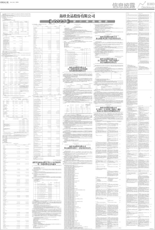 本公司及董事会全体成员保证信息披露的内容真实、准确、完整,没有虚假记载、误导性陈述或重大遗漏。 重要内容提示: 1.董事会、监事会及董事、监事、高级管理人员保证季度报告的真实、准确、完整,不存在虚假记载、误导性陈述或重大遗漏,并承担个别和连带的法律责任。 2.公司负责人、主管会计工作负责人及会计机构负责人(会计主管人员)声明:保证季度报告中财务信息的真实、准确、完整。 3.第三季度财务会计报告是否经过审计 □是 √否 一、主要财务数据 (一) 主要会计数据和财务指标 公司是否需追溯调整或重述以前年度会计数据 □是 √否 ■ (二) 非经常性损益项目和金额 √适用 □不适用 单位:元 ■ 其他符合非经常性损益定义的损益项目的具体情况: □适用 √不适用 公司不存在其他符合非经常性损益定义的损益项目的具体情况。 将《公开发行证券的公司信息披露解释性公告第1号一一非经常性损益》中列举的非经常性损益项目界定为经常性损益项目的情况说明 □适用 √不适用 公司不存在将《公开发行证券的公司信息披露解释性公告第1号一一非经常性损益》中列举的非经常性损益项目界定为经常性损益的项目的情形。 (三) 主要会计数据和财务指标发生变动的情况及原因 √适用 □不适用 ■ 二、股东信息 (一) 普通股股东总数和表决权恢复的优先股股东数量及前十名股东持股情况表 单位:股 ■ 持股5%以上股东、前10名股东及前10名无限售流通股股东参与转融通业务出借股份情况 □适用 √不适用 前10名股东及前10名无限售流通股股东因转融通出借/归还原因导致较上期发生变化 □适用 √不适用 (二) 公司优先股股东总数及前10名优先股股东持股情况表 □适用 √不适用 三、其他重要事项 □适用 √不适用 四、季度财务报表 (一) 财务报表 1、合并资产负债表 编制单位:海欣食品股份有限公司 2025年09月30日 单位:元 ■ 法定代表人:滕用庄 主管会计工作负责人:项金宏 会计机构负责人:许万明 2、合并年初到报告期末利润表 单位:元 ■ 本期发生同一控制下企业合并的,被合并方在合并前实现的净利润为:元,上期被合并方实现的净利润为:元。 法定代表人:滕用庄 主管会计工作负责人:项金宏 会计机构负责人:许万明 3、合并年初到报告期末现金流量表 单位:元 ■ (二) 2025年起首次执行新会计准则调整首次执行当年年初财务报表相关项目情况 □适用 √不适用 (三) 审计报告 第三季度财务会计报告是否经过审计 □是 √否 公司第三季度财务会计报告未经审计。 海欣食品股份有限公司董事会 2025年10月30日 证券代码:002702 证券简称:海欣食品 公告编号:2025-042 海欣食品股份有限公司关于召开2025年第一次临时股东会的通知 本公司及董事会全体成员保证信息披露内容的真实、准确和完整,没有虚假记载、误导性陈述或重大遗漏。 一、召开会议的基本情况 1、股东会届次:2025年第一次临时股东会 2、股东会的召集人:董事会 3、本次会议的召集、召开符合《中华人民共和国公司法》《深圳证券交易所股票上市规则》《深圳证券交易所上市公司自律监管指引第1号一一主板上市公司规范运作》等法律、行政法规、部门规章、规范性文件及《公司章程》的有关规定。 4、会议时间: (1)现场会议时间:2025年11月17日14:30 (2)网络投票时间:通过深圳证券交易所系统进行网络投票的具体时间为2025年11月17日9:15-9:25,9:30-11:30,13:00-15:00;通过深圳证券交易所互联网投票系统投票的具体时间为2025年11月17日9:15至15:00的任意时间。 5、会议的召开方式:现场表决与网络投票相结合。 6、会议的股权登记日:2025年11月10日 7、出席对象: (1)在股权登记日持有公司股份的普通股股东或其代理人; 于股权登记日下午收市时在中国结算深圳分公司登记在册的公司全体普通股股东均有权出席股东会,并可以以书面形式委托代理人出席会议和参加表决,该股东代理人不必是本公司股东(授权委托书模板详见附件2)。 (2)公司董事、监事和高级管理人员; (3)公司聘请的律师。 8、会议地点:福建省福州市仓山区建新北路150号海欣食品股份有限公司办公楼1楼会议室 二、会议审议事项 1、本次股东会提案编码表 ■ 2、披露情况 上述提案的具体内容已于2025年10月30日在公司指定的信息披露媒体《证券时报》《上海证券报》《中国证券报》和巨潮资讯网(www.cninfo.com.cn)披露。 3、以上提案2需逐项表决;公司本次股东会将对中小股东进行单独计票;上述提案1为特别决议事项,需经出席会议的股东(包括股东代理人)所持表决权的三分之二以上通过,提案2、提案3为普通决议事项,需经出席会议的股东(包括股东代理人)所持表决权的过半数通过。同一表决权只能选择现场、网络或其他表决方式中的一种。同一表决权出现重复表决的以第一次投票结果为准。 三、会议登记等事项 公司股东或股东代理人出席本次股东会现场会议的登记方法如下: 1、登记时间:2025年11月11日8:30-12:00,13:30-17:30。 2、登记地点:福建省福州市仓山区建新北路150号海欣食品股份有限公司办公楼4楼董事会办公室 3、拟出席本次股东会现场会议的股东或股东代理人应持以下文件办理登记: (1)自然人股东亲自出席的,应出示本人身份证或者其他能够表明其身份的有效证件或者证明。 自然人股东委托代理人出席的,代