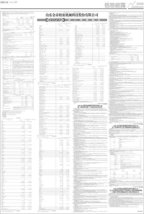 本公司董事会及全体董事保证本公告内容不存在任何虚假记载、误导性陈述或者重大遗漏,并对其内容的真实性、准确性和完整性承担法律责任。 重要内容提示: 公司董事会及董事、高级管理人员保证季度报告内容的真实、准确、完整,不存在虚假记载、误导性陈述或重大遗漏,并承担个别和连带的法律责任。 公司负责人、主管会计工作负责人及会计机构负责人(会计主管人员)保证季度报告中财务信息的真实、准确、完整。 第三季度财务报表是否经审计 □是 √否 一、主要财务数据 (一)主要会计数据和财务指标 单位:元 币种:人民币 ■ 注:“本报告期”指本季度初至本季度末3个月期间,下同。 (二)非经常性损益项目和金额 √适用 □不适用 单位:元 币种:人民币 ■ 对公司将《公开发行证券的公司信息披露解释性公告第1号一一非经常性损益》未列举的项目认定为非经常性损益项目且金额重大的,以及将《公开发行证券的公司信息披露解释性公告第1号一一非经常性损益》中列举的非经常性损益项目界定为经常性损益的项目,应说明原因。 □适用 √不适用 (三)主要会计数据、财务指标发生变动的情况、原因 √适用 □不适用 ■ 二、股东信息 (一)普通股股东总数和表决权恢复的优先股股东数量及前十名股东持股情况表 单位:股 ■ 持股5%以上股东、前10名股东及前10名无限售流通股股东参与转融通业务出借股份情况 □适用 √不适用 前10名股东及前10名无限售流通股股东因转融通出借/归还原因导致较上期发生变化 □适用 √不适用 三、其他提醒事项 需提醒投资者关注的关于公司报告期经营情况的其他重要信息 □适用 √不适用 四、季度财务报表 (一)审计意见类型 □适用 √不适用 (二)财务报表 合并资产负债表 2025年9月30日 编制单位:山东金帝精密机械科技股份有限公司 单位:元 币种:人民币 审计类型:未经审计 ■ 公司负责人:郑广会主管会计工作负责人:薛泰尧会计机构负责人:张丹丹 合并利润表 2025年1一9月 编制单位:山东金帝精密机械科技股份有限公司 单位:元 币种:人民币 审计类型:未经审计 ■ 公司负责人:郑广会主管会计工作负责人:薛泰尧会计机构负责人:张丹丹 合并现金流量表 2025年1一9月 编制单位:山东金帝精密机械科技股份有限公司 单位:元 币种:人民币 审计类型:未经审计 ■ 公司负责人:郑广会主管会计工作负责人:薛泰尧会计机构负责人:张丹丹 母公司资产负债表 2025年9月30日 编制单位:山东金帝精密机械科技股份有限公司 单位:元 币种:人民币 审计类型:未经审计 ■ 公司负责人:郑广会主管会计工作负责人:薛泰尧会计机构负责人:张丹丹 母公司利润表 2025年1一9月 编制单位:山东金帝精密机械科技股份有限公司 单位:元 币种:人民币审计类型:未经审计 ■ 公司负责人:郑广会主管会计工作负责人:薛泰尧会计机构负责人:张丹丹 母公司现金流量表 2025年1一9月 编制单位:山东金帝精密机械科技股份有限公司 单位:元 币种:人民币审计类型:未经审计 ■ 公司负责人:郑广会主管会计工作负责人:薛泰尧会计机构负责人:张丹丹 2025年起首次执行新会计准则或准则解释等涉及调整首次执行当年年初的财务报表 □适用 √不适用 特此公告。 山东金帝精密机械科技股份有限公司董事会 2025年10月30日 证券代码:603270 证券简称:金帝股份 公告编号:2025-091 山东金帝精密机械科技股份有限公司 第三届董事会第二十次会议决议公告 本公司董事会及全体董事保证本公告内容不存在任何虚假记载、误导性陈述或者重大遗漏,并对其内容的真实性、准确性和完整性承担法律责任。 一、董事会会议召开情况 山东金帝精密机械科技股份有限公司(以下简称“公司”)第三届董事会第二十次会议通知于2025年10月24日以通讯方式向全体董事发出。会议于2025年10月29日以现场结合通讯方式在公司会议室召开。本次会议由董事长郑广会主持,本次会议应出席会议董事9人,实际出席会议董事9人,高级管理人员列席会议。本次会议的召集、召开及表决程序符合《中华人民共和国公司法》《上海证券交易所股票上市规则》等相关法律、行政法规、规范性文件及《山东金帝精密机械科技股份有限公司章程》的有关规定。 二、董事会会议审议情况 经与会董事投票表决,审议通过了如下议案: (一)审议通过《关于公司2025年第三季度报告的议案》 根据《中华人民共和国证券法》《上市公司信息披露管理办法》《上海证券交易所股票上市规则》《上海证券交易所上市公司自律监管指南第1号一一公告格式》附件《第五十二号 上市公司季度报告》等有关规定,结合公司2025年第三季度相关运营情况及财务数据等信息,公司已编制完成了2025年第三季度报告。 表决结果:同意9票,反对0票,弃权0票。 本议案已经审计委员会审议通过,并提交董事会审议。 具体内容详见公司于同日在上海证券交易所网站(www.sse.com.cn)披露的《山东金帝精密机械科技股份有限公司2025年第三季度报告》。 (二)审议通过《关于公司2025年三季度利润分配方案的议案》 根据公司章程、《上市公司监管指引第3号一一上市公司现金分红(2023年修订)》等法律法规的有关规定,综合考虑公司未来的资金安排计划及发展规划,公司拟定2025年三季度利润分配方案为:拟以实施权益分派股权登记日登记的总股本