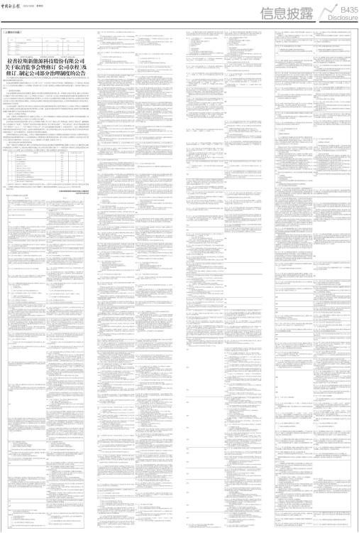 ■ 证券代码:688726 证券简称:拉普拉斯 公告编号:2025-038 拉普拉斯新能源科技股份有限公司 关于取消监事会暨修订《公司章程》及修订、制定公司部分治理制度的公告 本公司董事会及全体董事保证本公告内容不存在任何虚假记载、误导性陈述或者重大遗漏,并对其内容的真实性、准确性和完整性承担法律责任。 拉普拉斯新能源科技股份有限公司(以下称“公司”)于2025年10月28日召开第一届董事会第二十三次会议,审议通过了《关于取消监事会暨修订〈公司章程〉的议案》和《关于修订及制定公司部分治理制度的议案》。现将有关情况公告如下: 一、取消监事会情况 为全面贯彻落实最新法律法规要求,确保公司治理与监管规定保持同步,进一步规范公司运作机制,提升公司治理水平,根据《中华人民共和国公司法》(以下简称《公司法》)、《关于新〈公司法〉配套制度规则实施相关过渡期安排》和《上市公司章程指引》等法律、法规及规范性文件要求,公司拟对公司治理结构进行调整,取消监事会,由董事会审计委员会行使《公司法》规定的监事会职权,《监事会议事规则》等监事会相关制度相应废止,公司各项规章制度中涉及监事会、监事的规定不再适用。 公司现任监事(含监事会主席)将自公司股东大会审议通过取消监事会、监事并修订《公司章程》事项之日起解除职位。在公司股东大会审议通过取消监事会事项前,公司第一届监事会及监事仍将严格按照法律法规、规范性文件的要求继续履行职能,维护公司及全体股东的合法利益。 二、修订《公司章程》的情况 为进一步提升公司规范运作水平,根据《公司法》《上市公司章程指引》等相关法律法规、规范性文件的最新规定,并结合上述取消监事会事项,公司拟对《公司章程》进行修订。 因本次修订所涉及的条目较多,本次《公司章程》的修订中,关于“股东大会”的表述统一修改为“股东会”,整体删除原《公司章程》中“监事”、“监事会”相关表述并部分修改为“审计委员会成员”、“审计委员会”,将文字表述的数字如“2/3”修改为“三分之二”、“5%”修改为“百分之五”,在不涉及其他修订的前提下,不再逐项列示。此外,因删除和新增条款导致原有条款序号发生变化(包括引用的各条款序号),及个别用词造句变化、标点符号变化等,在不涉及实质内容改变的情况下,也不再逐项列示。具体修订内容对照详见附件。 本事项尚需股东大会审议通过。同时公司董事会提请股东大会授权公司管理层或其授权代表办理上述事项涉及的工商变更登记及备案等相关事宜,上述变更最终以工商登记机关核准的内容为准。修订后的《公司章程》全文详见公司于同日在上海证券交易所网站(www.sse.com.cn)披露的《公司章程(2025年10月)》。 三、修订及制定部分治理制度的情况 为进一步促进公司规范运作,维护公司及股东的合法权益,建立健全内部管理机制,根据《公司法》《上海证券交易所科创板股票上市规则》《上海证券交易所科创板上市公司自律监管指引第1号一一规范运作》等法律、法规及规范性文件的规定,结合《公司章程》及公司实际情况,公司修订和制定了部分治理制度,具体情况如下: ■ 上述序号1-3和序号11需提交公司股东大会审议,其中,上述序号1由原《股东大会议事规则》更名为《股东会议事规则》。上述修订后的部分制度全文详见公司同日披露于上海证券交易所网站(www.sse.com.cn)的相关文件。 特此公告。 拉普拉斯新能源科技股份有限公司董事会 2025年10月30日 附件:《公司章程》修订对照表 ■ ■ ■ ■ ■ ■ ■ ■ ■
