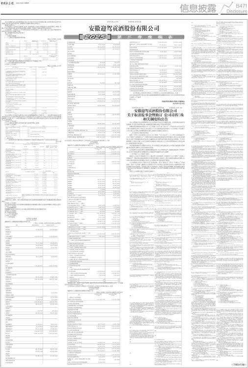 本公司董事会及全体董事保证本公告内容不存在任何虚假记载、误导性陈述或者重大遗漏,并对其内容的真实性、准确性和完整性承担法律责任。 重要内容提示: 公司董事会、监事会及董事、监事、高级管理人员保证季度报告内容的真实、准确、完整,不存在虚假记载、误导性陈述或重大遗漏,并承担个别和连带的法律责任。 公司负责人、主管会计工作负责人及会计机构负责人(会计主管人员)保证季度报告中财务信息的真实、准确、完整。 第三季度财务报表是否经审计 □是 √否 一、主要财务数据 (一)主要会计数据和财务指标 单位:元币种:人民币 ■ 注:“本报告期”指本季度初至本季度末3个月期间,下同。 (二)非经常性损益项目和金额 √适用 □不适用 单位:元币种:人民币 ■ 对公司将《公开发行证券的公司信息披露解释性公告第1号一一非经常性损益》未列举的项目认定为非经常性损益项目且金额重大的,以及将《公开发行证券的公司信息披露解释性公告第1号一一非经常性损益》中列举的非经常性损益项目界定为经常性损益的项目,应说明原因。 □适用 √不适用 (三)主要会计数据、财务指标发生变动的情况、原因 √适用 □不适用 ■ 二、股东信息 (一)普通股股东总数和表决权恢复的优先股股东数量及前十名股东持股情况表 单位:股 ■ 持股5%以上股东、前10名股东及前10名无限售流通股股东参与转融通业务出借股份情况 □适用 √不适用 前10名股东及前10名无限售流通股股东因转融通出借/归还原因导致较上期发生变化 □适用 √不适用 三、其他提醒事项 需提醒投资者关注的关于公司报告期经营情况的其他重要信息 □适用 √不适用 四、季度财务报表 (一)审计意见类型 □适用 √不适用 (二)财务报表 合并资产负债表 2025年9月30日 编制单位:安徽迎驾贡酒股份有限公司 单位:元币种:人民币审计类型:未经审计 ■■ 公司负责人:倪永培主管会计工作负责人:王亚会计机构负责人:王亚 合并利润表 2025年1一9月 编制单位:安徽迎驾贡酒股份有限公司 单位:元币种:人民币审计类型:未经审计 ■ 本期发生同一控制下企业合并的,被合并方在合并前实现的净利润为:0元, 上期被合并方实现的净利润为:0元。 公司负责人:倪永培主管会计工作负责人:王亚会计机构负责人:王亚 合并现金流量表 2025年1一9月 编制单位:安徽迎驾贡酒股份有限公司 单位:元币种:人民币审计类型:未经审计 ■ ■ 公司负责人:倪永培主管会计工作负责人:王亚会计机构负责人:王亚 2025年起首次执行新会计准则或准则解释等涉及调整首次执行当年年初的财务报表 □适用 √不适用 特此公告。 安徽迎驾贡酒股份有限公司董事会 2025年10月29日 证券代码:603198 证券简称:迎驾贡酒 公告编号:2025-020 安徽迎驾贡酒股份有限公司 关于取消监事会暨修订《公司章程》及相关制度的公告 本公司董事会及全体董事保证本公告内容不存在任何虚假记载、误导性陈述或者重大遗漏,并对其内容的真实性、准确性和完整性承担个别及连带责任。 安徽迎驾贡酒股份有限公司(以下简称“公司”或“本公司”)于2025年10月29日召开第五届董事会第十次会议,审议通过了《关于取消监事会并修订〈公司章程〉的议案》《关于修订公司部分治理制度的议案》,现将有关情况公告如下: 一、关于取消公司监事会情况 根据《中华人民共和国公司法》(以下简称“《公司法》”)、《上市公司章程指引》(以下简称“《章程指引》”)等相关法律法规及其他规范性文件的规定,结合公司实际情况,公司拟不再设置监事会与监事,由董事会审计委员会行使监事会的法定职权。于本次章程修订生效之日起,公司《监事会议事规则》相应废止,公司各项管理制度中涉及监事会、监事的条款不再适用。 本议案尚需提交公司股东会审议。在公司股东会审议通过前,公司第五届监事会仍将履行相应职责,维护公司及全体股东利益。 公司监事会全体监事在任职期间勤勉尽责,为公司规范运作、健康发展发挥了积极作用,公司对全体监事在任职期间为公司做出的贡献表示衷心感谢! 二、关于修订《公司章程》情况 根据《公司法》《章程指引》《上海证券交易所股票上市规则》(以下简称“《股票上市规则》”)等法律法规及规范性文件的相关规定,为适应上市公司规范治理运作需要,公司结合相关规定及实际情况,拟对《公司章程》相关条款进行修改: 《公司章程》中有关“股东大会”的表述统一改为“股东会”;有关“半数以上”的表述统一改为“过半数”;删除《公司章程》中关于监事会、监事相关内容,由董事会审计委员会履行监事会职责。其他修订系非实质性修订,如修订时因条款增删、顺序调整导致序号变动及引用的条款序号、段落格式、条款编号、标点符号等调整,前述变动不再在表中逐一列举。 本次《公司章程》修订的具体内容如下: ■ ■ ■ ■ ■ ■ ■ ■ 证券代码:603198 证券简称:迎驾贡酒 (下转B472版)