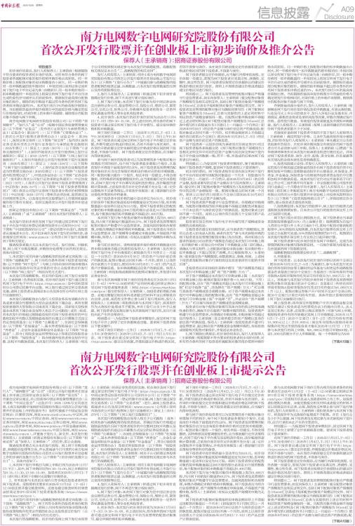 南方电网数字电网研究院股份有限公司(以下简称“发行人”、“南网数字”或“公司”)首次公开发行股票并在创业板上市申请已经深圳证券交易所(以下简称“深交所”) 上市委会议审议通过,并已经获得中国证券监督管理委员会(以下简称“中国证监会”)证监许可〔2025〕2295号文同意注册。《南方电网数字电网研究院股份有限公司首次公开发行股票并在创业板上市招股意向书》及附件披露于中国证监会指定网站(巨潮资讯网,网址www.cninfo.com.cn;中证网,网址www.cs.com.cn;中国证券网,网址www.cnstock.com;证券时报网,网址www.stcn.com;证券日报网,网址www.zqrb.cn;经济参考网,网址www.jjckb.cn;中国金融新闻网,网址www.financialnews.com.cn;中国日报网,网址www.chinadaily.com.cn),并置备于发行人、深交所、本次发行股票保荐人(主承销商)招商证券股份有限公司(以下简称“招商证券”或“保荐人(主承销商)”)的住所,供公众查阅。 敬请投资者重点关注本次发行流程、网上网下申购及缴款、弃购股份处理等方面,并认真阅读今日刊登的《南方电网数字电网研究院股份有限公司首次公开发行股票并在创业板上市初步询价及推介公告》(以下简称“《初步询价及推介公告》”)。具体内容如下: 1、本次网下发行申购日与网上申购日同为2025年11月7日(T日),其中,网下申购时间为9:30-15:00,网上申购时间为9:15-11:30,13:00-15:00。投资者在2025年11月7日(T日)进行网上和网下申购时无需缴付申购资金。 2、所有拟参与本次初步询价且符合相关投资者条件的网下投资者,须按照相关要求在2025年11月3日(T-4日)12:00前注册并提交核查材料,注册及提交核查材料时请登录招商证券IPO项目网下投资者服务系统(https://issue.cmschina.com/ipos)。 3、本次发行采用向参与战略配售的投资者定向配售(以下简称“战略配售”)、网下向符合条件的投资者询价配售(以下简称“网下发行”)和网上向持有深圳市场非限售A股股份或非限售存托凭证市值的社会公众投资者定价发行(以下简称“网上发行”)相结合的方式进行。 本次发行的战略配售、初步询价及网上网下发行由保荐人(主承销商)招商证券负责组织实施。初步询价及网下发行通过深交所的网下发行电子平台(https://eipo.szse.cn)及中国证券登记结算有限责任公司深圳分公司(以下简称“中国结算深圳分公司”)登记结算平台实施;网上发行通过深交所交易系统(以下简称“交易系统”)进行,请网上投资者认真阅读本公告及深交所网站(www.szse.cn)公布的《深圳市场首次公开发行股票网上发行实施细则》(深证上〔2018〕279号)(以下简称“《网上发行实施细则》”)。 本次发行的战略配售由保荐人相关子公司跟投(或有)和其他参与战略配售的投资者组成。若确定的发行价格超过剔除最高报价后网下投资者报价的中位数和加权平均数以及剔除最高报价后通过公开募集方式设立的证券投资基金(以下简称“公募基金”)、全国社会保障基金(以下简称“社保基金”)、基本养老保险基金(以下简称“养老金”)、企业年金基金和职业年金基金(以下简称“年金基金”)、符合《保险资金运用管理办法》等规定的保险资金(以下简称“保险资金”)和合格境外投资者资金报价中位数和加权平均数孰低值,本次发行的保荐人(主承销商)相关子公司招商证券投资有限公司(以下简称“招商投资”)将按照相关规定参与本次发行的战略配售。 发行人和保荐人(主承销商)将在《南方电网数字电网研究院股份有限公司首次公开发行股票并在创业板上市发行公告》(以下简称“《发行公告》”)中披露向参与战略配售的投资者配售的股票总量、认购数量、占本次发行股票数量的比例以及持有期限等信息。 4、发行人和保荐人(主承销商)将通过网下初步询价直接确定发行价格,网下不再进行累计投标询价。 5、网下发行对象:本次网下发行对象为经中国证券业协会注册的证券公司、基金管理公司、保险公司、理财公司、期货公司、信托公司、财务公司、合格境外投资者和符合一定条件的私募基金管理人等专业机构投资者。 6、初步询价:本次发行初步询价时间为2025年11月4日(T-3日)9:30-15:00。在上述时间内,符合条件的网下投资者可通过深交所网下发行电子平台为其管理的配售对象填写、提交申购价格和拟申购数量。 网下询价开始前一工作日(2025年11月3日,T-4日)上午8:30至询价日(2025年11月4日,T-3日)当日上午9:30前,网下投资者应通过深交所网下发行电子平台提交定价依据,并填写建议价格或价格区间,否则不得参与本次询价。未在询价开始前提交定价依据和建议价格或价格区间的网下投资者,不得参与询价。网下投资者提交定价依据前,应当履行内部审批流程。 参与网下询价的投资者可以为其管理的多个配售对象分别填报不同的报价,每个网下投资者最多填报3个报价,且最高报价不得高于最低报价的120%。网下投资者及其管理的配售对象报价应当包含每股价格和该价格对应的拟申购股数,同一配售对象只能有一个报价。相关申报一经提交,不得全部撤销。因特殊原因需要调整报价的,应当重新履行定价决策程序,在网下发行电子平台填写具说明改价理由、改价幅度的逻辑计算依据、之前报价是否存在定价依据不充分及(或)定价决策程序不完备等情况,并将改价依据及(或)重新履行定价决策程序等资料存档备查