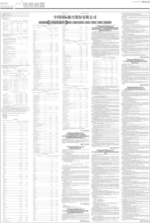 本公司董事会及全体董事保证本公告内容不存在任何虚假记载、误导性陈述或者重大遗漏,并对其内容的真实性、准确性和完整性承担法律责任。 重要内容提示: 公司董事会及董事、高级管理人员保证季度报告内容的真实、准确、完整,不存在虚假记载、误导性陈述或重大遗漏,并承担个别和连带的法律责任。 公司负责人、主管会计工作负责人及会计机构负责人(会计主管人员)保证季度报告中财务信息的真实、准确、完整。 第三季度财务报表是否经审计 □是 √否 一、主要财务数据 (一)主要会计数据和财务指标 单位:千元 币种:人民币 ■ 注:“本报告期”指本季度初至本季度末3个月期间,下同。 (二)非经常性损益项目和金额 √适用 □不适用 单位:千元 币种:人民币 ■ 对公司将《公开发行证券的公司信息披露解释性公告第1号一一非经常性损益》未列举的项目认定为非经常性损益项目且金额重大的,以及将《公开发行证券的公司信息披露解释性公告第1号一一非经常性损益》中列举的非经常性损益项目界定为经常性损益的项目,应说明原因。 □适用 √不适用 (三)主要会计数据、财务指标发生变动的情况、原因 √适用 □不适用 ■ 二、股东信息 (一)普通股股东总数和表决权恢复的优先股股东数量及前十名股东持股情况表 单位:股 ■ 1、香港中央结算(代理人)有限公司是香港联合交易所下属子公司,其主要业务为以代理人身份代其他公司或个人股东持有股票。其持有本公司股份数量中不包含代中航有限持有的166,852,000股。 2、依据《境内证券市场转持部分国有股充实全国社会保障基金实施办法》(财企〔2009〕94号)和财政部、国务院国有资产监督管理委员会、中国证监会、全国社会保障基金理事会公告(2009年第63号)规定,公司控股股东中航集团公司和中航有限分别持有的127,445,536和36,454,464股股份目前处于冻结状态。 持股5%以上股东、前10名股东及前10名无限售流通股股东参与转融通业务出借股份情况 □适用 √不适用 前10名股东及前10名无限售流通股股东因转融通出借/归还原因导致较上期发生变化 □适用 √不适用 三、其他提醒事项 需提醒投资者关注的关于公司报告期经营情况的其他重要信息 □适用 √不适用 四、季度财务报表 (一)审计意见类型 □适用 √不适用 (二)财务报表 合并资产负债表 2025年9月30日 编制单位:中国国际航空股份有限公司 单位:千元 币种:人民币 审计类型:未经审计 ■ 公司负责人:刘铁祥主管会计工作负责人:孙玉权 会计机构负责人:白冬明 合并利润表 2025年1-9月 编制单位:中国国际航空股份有限公司 单位:千元 币种:人民币 审计类型:未经审计 ■ 本期发生同一控制下企业合并的,被合并方在合并前实现的净利润为:0元, 上期被合并方实现的净利润为:0元。 公司负责人:刘铁祥主管会计工作负责人:孙玉权 会计机构负责人:白冬明 合并现金流量表 2025年1-9月 编制单位:中国国际航空股份有限公司 单位:千元 币种:人民币 审计类型:未经审计 ■ 公司负责人:刘铁祥主管会计工作负责人:孙玉权 会计机构负责人:白冬明 母公司资产负债表 2025年9月30日 编制单位:中国国际航空股份有限公司 单位:千元 币种:人民币 审计类型:未经审计 ■ ■ 公司负责人:刘铁祥主管会计工作负责人:孙玉权 会计机构负责人:白冬明 母公司利润表 2025年1-9月 编制单位:中国国际航空股份有限公司 单位:千元 币种:人民币 审计类型:未经审计 ■ 公司负责人:刘铁祥主管会计工作负责人:孙玉权 会计机构负责人:白冬明 母公司现金流量表 2025年1-9月 编制单位:中国国际航空股份有限公司 单位:千元 币种:人民币 审计类型:未经审计 ■ 公司负责人:刘铁祥主管会计工作负责人:孙玉权 会计机构负责人:白冬明 2025年起首次执行新会计准则或准则解释等涉及调整首次执行当年年初的财务报表 □适用 √不适用 特此公告。 中国国际航空股份有限公司董事会 2025年10月30日 证券代码:601111 股票简称:中国国航 公告编号:2025-052 中国国际航空股份有限公司 关于本次向特定对象发行A股股票 不存在直接或通过利益相关方向参与认购的投资者提供财务资助或补偿的公告 本公司及董事会全体董事保证本公告内容不存在任何虚假记载、误导性陈述或者重大遗漏,并对其内容的真实性、准确性和完整性承担法律责任。 中国国际航空股份有限公司(以下简称“公司”)于2025年10月30日召开公司第七届董事会第九次会议,审议通过了关于公司2025年度向特定对象发行A股股票事项的相关议案。现就公司2025年度向特定对象发行A股股票不存在直接或通过利益相关方向认购方提供财务资助或补偿事宜承诺如下: 公司不存在向参与认购的投资者作出保底保收益或变相保底保收益承诺的情形,不存在直接或间接通过利益相关方向参与认购的投资者提供财务资助或补偿的情形。 特此公告。 中国国际航空股份有限公司董事会 中国北京,二〇二五年十月三十日 证券代码:601111 股票简称:中国国航 公告编号:2025-055 中国国际航空股份有限公司 持续关联交易公告 本公司董事会及全体董事保证本公告内容不存在任何虚假记载、误导性陈述或者重大遗漏,并对其内容的真实性、准确性和完整性承担法律责任。 重要内容提示: ● 本次关联交易无需提交公司股东会审议。 ● 本次关联交易均