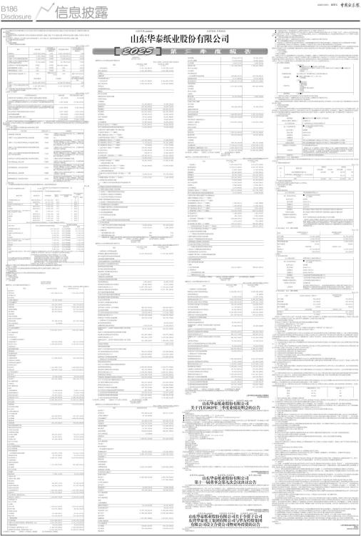本公司董事会及全体董事保证本公告内容不存在任何虚假记载、误导性陈述或者重大遗漏,并对其内容的真实性、准确性和完整性承担法律责任。 重要内容提示: 公司董事会及董事、高级管理人员保证季度报告内容的真实、准确、完整,不存在虚假记载、误导性陈述或重大遗漏,并承担个别和连带的法律责任。 公司负责人、主管会计工作负责人及会计机构负责人(会计主管人员)保证季度报告中财务信息的真实、准确、完整。 第三季度财务报表是否经审计 □是√否 一、主要财务数据 (一)主要会计数据和财务指标 单位:元币种:人民币 ■ 注:“本报告期”指本季度初至本季度末3个月期间,下同。 (二)非经常性损益项目和金额 √适用 □不适用 单位:元币种:人民币 ■ 对公司将《公开发行证券的公司信息披露解释性公告第1号一一非经常性损益》未列举的项目认定为非经常性损益项目且金额重大的,以及将《公开发行证券的公司信息披露解释性公告第1号一一非经常性损益》中列举的非经常性损益项目界定为经常性损益的项目,应说明原因。 □适用 √不适用 (三)主要会计数据、财务指标发生变动的情况、原因 √适用 □不适用 ■ 二、股东信息 (一)普通股股东总数和表决权恢复的优先股股东数量及前十名股东持股情况表 单位:股 ■ 持股5%以上股东、前10名股东及前10名无限售流通股股东参与转融通业务出借股份情况 □适用 √不适用 前10名股东及前10名无限售流通股股东因转融通出借/归还原因导致较上期发生变化 □适用√不适用 三、其他提醒事项 需提醒投资者关注的关于公司报告期经营情况的其他重要信息 □适用 √不适用 四、季度财务报表 (一)审计意见类型 □适用√不适用 (二)财务报表 合并资产负债表 2025年9月30日 编制单位:山东华泰纸业股份有限公司 单位:元币种:人民币审计类型:未经审计 ■ 公司负责人:李晓亮 主管会计工作负责人:陈国营 会计机构负责人:张淑真 合并利润表 2025年1一9月 编制单位:山东华泰纸业股份有限公司 单位:元币种:人民币审计类型:未经审计 ■ 本期发生同一控制下企业合并的,被合并方在合并前实现的净利润为:0元, 上期被合并方实现的净利润为:0元。 公司负责人:李晓亮 主管会计工作负责人:陈国营 会计机构负责人:张淑真 合并现金流量表 2025年1一9月 编制单位:山东华泰纸业股份有限公司 单位:元币种:人民币审计类型:未经审计 ■ 公司负责人:李晓亮 主管会计工作负责人:陈国营 会计机构负责人:张淑真 母公司资产负债表 2025年9月30日 编制单位:山东华泰纸业股份有限公司 单位:元币种:人民币审计类型:未经审计 ■ ■ 公司负责人:李晓亮 主管会计工作负责人:陈国营 会计机构负责人:张淑真 母公司利润表 2025年1一9月 编制单位:山东华泰纸业股份有限公司 单位:元币种:人民币审计类型:未经审计 ■ 公司负责人:李晓亮 主管会计工作负责人:陈国营 会计机构负责人:张淑真 母公司现金流量表 2025年1一9月 编制单位:山东华泰纸业股份有限公司 单位:元币种:人民币审计类型:未经审计 ■ 公司负责人:李晓亮 主管会计工作负责人:陈国营 会计机构负责人:张淑真 2025年起首次执行新会计准则或准则解释等涉及调整首次执行当年年初的财务报表 □适用 √不适用 特此公告。 山东华泰纸业股份有限公司董事会 2025年10月30日 证券代码:600308 证券简称:华泰股份 公告编号:2025-033 山东华泰纸业股份有限公司 关于召开2025年三季度业绩说明会的公告 本公司董事会及全体董事保证本公告内容不存在任何虚假记载、误导性陈述或者重大遗漏,并对其内容的真实性、准确性和完整性承担法律责任。 重要内容提示: ● 会议召开时间:2025年11月10日(星期一) 下午 15:00-16:00 ● 会议召开地点:上海证券交易所上证路演中心(网址:https://roadshow.sseinfo.com/) ● 会议召开方式:上证路演中心网络互动 ● 投资者可于2025年11月3日(星期一) 至11月7日(星期五)16:00前登录上证路演中心网站首页点击“提问预征集”栏目或通过公司邮箱htjtzq@163.com进行提问。公司将在说明会上对投资者普遍关注的问题进行回答。 山东华泰纸业股份有限公司(以下简称“公司”)已于2025年10月31日发布公司2025年三季度报告,为便于广大投资者更全面深入地了解公司2025年三季度的经营成果、财务状况,公司计划于2025年11月10日下午15:00-16:00举行2025年三季度业绩说明会,就投资者关心的问题进行交流。 一、 说明会类型 本次投资者说明会以网络互动形式召开,公司将针对2025年三季度的经营成果及财务指标的具体情况与投资者进行互动交流和沟通,在信息披露允许的范围内就投资者普遍关注的问题进行回答。 二、 说明会召开的时间、地点 (一) 会议召开时间:2025年11月10日 下午 15:00-16:00 (二) 会议召开地点:上证路演中心 (三) 会议召开方式:上证路演中心网络互动 三、 参加人员 董事长:李晓亮 财务总监:陈国营 董事会秘书:任英祥 独立董事:寇祥河 四、 投资者参加方式 (一)投资者可在2025年11月10日下午 15:00-16:00,通过互联网登录上证路演中心(https://roadshow.sseinfo.com/),在线参与本次业绩说明会,公司将及时回答投资者的提问。 (二)投资者可于2025年11月3日(星期一) 至11月7日(星期五)16:00前登录上证路演中心网站首页,点击“提问预征集”栏目(https://roadshow.sseinfo.com/questionCol