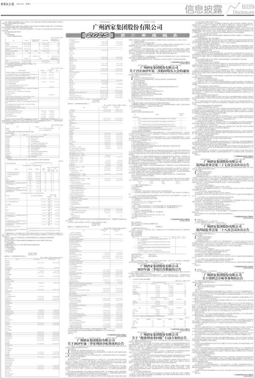 本公司董事会及全体董事保证本公告内容不存在任何虚假记载、误导性陈述或者重大遗漏,并对其内容的真实性、准确性和完整性承担法律责任。 重要内容提示: 公司董事会、监事会及董事、监事、高级管理人员保证季度报告内容的真实、准确、完整,不存在虚假记载、误导性陈述或重大遗漏,并承担个别和连带的法律责任。 公司负责人、主管会计工作负责人及会计机构负责人(会计主管人员)保证季度报告中财务信息的真实、准确、完整。 第三季度财务报表是否经审计 □是√否 一、主要财务数据 (一)主要会计数据和财务指标 单位:元币种:人民币 ■ 注:“本报告期”指本季度初至本季度末3个月期间,下同。 (二)非经常性损益项目和金额 √适用□不适用 单位:元币种:人民币 ■ 对公司将《公开发行证券的公司信息披露解释性公告第1号一一非经常性损益》未列举的项目认定为非经常性损益项目且金额重大的,以及将《公开发行证券的公司信息披露解释性公告第1号一一非经常性损益》中列举的非经常性损益项目界定为经常性损益的项目,应说明原因。 √适用□不适用 单位:元币种:人民币 ■ (三)主要会计数据、财务指标发生变动的情况、原因 √适用□不适用 ■ 二、股东信息 (一)普通股股东总数和表决权恢复的优先股股东数量及前十名股东持股情况表 单位:股 ■ 注:根据相关规定,公司回购专户未在“前10名股东持股情况”和“前10名无限售条件股东持股情况”中列示。截至2025年9月30日,公司回购专用证券账户B887272974持有公司股份5,618,435股,占公司总股本的比例为0.99%。 持股5%以上股东、前10名股东及前10名无限售流通股股东参与转融通业务出借股份情况 □适用√不适用 前10名股东及前10名无限售流通股股东因转融通出借/归还原因导致较上期发生变化 □适用√不适用 三、其他提醒事项 需提醒投资者关注的关于公司报告期经营情况的其他重要信息 □适用√不适用 四、季度财务报表 (一)审计意见类型 □适用√不适用 (二)财务报表 合并资产负债表 2025年9月30日 编制单位:广州酒家集团股份有限公司 单位:元币种:人民币审计类型:未经审计 ■ ■ 公司负责人:徐伟兵主管会计工作负责人:卢加会计机构负责人:陈苑 合并利润表 2025年1一9月 编制单位:广州酒家集团股份有限公司 单位:元币种:人民币审计类型:未经审计 ■ 本期发生同一控制下企业合并的,被合并方在合并前实现的净利润为:0.00元, 上期被合并方实现的净利润为:0.00元。 公司负责人:徐伟兵主管会计工作负责人:卢加会计机构负责人:陈苑 合并现金流量表 2025年1一9月 编制单位:广州酒家集团股份有限公司 单位:元币种:人民币审计类型:未经审计 ■ 公司负责人:徐伟兵主管会计工作负责人:卢加会计机构负责人:陈苑 2025年起首次执行新会计准则或准则解释等涉及调整首次执行当年年初的财务报表 □适用√不适用 特此公告。 广州酒家集团股份有限公司董事会 2025年10月29日 证券代码:603043 证券简称:广州酒家 公告编号:2025-057 广州酒家集团股份有限公司 关于2025年前三季度利润分配预案的公告 本公司董事会及全体董事保证本公告内容不存在任何虚假记载、误导性陈述或者重大遗漏,并对其内容的真实性、准确性和完整性承担法律责任。 重要内容提示: ● 每股分配比例:A股每股派发现金红利0.10元(人民币,含税) ● 本次利润分配以实施权益分派股权登记日登记的总股本扣除公司回购专用证券账户股份数后的股份为基数,具体日期将在权益分派实施公告中明确。 ● 在实施权益分派股权登记日前,如公司总股本发生变动,公司拟维持每股分配比例不变,相应调整分配总额,并将另行公告具体调整情况。 一、利润分配方案内容 截至2025年9月30日,广州酒家集团股份有限公司(以下简称“公司”)母公司报表中期末可供分配利润1,841,889,940.07元。公司2025年前三季度实现归属于上市公司股东的净利润为449,425,183.83元(以上数据未经审计)。经董事会决议,公司2025年前三季度拟以实施权益分派股权登记日登记的总股本扣除公司股份回购专用证券账户所持有股份数后的股本为基数分配利润。本次利润分配预案如下: 拟向全体股东每10股派发现金红利1.00元(含税)。截至2025年9月30日,公司总股本为568,770,805股,以扣除截至目前回购专用证券账户股份数6,318,435股后的股本数562,452,370股为基数计算,合计拟派发现金红利56,245,237.00元(含税),占公司2025年前三季度合并报表中归属于上市公司股东的净利润的比例为12.51%。 如在本利润分配预案披露之日起至实施权益分派股权登记日期间,因可转债转股/回购股份/股权激励授予股份回购注销/重大资产重组股份回购注销等致使公司总股本发生变动的,公司拟维持每股分配比例不变,相应调整分配总额。如后续总股本发生变化,将另行对外公告具体调整情况。 提请股东大会授权董事长具体实施上述分配事宜,并按照有关法律、法规和监管部门要求办理有关税务扣缴等一切相关事宜。根据有关法律法规及本公司章程的有关规定,该议案尚需提交公司股东大会审议。 二、公司履行的决策程序 (一)董事会会议的召开、审议和表决情况 2025年10月29日,公司第四届董事会第三十七次会议以7票同意、0票反对、0票弃权审议通过了《广州酒家集团股份有限公司2025年前三季度利润