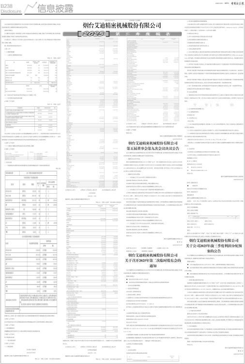 证券代码:603638 证券简称:艾迪精密 本公司董事会及全体董事保证本公告内容不存在任何虚假记载、误导性陈述或者重大遗漏,并对其内容的真实性、准确性和完整性承担法律责任。 重要内容提示: 公司董事会及董事、高级管理人员保证季度报告内容的真实、准确、完整,不存在虚假记载、误导性陈述或重大遗漏,并承担个别和连带的法律责任。 公司负责人、主管会计工作负责人及会计机构负责人(会计主管人员)保证季度报告中财务信息的真实、准确、完整。 第三季度财务报表是否经审计 □是 √否 一、主要财务数据 (一)主要会计数据和财务指标 单位:元 币种:人民币 ■ 注:“本报告期”指本季度初至本季度末3个月期间,下同。 (二)非经常性损益项目和金额 √适用 □不适用 单位:元 币种:人民币 ■ 对公司将《公开发行证券的公司信息披露解释性公告第1号一一非经常性损益》未列举的项目认定为非经常性损益项目且金额重大的,以及将《公开发行证券的公司信息披露解释性公告第1号一一非经常性损益》中列举的非经常性损益项目界定为经常性损益的项目,应说明原因。 □适用 √不适用 (三)主要会计数据、财务指标发生变动的情况、原因 √适用 □不适用 ■ 二、股东信息 (一)普通股股东总数和表决权恢复的优先股股东数量及前十名股东持股情况表 单位:股 ■ 持股5%以上股东、前10名股东及前10名无限售流通股股东参与转融通业务出借股份情况 □适用 √不适用 前10名股东及前10名无限售流通股股东因转融通出借/归还原因导致较上期发生变化 □适用 √不适用 三、其他提醒事项 需提醒投资者关注的关于公司报告期经营情况的其他重要信息 □适用 √不适用 四、季度财务报表 (一)审计意见类型 □适用 √不适用 (二)财务报表 合并资产负债表 2025年9月30日 编制单位:烟台艾迪精密机械股份有限公司 单位:元 币种:人民币 审计类型:未经审计 ■ 公司负责人:宋飞 主管会计工作负责人:钟志平 会计机构负责人:钟志平 合并利润表 2025年1一9月 编制单位:烟台艾迪精密机械股份有限公司 单位:元 币种:人民币 审计类型:未经审计 ■ 本期发生同一控制下企业合并的,被合并方在合并前实现的净利润为:0元, 上期被合并方实现的净利润为:0元。 公司负责人:宋飞 主管会计工作负责人:钟志平 会计机构负责人:钟志平 合并现金流量表 2025年1一9月 编制单位:烟台艾迪精密机械股份有限公司 单位:元 币种:人民币 审计类型:未经审计 ■ 公司负责人:宋飞 主管会计工作负责人:钟志平 会计机构负责人:钟志平 2025年起首次执行新会计准则或准则解释等涉及调整首次执行当年年初的财务报表 □适用 √不适用 特此公告。 烟台艾迪精密机械股份有限公司董事会 2025年10月31日 烟台艾迪精密机械股份有限公司 第五届董事会第九次会议决议公告 本公司董事会及全体董事保证本公告内容不存在任何虚假记载、误导性陈述或者重大遗漏,并对其内容的真实性、准确性和完整性承担个别及连带责任。 一、董事会会议召开情况 烟台艾迪精密机械股份有限公司(以下简称“公司”)第五届董事会第九次会议于2025年10月30日以现场结合通讯方式召开;会议通知于2025年10月27日以书面或电子邮件方式送达;本次会议应到董事9人,实际出席会议9人,会议由董事长宋飞先生主持。本次会议的召集、召开符合《中华人民共和国公司法》和《公司章程》的有关规定。 二、董事会会议审议情况 (一)、审议通过《关于2025年第三季度报告的议案》; 表决结果:赞成9票,反对0票,弃权0票。 本议案审计委员会发表明确同意意见,并提交董事会审议。 具体内容详见同日刊登在公司指定信息披露媒体上的相关公告。 (二)、审议通过《关于公司2025年前三季度利润分配预案的议案》; 公司拟以实施权益分派股权登记日登记的总股本为基数,拟向可参与分配的股东每10股派发现金红利1.00元(含税)。截至2025年第三季度末公司总股本831,088,544股,以此计算合计拟派发现金红利83,108,854.00元(含税)。 如在本报告披露之日起至实施权益分派的股权登记日期间,因可转债转股/回购股份限制性股票授予与回购注销/重大资产重组股份回购注销等致使公司总股本发生变动的,公司拟维持每股分配比例不变,相应调整分配总额。 表决结果:赞成9票,反对0票,弃权0票。 本议案审计委员会发表明确同意意见,并提交董事会审议。 本议案尚需提请公司2025年第二次临时股东会予以审议。 具体内容详见同日刊登在公司指定信息披露媒体上的相关公告。 (三)、审议通过《关于召开公司2025年第二次临时股东会的议案》。 同意召开公司2025年第二次临时股东会。 表决结果:赞成9票,反对0票,弃权0票。 具体内容详见同日刊登在公司指定信息披露媒体上的相关公告。 特此公告。 烟台艾迪精密机械股份有限公司 董 事 会 2025年10月31日 证券代码:603638 证券简称:艾迪精密 公告编号:2025-045 转债代码:113644 转债简称:艾迪转债 烟台艾迪精密机械股份有限公司 关于召开2025年第二次临时股东会的通知 本公司董事会及全体董事保证本公告内容不存在任何虚假记载、误导性陈述或者重大遗漏,并对其内容的真实性、准确性和完整性承担法律责任。 重要内容提示: ● 股东会召开日期:2025年11月20日 ● 本次股东会采用的网络投票系统:上海证券