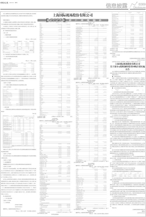 本公司董事会及全体董事保证本公告内容不存在任何虚假记载、误导性陈述或者重大遗漏,并对其内容的真实性、准确性和完整性承担法律责任。 重要内容提示: 公司董事会及董事、高级管理人员保证季度报告内容的真实、准确、完整,不存在虚假记载、误导性陈述或重大遗漏,并承担个别和连带的法律责任。 公司负责人、主管会计工作负责人及会计机构负责人(会计主管人员)保证季度报告中财务信息的真实、准确、完整。 第三季度财务报表是否经审计 □是 √否 一、主要财务数据 (一)主要会计数据和财务指标 单位:元 币种:人民币 ■ 注:“本报告期”指本季度初至本季度末3个月期间,下同。 (二)非经常性损益项目和金额 √适用 □不适用 单位:元 币种:人民币 ■ 对公司将《公开发行证券的公司信息披露解释性公告第1号一一非经常性损益》未列举的项目认定为非经常性损益项目且金额重大的,以及将《公开发行证券的公司信息披露解释性公告第1号一一非经常性损益》中列举的非经常性损益项目界定为经常性损益的项目,应说明原因。 □适用 √不适用 (三)主要会计数据、财务指标发生变动的情况、原因 √适用 □不适用 ■ 二、股东信息 (一)普通股股东总数和表决权恢复的优先股股东数量及前十名股东持股情况表 单位:股 ■ 持股5%以上股东、前10名股东及前10名无限售流通股股东参与转融通业务出借股份情况 □适用 √不适用 前10名股东及前10名无限售流通股股东因转融通出借/归还原因导致较上期发生变化 □适用 √不适用 三、其他提醒事项 需提醒投资者关注的关于公司报告期经营情况的其他重要信息 √适用 □不适用 结合公司广告业务发展需要,经公司第九届董事会第十四次会议审议通过,公司、虹桥机场公司决定与上海机场德高动量广告有限公司签订《广告阵地经营权转让合同》。具体内容请详见公司于2023年12月27日披露的《关于签订广告阵地经营权转让合同的公告》(公告编号:临2023-047)。报告期内,相关广告合同收入1.7亿元。 近年来,全球经济发生显著变化,为巩固上海机场免税业务的领先地位,确保免税业务长远、健康、持续发展,提高口岸免税的市场竞争力,经公司第九届董事会第十四次会议审议通过,公司、虹桥机场公司分别与日上免税行(上海)有限公司签订了《上海浦东国际机场免税店项目经营权转让合同之补充协议二》《上海虹桥国际机场免税店项目经营权转让合同之补充协议一》。具体内容请详见公司于2023年12月27日披露的《关于签订免税店项目经营权转让合同之相关补充协议的公告》(公告编号:临2023-048)。报告期内,相关免税合同收入3.14亿元。 四、季度财务报表 (一)审计意见类型 □适用 √不适用 (二)财务报表 合并资产负债表 2025年9月30日 编制单位:上海国际机场股份有限公司 单位:元 币种:人民币 审计类型:未经审计 ■ 公司负责人:冯昕 主管会计工作负责人:徐宁 会计机构负责人:汤贺 合并利润表 2025年1一9月 编制单位:上海国际机场股份有限公司 单位:元 币种:人民币 审计类型:未经审计 ■ 公司负责人:冯昕 主管会计工作负责人:徐宁 会计机构负责人:汤贺 合并现金流量表 2025年1一9月 编制单位:上海国际机场股份有限公司 单位:元 币种:人民币 审计类型:未经审计 ■ 公司负责人:冯昕 主管会计工作负责人:徐宁 会计机构负责人:汤贺 母公司资产负债表 2025年9月30日 编制单位:上海国际机场股份有限公司 单位:元 币种:人民币 审计类型:未经审计 ■ 公司负责人:冯昕 主管会计工作负责人:徐宁 会计机构负责人:汤贺 母公司利润表 2025年1一9月 编制单位:上海国际机场股份有限公司 单位:元 币种:人民币审计类型:未经审计 ■ 公司负责人:冯昕 主管会计工作负责人:徐宁 会计机构负责人:汤贺 母公司现金流量表 2025年1一9月 编制单位:上海国际机场股份有限公司 单位:元 币种:人民币审计类型:未经审计 ■ 公司负责人:冯昕 主管会计工作负责人:徐宁 会计机构负责人:汤贺 2025年起首次执行新会计准则或准则解释等涉及调整首次执行当年年初的财务报表 □适用 √不适用 特此公告。 上海国际机场股份有限公司董事会 2025年10月30日 证券代码:600009 证券简称:上海机场 公告编号:临2025-051 上海国际机场股份有限公司 关于部分A股限制性股票回购注销实施公告 本公司董事会及全体董事保证本公告内容不存在任何虚假记载、误导性陈述或者重大遗漏,并对其内容的真实性、准确性和完整性承担法律责任。 重要内容提示: ● 回购注销原因: 根据《上海国际机场股份有限公司A股限制性股票激励计划(草案修订稿)》(以下简称“《激励计划》”或“本激励计划”)的相关规定及上海国际机场股份有限公司(以下简称“上海机场”或“公司”)2024年第一次临时股东大会的授权,鉴于本激励计划首次授予的289名激励对象中13名激励对象存在解除劳动关系、职务变动等情况,经公司董事会审议决定,公司将回购注销该13名激励对象的部分已获授但尚未解除限售的限制性股票合计168,300股。 ● 本次注销股份的有关情况: ■ 一、本次限制性股票回购注销的决策和信息披露 2025年8月28日,公司召开第九届董事会第二十六次会议,审议通过了《关于回购注销部分限制性股票及调整限制性股票回购价格的议案》,同意公司根据《上市公司股