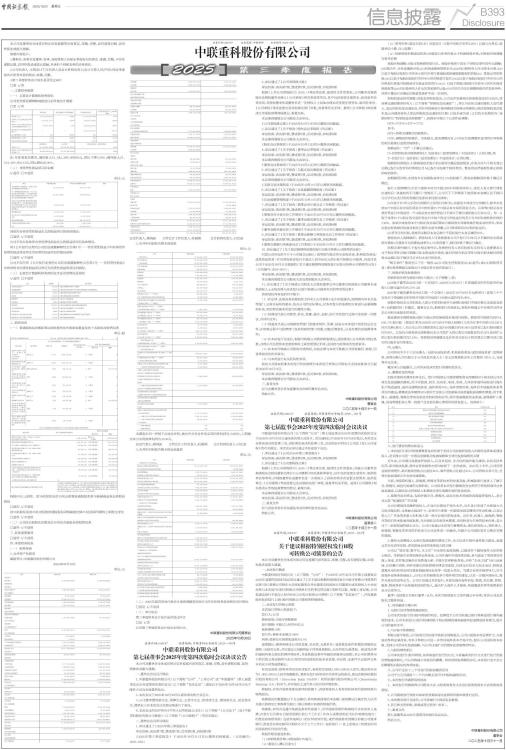 本公司及董事会全体成员保证信息披露的内容真实、准确、完整,没有虚假记载、误导性陈述或重大遗漏。 重要内容提示: 1.董事会、监事会及董事、监事、高级管理人员保证季度报告的真实、准确、完整,不存在虚假记载、误导性陈述或重大遗漏,并承担个别和连带的法律责任。 2.公司负责人、主管会计工作负责人及会计机构负责人(会计主管人员)声明:保证季度报告中财务信息的真实、准确、完整。 3.第三季度财务会计报告是否经过审计 □是 √否 一、主要财务数据 (一) 主要会计数据和财务指标 公司是否需追溯调整或重述以前年度会计数据 □是 √否 ■ 注:年初至报告期末,境内收入15,842,269,469.66元,同比下降5.38%;境外收入21,313,388,603.33元,同比增长20.80%。 (二) 非经常性损益项目和金额 √适用 □不适用 单位:元 ■ 其他符合非经常性损益定义的损益项目的具体情况: □适用 √不适用 公司不存在其他符合非经常性损益定义的损益项目的具体情况。 将《公开发行证券的公司信息披露解释性公告第1号一一非经常性损益》中列举的非经常性损益项目界定为经常性损益项目的情况说明 □适用 √不适用 公司不存在将《公开发行证券的公司信息披露解释性公告第1号一一非经常性损益》中列举的非经常性损益项目界定为经常性损益的项目的情形。 (三) 主要会计数据和财务指标发生变动的情况及原因 √适用 □不适用 ■ 二、股东信息 (一) 普通股股东总数和表决权恢复的优先股股东数量及前十名股东持股情况表 单位:股 ■ 持股5%以上股东、前10名股东及前10名无限售流通股股东参与转融通业务出借股份情况 □适用 √不适用 前10名股东及前10名无限售流通股股东因转融通出借/归还原因导致较上期发生变化 □适用 √不适用 (二) 公司优先股股东总数及前10名优先股股东持股情况表 □适用 √不适用 三、其他重要事项 □适用 √不适用 四、季度财务报表 (一) 财务报表 1、合并资产负债表 编制单位:中联重科股份有限公司 2025年09月30日 单位:元 ■ ■ 法定代表人:詹纯新 主管会计工作负责人:杜毅刚 会计机构负责人:吕红波 2、合并年初到报告期末利润表 单位:元 ■ 本期发生同一控制下企业合并的,被合并方在合并前实现的净利润为:0.00元,上期被合并方实现的净利润为:0.00元。 法定代表人:詹纯新 主管会计工作负责人:杜毅刚 会计机构负责人:吕红波 3、合并年初到报告期末现金流量表 单位:元 ■ (二) 2025年起首次执行新会计准则调整首次执行当年年初财务报表相关项目情况 □适用 √不适用 (三) 审计报告 第三季度财务会计报告是否经过审计 □是 √否 公司第三季度财务会计报告未经审计。 中联重科股份有限公司董事会 2025年10月30日 证券代码:000157 证券简称:中联重科公告编号:2025-050号 中联重科股份有限公司 第七届董事会2025年度第四次临时会议决议公告 本公司及董事会全体成员保证信息披露内容的真实、准确、完整,没有虚假记载、误导性陈述或重大遗漏。 一、董事会会议召开情况 1、中联重科股份有限公司(以下简称“公司”、“上市公司”或“中联重科”)第七届董事会2025年度第四次临时会议(以下简称“本次会议”)通知已于2025年10月24日以电子邮件方式向全体董事发出。 2、本次会议于2025年10月30日以通讯表决的方式召开。 3、公司董事詹纯新先生、贺柳先生、王贤平先生、张成虎先生、黄国滨先生、吴宝海先生、黄珺女士对本次会议全部议案进行了表决。 4、本次会议的召开符合《中华人民共和国公司法》(以下简称“《公司法》”)及《中联重科股份有限公司章程》(以下简称“《公司章程》”)的有关规定。 二、董事会会议审议情况 1、审议通过了《2025年第三季度报告》 审议结果:表决票7票,赞成票7票,反对票0票,弃权票0票 《2025年第三季度报告》于2025年10月31日在巨潮资讯网披露。(公告编号:2025-052) 2、审议通过了《公司章程修正案》 审议结果:表决票7票,赞成票7票,反对票0票,弃权票0票 根据《上市公司章程指引(2025)》等法律法规、规范性文件的要求,公司董事会提请股东会授权董事会修订《公司章程》相关条款等事宜,其中包括变更注册资本、取消监事会等事项,并授权董事长或董事长进一步授权人士具体办理本次变更注册资本、取消监事会、《公司章程》等变更登记及其他相关部门审批、报备等有关手续。最终《公司章程》相关修改以市场监督管理局登记、备案为准。 本议案尚需提交公司股东大会审议。 《公司章程修正案》于2025年10月31日在巨潮资讯网披露。 3、审议通过了《关于修改〈股东会议事规则〉的议案》 审议结果:表决票7票,赞成票7票,反对票0票,弃权票0票 本议案尚需提交公司股东大会审议。 《股东会议事规则》于2025年10月31日在巨潮资讯网披露。 4、审议通过了《关于修改〈董事会议事规则〉的议案》 审议结果:表决票7票,赞成票7票,反对票0票,弃权票0票 本议案尚需提交公司股东大会审议。 《董事会议事规则》于2025年10月31日在巨潮资讯网披露。 5、审议通过了《关于修改〈关联交易决策制度〉的议案》 审议结果:表决票7票,赞成票7票,反对票0票,弃权票0票 本议案尚需提交公司股东大会审议。 《关联交易决策制度》于2025年10月31日在巨潮资讯网披露。 6、审议通过了《关于修改〈信息披