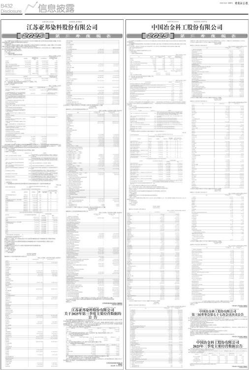 证券代码:601618 证券简称:中国中冶 本公司董事会及全体董事保证本公告内容不存在任何虚假记载、误导性陈述或者重大遗漏,并对其内容的真实性、准确性和完整性承担法律责任。 重要内容提示: 1、公司董事会、董事及高级管理人员保证季度报告内容的真实、准确、完整,不存在虚假记载、误导性陈述或重大遗漏,并承担个别和连带的法律责任。 2、公司负责人、主管会计工作负责人及会计机构负责人(会计主管人员)保证季度报告中财务信息的真实、准确、完整。 3、第三季度财务报表是否经审计 □是 √否 4、除特别注明外,本报告所有金额币种均为人民币。 一、主要财务数据 (一)主要会计数据和财务指标 单位:千元币种:人民币 ■ 注:“本报告期”指本季度初至本季度末3个月期间,下同。 (二)非经常性损益项目和金额 √适用 □不适用 单位:千元币种:人民币 ■ 对公司将《公开发行证券的公司信息披露解释性公告第1号一一非经常性损益》未列举的项目认定为非经常性损益项目且金额重大的,以及将《公开发行证券的公司信息披露解释性公告第1号一一非经常性损益》中列举的非经常性损益项目界定为经常性损益的项目,应说明原因。 □适用 √不适用 (三)主要会计数据、财务指标发生变动的情况、原因 √适用 □不适用 ■ 二、股东信息 (一)普通股股东总数和表决权恢复的优先股股东数量及前十名股东持股情况表(1) 单位:股 ■ 注(1):表中所示数字来自于截至2025年9月30日公司股东名册。 注(2):香港中央结算(代理人)有限公司持有的H股乃代表多个权益拥有人持有。 持股5%以上股东、前10名股东及前10名无限售流通股股东参与转融通业务出借股份情况 □适用 √不适用 前10名股东及前10名无限售流通股股东因转融通出借/归还原因导致较上期发生变化 □适用 √不适用 三、其他提醒事项 需提醒投资者关注的关于公司本报告期经营情况的其他重要信息 √适用 □不适用 公司2025年前三季度累计新签合同额人民币7,606.7亿元,较上年同期减少14.7%。其中,新签海外合同额人民币669.0亿元,较上年同期增长10.1%。 四、季度财务报表 (一)审计意见类型 □适用 √不适用 (二)财务报表 合并资产负债表 2025年9月30日 编制单位:中国冶金科工股份有限公司 单位:千元币种:人民币审计类型:未经审计 ■ 公司负责人:陈建光主管会计工作负责人:董甦会计机构负责人:李移峰 合并利润表 2025年1一9月 编制单位:中国冶金科工股份有限公司 单位:千元币种:人民币审计类型:未经审计 ■ 本期发生同一控制下企业合并的,被合并方在合并前实现的净利润为:人民币0元, 上期被合并方实现的净利润为:人民币0元。 公司负责人:陈建光主管会计工作负责人:董甦会计机构负责人:李移峰 合并现金流量表 2025年1一9月 编制单位:中国冶金科工股份有限公司 单位:千元币种:人民币审计类型:未经审计 ■ 公司负责人:陈建光主管会计工作负责人:董甦会计机构负责人:李移峰 母公司资产负债表 2025年9月30日 编制单位:中国冶金科工股份有限公司 单位:千元币种:人民币审计类型:未经审计 ■ 公司负责人:陈建光主管会计工作负责人:董甦会计机构负责人:李移峰 母公司利润表 2025年1一9月 编制单位:中国冶金科工股份有限公司 单位:千元币种:人民币审计类型:未经审计 ■ 公司负责人:陈建光主管会计工作负责人:董甦会计机构负责人:李移峰 母公司现金流量表 2025年1一9月 编制单位:中国冶金科工股份有限公司 单位:千元币种:人民币审计类型:未经审计 ■ 公司负责人:陈建光主管会计工作负责人:董甦会计机构负责人:李移峰 (三)2025年起首次执行新会计准则或准则解释等涉及调整首次执行当年年初的财务报表 □适用 √不适用 特此公告。 中国冶金科工股份有限公司董事会 2025年10月30日 A股简称:中国中冶 A股代码:601618 公告编号:临2025-052 中国冶金科工股份有限公司 第三届董事会第七十七次会议决议公告 中国冶金科工股份有限公司(以下简称“中国中冶”、“本公司”或“公司”)董事会及全体董事保证本公告内容不存在任何虚假记载、误导性陈述或者重大遗漏,并对其内容的真实性、准确性和完整性承担法律责任。 公司第三届董事会第七十七次会议于2025年10月30日在中冶大厦召开。会议应出席董事七名,实际出席董事七名。会议由陈建光董事长主持。本次会议的召开符合《公司法》等法律法规及《中国冶金科工股份有限公司章程》的有关规定。 会议审议通过相关议案并形成决议如下: 一、通过《关于中国中冶2025年第三季度报告的议案》 1.同意中国中冶2025年第三季度报告。 2.同意在境内外股票上市地根据适用法律法规披露上述报告。 表决结果:七票赞成、零票反对、零票弃权。 本议案已经公司第三届董事会审计委员会2025年第八次会议事前认可,同意提交董事会审议。(表决结果:三票赞成、零票反对、零票弃权。) 有关该报告的具体内容详见本公司另行发布的有关资料。 二、通过《关于修订〈中国中冶股票市场信息披露暂缓与豁免业务实施细则〉的议案》 同意修订《中国中冶股票市场信息披露暂缓与豁免业务实施细则》。 表决结果:七票赞成、零票反对、零票弃权。 修订后制度具体内容详见本公司同日披露的《中国中冶股票市场信息披露暂缓与豁免业务实施细则》。 特此