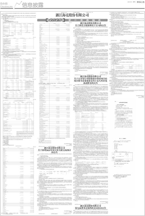 本公司及董事会全体成员保证信息披露的内容真实、准确、完整,没有虚假记载、误导性陈述或重大遗漏。 重要内容提示: 1.董事会及董事、高级管理人员保证季度报告的真实、准确、完整,不存在虚假记载、误导性陈述或重大遗漏,并承担个别和连带的法律责任。 2.公司负责人、主管会计工作负责人及会计机构负责人(会计主管人员)声明:保证季度报告中财务信息的真实、准确、完整。 3.第三季度财务会计报告是否经过审计 □是 √否 一、主要财务数据 (一) 主要会计数据和财务指标 公司是否需追溯调整或重述以前年度会计数据 □是 √否 ■ (二) 非经常性损益项目和金额 √适用 □不适用 单位:元 ■ 其他符合非经常性损益定义的损益项目的具体情况: □适用 √不适用 公司不存在其他符合非经常性损益定义的损益项目的具体情况。 将《公开发行证券的公司信息披露解释性公告第1号一一非经常性损益》中列举的非经常性损益项目界定为经常性损益项目的情况说明 □适用 √不适用 公司不存在将《公开发行证券的公司信息披露解释性公告第1号一一非经常性损益》中列举的非经常性损益项目界定为经常性损益的项目的情形。 (三) 主要会计数据和财务指标发生变动的情况及原因 √适用 □不适用 1、报告期末,资产负债表项目的主要变化及其原因: 单位:万元 ■ 2、报告期,利润表项目发生的变化及其主要原因: 单位:万元 ■ 3、报告期,现金流量表项目发生的变化及其主要原因: 单位:万元 ■ 二、股东信息 (一) 普通股股东总数和表决权恢复的优先股股东数量及前十名股东持股情况表 单位:股 ■ 持股5%以上股东、前10名股东及前10名无限售流通股股东参与转融通业务出借股份情况 □适用 √不适用 前10名股东及前10名无限售流通股股东因转融通出借/归还原因导致较上期发生变化 □适用 √不适用 (二) 公司优先股股东总数及前10名优先股股东持股情况表 □适用 √不适用 三、其他重要事项 □适用 √不适用 四、季度财务报表 (一) 财务报表 1、合并资产负债表 编制单位:浙江海亮股份有限公司 2025年09月30日 单位:元 ■ 法定代表人:冯橹铭 主管会计工作负责人:陈东 会计机构负责人:陈东 2、合并年初到报告期末利润表 单位:元 ■ 法定代表人:冯橹铭 主管会计工作负责人:陈东 会计机构负责人:陈东 3、合并年初到报告期末现金流量表 单位:元 ■ (二) 2025年起首次执行新会计准则调整首次执行当年年初财务报表相关项目情况 □适用 √不适用 (三) 审计报告 第三季度财务会计报告是否经过审计 □是 √否 公司第三季度财务会计报告未经审计。 浙江海亮股份有限公司 董事会 2025年10月31日 证券代码:002203 证券简称:海亮股份 公告编号:2025-107 浙江海亮股份有限公司 关于新增2025年度日常关联交易预计的公告 本公司及董事会全体成员保证信息披露的内容真实、准确、完整,没有虚假记载、误导性陈述或重大遗漏。 一、日常关联交易基本情况 (一)新增日常关联交易概述 浙江海亮股份有限公司(以下简称“公司”)于2025年4月24日召开了第八届董事会第二十四次会议及第八届监事会第十四次会议,2025年5月20日召开了2024年度股东会,审议通过了《关于审核2025年度日常关联交易预计的议案》。具体内容详见公司于2025年4月26日及2025年5月21日在《证券时报》《上海证券报》《证券日报》《中国证券报》和巨潮资讯网(http://www.cninfo.com.cn)披露的《关于审核2025年度日常关联交易预计的公告》(公告编号:2025-024)、《2024年度股东大会决议公告》(公告编号:2025-038)。 公司于2025年10月29日召开了第九届董事会第四次会议,审议通过了《关于新增2025年度日常关联交易预计的议案》,根据公司及控股子公司的日常经营需要,公司及下属子公司2025年预计与恒中达建筑有限公司(以下简称“恒中达”)发生日常经营性服务关联交易,新增预计金额为3,201万元。本次新增交易预计额度已经公司董事会审议通过,关联董事对该议案回避表决。 根据《浙江海亮股份有限公司公司章程》《浙江海亮股份有限公司关联交易管理办法》的有关规定,本次新增日常关联交易事项尚需提交公司2025年第三次临时股东会审议,股东会投票表决时,关联股东需对本议案回避表决。 (二)本次新增预计日常关联交易类别和金额 单位:万元 ■ 二、关联方及关联关系 1、基本情况 企业名称:恒中达建筑有限公司 注册资本:10,000万人民币 住所:浙江省绍兴市诸暨市店口镇解放路与铭仕路交叉口海亮御园28幢1号 法定代表人:何斌 经营范围:许可项目:建设工程施工,建设工程设计;建筑物拆除作业(爆破作业除外)(依法须经批准的项目,经相关部门批准后方可开展经营活动,具体经营项目以审批结果为准)。一般项目:工程造价咨询业务;工程管理服务;园林绿化工程施工;建筑材料销售;建筑装饰材料销售;技术进出口(除依法须经批准的项目外,凭营业执照依法自主开展经营活动)。 2、与公司关联关系 公司控股股东海亮集团有限公司的全资子公司收购了恒中达30%的股权,且向恒中达委派了董事,符合《深圳证券交易所股票上市规则》规定的关联关系情形,恒中达是公司的关联方。 3、履约能力分析 上述关联方经营情况及财务状况稳定,与公司合作关系良好,具备良好的履约能力。 三、关联交易的主要内容 公司以市场为