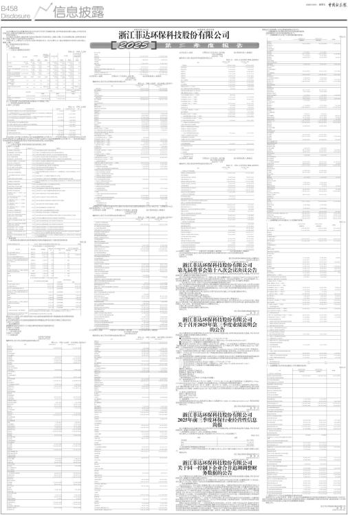 本公司董事会及全体董事保证本公告内容不存在任何虚假记载、误导性陈述或者重大遗漏,并对其内容的真实性、准确性和完整性承担法律责任。 重要内容提示: 公司董事会及董事、高级管理人员保证季度报告内容的真实、准确、完整,不存在虚假记载、误导性陈述或重大遗漏,并承担个别和连带的法律责任。 公司负责人、主管会计工作负责人及会计机构负责人(会计主管人员)保证季度报告中财务信息的真实、准确、完整。 第三季度财务报表是否经审计 □是 √否 一、主要财务数据 (一)主要会计数据和财务指标 单位:元 币种:人民币 ■ 注:“本报告期”指本季度初至本季度末3个月期间,下同。 (二)非经常性损益项目和金额 √适用 □不适用 单位:元 币种:人民币 ■ 对公司将《公开发行证券的公司信息披露解释性公告第1号一一非经常性损益》未列举的项目认定为非经常性损益项目且金额重大的,以及将《公开发行证券的公司信息披露解释性公告第1号一一非经常性损益》中列举的非经常性损益项目界定为经常性损益的项目,应说明原因。 □适用 √不适用 (三)主要会计数据、财务指标发生变动的情况、原因 √适用 □不适用 ■ 二、股东信息 (一)普通股股东总数和表决权恢复的优先股股东数量及前十名股东持股情况表 单位:股 ■ 持股5%以上股东、前10名股东及前10名无限售流通股股东参与转融通业务出借股份情况 □适用 √不适用 前10名股东及前10名无限售流通股股东因转融通出借/归还原因导致较上期发生变化 □适用 √不适用 三、其他提醒事项 需提醒投资者关注的关于公司报告期经营情况的其他重要信息 □适用 √不适用 四、季度财务报表 (一)审计意见类型 □适用 √不适用 (二)财务报表 合并资产负债表 2025年9月30日 编制单位:浙江菲达环保科技股份有限公司 单位:元 币种:人民币 审计类型:未经审计 ■ ■ ■ 公司负责人:吴刚 主管会计工作负责人:朱叶梅 会计机构负责人:杨海杰 合并利润表 2025年1一9月 编制单位:浙江菲达环保科技股份有限公司 单位:元 币种:人民币 审计类型:未经审计 ■ 本期发生同一控制下企业合并的,被合并方在合并前实现的净利润为:4,750,446.27元, 上期被合并方实现的净利润为:7,121,309.31元。 公司负责人:吴刚 主管会计工作负责人:朱叶梅 会计机构负责人:杨海杰 合并现金流量表 2025年1一9月 编制单位:浙江菲达环保科技股份有限公司 单位:元 币种:人民币 审计类型:未经审计 ■ 公司负责人:吴刚 主管会计工作负责人:朱叶梅 会计机构负责人:杨海杰 母公司资产负债表 2025年9月30日 编制单位:浙江菲达环保科技股份有限公司 单位:元 币种:人民币 审计类型:未经审计 ■ ■ 公司负责人:吴刚 主管会计工作负责人:朱叶梅 会计机构负责人:杨海杰 母公司利润表 2025年1一9月 编制单位:浙江菲达环保科技股份有限公司 单位:元 币种:人民币审计类型:未经审计 ■ 公司负责人:吴刚 主管会计工作负责人:朱叶梅 会计机构负责人:杨海杰 母公司现金流量表 2025年1一9月 编制单位:浙江菲达环保科技股份有限公司 单位:元 币种:人民币审计类型:未经审计 ■ 公司负责人:吴刚 主管会计工作负责人:朱叶梅 会计机构负责人:杨海杰 2025年起首次执行新会计准则或准则解释等涉及调整首次执行当年年初的财务报表 □适用 √不适用 特此公告。 浙江菲达环保科技股份有限公司董事会 2025年10月30日 证券代码:600526 证券简称:菲达环保 公告编号:临2025-055 浙江菲达环保科技股份有限公司 第九届董事会第十八次会议决议公告 本公司董事会及全体董事保证本公告内容不存在任何虚假记载、误导性陈述或者重大遗漏,并对其内容的真实性、准确性和完整性承担法律责任。 浙江菲达环保科技股份有限公司(以下简称公司)第九届董事会第十八次会议于2025年10月23日以电子邮件等形式发出通知,于2025年10月30日以通讯表决的形式召开。会议应出席董事11人,实际出席董事11人,其中独立董事4名。本次董事会的召开程序符合《中华人民共和国公司法》及《公司章程》的规定 一、审议通过《关于同一控制下企业合并追溯调整财务数据的议案》 浙江菲达保盛环境科技有限公司和浙江省环保集团宁波禹成有限公司分别于2025年4月、5月成为公司控股子公司,并被纳入公司合并报表范围。本次合并为同一控制下企业合并,公司按照相关规定对2024年相关财务报表数据进行追溯调整。内容详见同期披露的临2025-056号《浙江菲达环保科技股份有限公司关于同一控制下企业合并追溯调整财务数据的公告》。 本议案已经公司董事会审计委员会2025年第四次会议审议通过,并同意提交董事会审议。 同意11票,反对0票,弃权0票。 同意票数占参加会议董事人数的100%。 二、审议通过《公司2025年第三季度报告》 内容详见同期披露的《浙江菲达环保科技股份有限公司2025年第三季度报告》。 本报告已经公司董事会审计委员会2025年第四次会议审议通过,审计委员会认为:公司2025年第三季度报告公允地反映了报告期内的财务状况和经营成果,编制和审议程序符合有关法律法规、规章和规范性文件的规定,合法、有效。我们同意将其提交公司董事会审议。 同意11票,反对0票,弃权0票。 同意票数占参加会议董事人数的100%。 特此公告。 浙江菲达环保科技股份有限公司 董 事 会