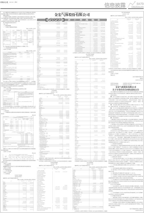 本公司董事会及全体董事保证本公告内容不存在任何虚假记载、误导性陈述或者重大遗漏,并对其内容的真实性、准确性和完整性依法承担法律责任。 重要内容提示: 公司董事会及董事、高级管理人员保证季度报告内容的真实、准确、完整,不存在虚假记载、误导性陈述或重大遗漏,并承担个别和连带的法律责任。 公司负责人、主管会计工作负责人及会计机构负责人(会计主管人员)保证季度报告中财务信息的真实、准确、完整。 第三季度财务报表是否经审计 □是 √否 一、主要财务数据 (一)主要会计数据和财务指标 单位:元币种:人民币 ■ 注:“本报告期”指本季度初至本季度末3个月期间,下同。 (二)非经常性损益项目和金额 √适用 □不适用 单位:元币种:人民币 ■ 对公司将《公开发行证券的公司信息披露解释性公告第1号一一非经常性损益》未列举的项目认定为非经常性损益项目且金额重大的,以及将《公开发行证券的公司信息披露解释性公告第1号一一非经常性损益》中列举的非经常性损益项目界定为经常性损益的项目,应说明原因。 □适用 √不适用 (三)主要会计数据、财务指标发生变动的情况、原因 √适用 □不适用 ■ 注:年初至本报告期末,公司各业务收入占主营业务收入的比例分别为:大宗气体占比44.55%、特种气体占比33.07%、现场制气及租金占比13.47%、燃气占比8.91%。 二、股东信息 (一)普通股股东总数和表决权恢复的优先股股东数量及前十名股东持股情况表 单位:股 ■ 持股5%以上股东、前10名股东及前10名无限售流通股股东参与转融通业务出借股份情况 √适用 □不适用 单位:股 ■ 前10名股东及前10名无限售流通股股东因转融通出借/归还原因导致较上期发生变化 □适用 √不适用 三、其他提醒事项 需提醒投资者关注的关于公司报告期经营情况的其他重要信息 □适用 √不适用 四、季度财务报表 (一)审计意见类型 □适用 √不适用 (二)财务报表 合并资产负债表 2025年9月30日 编制单位:金宏气体股份有限公司 单位:元币种:人民币审计类型:未经审计 ■ ■ 公司负责人:金向华主管会计工作负责人:宗卫忠会计机构负责人:刘建勇 合并利润表 2025年1一9月 编制单位:金宏气体股份有限公司 单位:元币种:人民币审计类型:未经审计 ■ 本期发生同一控制下企业合并的,被合并方在合并前实现的净利润为:0元,上期被合并方实现的净利润为:0元。 公司负责人:金向华主管会计工作负责人:宗卫忠会计机构负责人:刘建勇 合并现金流量表 2025年1一9月 编制单位:金宏气体股份有限公司 单位:元币种:人民币审计类型:未经审计 ■ ■ 公司负责人:金向华主管会计工作负责人:宗卫忠会计机构负责人:刘建勇 母公司资产负债表 2025年9月30日 编制单位:金宏气体股份有限公司 单位:元币种:人民币审计类型:未经审计 ■ 公司负责人:金向华主管会计工作负责人:宗卫忠会计机构负责人:刘建勇 母公司利润表 2025年1一9月 编制单位:金宏气体股份有限公司 单位:元币种:人民币审计类型:未经审计 ■ 公司负责人:金向华主管会计工作负责人:宗卫忠会计机构负责人:刘建勇 母公司现金流量表 2025年1一9月 编制单位:金宏气体股份有限公司 单位:元币种:人民币审计类型:未经审计 ■ 公司负责人:金向华主管会计工作负责人:宗卫忠会计机构负责人:刘建勇 2025年起首次执行新会计准则或准则解释等涉及调整首次执行当年年初的财务报表 □适用 √不适用 特此公告。 金宏气体股份有限公司 董事会 2025年10月30日 证券代码:688106 证券简称:金宏气体公告编号:2025-053 转债代码:118038 转债简称:金宏转债 金宏气体股份有限公司 关于日常经营合同的进展公告 本公司董事会及全体董事保证本公告内容不存在任何虚假记载、误导性陈述或者重大遗漏,并对其内容的真实性、准确性和完整性依法承担法律责任。 重要内容提示: ● 近日,公司控股子公司金宏气体(上海)有限公司及金宏气体(淄博)有限公司与山东睿霖高分子材料有限公司协商一致,就山东睿霖高分子空分供气项目签署了《供气合同之变更协议》,将原合同约定的“建设一套23000Nm3/h等级的空分装置及其附属设施”,变更为“建设一套50000Nm3/h等级的空分装置及其附属设施”。 ● 合同金额:根据《供气合同之变更协议》测算,约为40亿元(不含税),具体以实际为准。供气期限自供气启动日起二十(20)年。 ● 对上市公司当期业绩影响:根据变更协议相关条款约定,公司需新建一套50000Nm3/h的空分装置及其附属设施,正式启动工程建设后不超过15个月投产供气,对公司当期业绩无影响。若本供应合同顺利履行,将会对公司未来经营业绩产生积极影响,有利于提升公司的持续盈利能力和核心竞争力,且能对现有业务之间的协同带来有益的帮助。本合同的履行不会对公司业务的独立性构成影响,公司不会因履行本合同而对上述合同对方形成依赖。 ● 特别风险提示: 1、履约风险:合同双方均具有履约能力,但合同履约周期较长,在履行期间,存在因外部宏观环境重大变化、国家有关政策变化、客户需求变化以及其他不可预见或不可抗力等因素,影响最终执行情况的可能。 2、违约风险:合同中已就违约、纠纷等做出明确的规定,如本合同执行中存在因公司原因,出现供气不足、无法供气或未能按要求供气等情况,可能导致公司承担违约的风