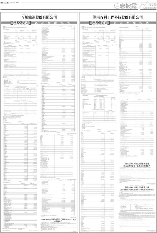 证券代码:600681 证券简称:百川能源 本公司董事会及全体董事保证本公告内容不存在任何虚假记载、误导性陈述或者重大遗漏,并对其内容的真实性、准确性和完整性承担法律责任。 重要内容提示: 公司董事会及董事、高级管理人员保证季度报告内容的真实、准确、完整,不存在虚假记载、误导性陈述或重大遗漏,并承担个别和连带的法律责任。 公司负责人、主管会计工作负责人及会计机构负责人(会计主管人员)保证季度报告中财务信息的真实、准确、完整。 第三季度财务报表是否经审计 □是 √否 一、主要财务数据 (一)主要会计数据和财务指标 单位:元 币种:人民币 ■ 注:“本报告期”指本季度初至本季度末3个月期间,下同。 (二)非经常性损益项目和金额 √适用 □不适用 单位:元 币种:人民币 ■ 对公司将《公开发行证券的公司信息披露解释性公告第1号一一非经常性损益》未列举的项目认定为非经常性损益项目且金额重大的,以及将《公开发行证券的公司信息披露解释性公告第1号一一非经常性损益》中列举的非经常性损益项目界定为经常性损益的项目,应说明原因。 □适用 √不适用 (三)主要会计数据、财务指标发生变动的情况、原因 √适用 □不适用 ■ 二、股东信息 (一)普通股股东总数和表决权恢复的优先股股东数量及前十名股东持股情况表 单位:股 ■ 持股5%以上股东、前10名股东及前10名无限售流通股股东参与转融通业务出借股份情况 □适用 √不适用 前10名股东及前10名无限售流通股股东因转融通出借/归还原因导致较上期发生变化 □适用 √不适用 三、其他提醒事项 需提醒投资者关注的关于公司报告期经营情况的其他重要信息 □适用 √不适用 四、季度财务报表 (一)审计意见类型 □适用 √不适用 (二)财务报表 合并资产负债表 2025年9月30日 编制单位:百川能源股份有限公司 单位:元 币种:人民币 审计类型:未经审计 ■ 公司负责人:王东海 主管会计工作负责人:白恒飞 会计机构负责人:陈学伟 合并利润表 2025年1一9月 编制单位:百川能源股份有限公司 单位:元 币种:人民币 审计类型:未经审计 ■ 本期发生同一控制下企业合并的,被合并方在合并前实现的净利润为:0元, 上期被合并方实现的净利润为:0元。 公司负责人:王东海 主管会计工作负责人:白恒飞 会计机构负责人:陈学伟 合并现金流量表 2025年1一9月 编制单位:百川能源股份有限公司 单位:元 币种:人民币 审计类型:未经审计 ■ 公司负责人:王东海 主管会计工作负责人:白恒飞 会计机构负责人:陈学伟 母公司资产负债表 2025年9月30日 编制单位:百川能源股份有限公司 单位:元 币种:人民币 审计类型:未经审计 ■ 公司负责人:王东海 主管会计工作负责人:白恒飞 会计机构负责人:陈学伟 母公司利润表 2025年1一9月 编制单位:百川能源股份有限公司 单位:元 币种:人民币审计类型:未经审计 ■ 公司负责人:王东海 主管会计工作负责人:白恒飞 会计机构负责人:陈学伟 母公司现金流量表 2025年1一9月 编制单位:百川能源股份有限公司 单位:元 币种:人民币审计类型:未经审计 ■ 公司负责人:王东海 主管会计工作负责人:白恒飞 会计机构负责人:陈学伟 2025年起首次执行新会计准则或准则解释等涉及调整首次执行当年年初的财务报表 □适用 √不适用 特此公告。 百川能源股份有限公司董事会 2025年10月30日 证券代码:600681 证券简称:百川能源 公告编号:2025-042 百川能源股份有限公司第十二届董事会第三次会议决议公告 本公司董事会及全体董事保证本公告内容不存在任何虚假记载、误导性陈述或者重大遗漏,并对其内容的真实性、准确性和完整性承担法律责任。 一、董事会会议召开情况 百川能源股份有限公司(以下简称“公司”)第十二届董事会第三次会议于2025年10月30日以现场结合通讯的会议方式在公司召开。本次会议通知于2025年10月27日以书面递交、邮件或微信方式送达董事,本次会议应到董事7人,实到董事7人,董事长王东海先生主持会议,公司部分高级管理人员列席会议。本次董事会会议的召开符合有关法律、行政法规、部门规章、规范性文件和公司章程的规定。 二、董事会会议审议情况 1、审议通过《2025年第三季度报告》 本议案已经董事会审计委员会事先审议通过。《2025年第三季度报告》详见上海证券交易所网站(www.sse.com.cn)。 审议情况:7票赞成 0票反对 0票弃权 0票回避 表决通过 2、逐项审议通过《关于修订、制定公司部分治理制度的议案》 根据《中华人民共和国公司法》《中华人民共和国证券法》《上市公司信息披露暂缓与豁免管理规定》《上海证券交易所股票上市规则》等法律、行政法规、规范性文件以及《公司章程》的有关规定,结合自身实际情况,公司拟修订、制定相关制度,具体如下: (1)修订《董事、监事和高级管理人员所持本公司股份及其变动管理制度》 审议情况:7票赞成 0票反对 0票弃权 0票回避 表决通过 (2)制定《信息披露暂缓与豁免管理制度》 审议情况:7票赞成 0票反对 0票弃权 0票回避 表决通过 本议案审议的治理制度详见上海证券交易所网站(www.sse.com.cn)。 特此公告。 百川能源股份有限公司董 事 会 2025年10月30日