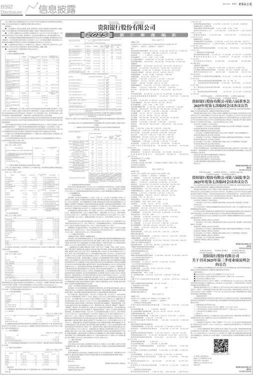 本公司董事会及全体董事保证本公告内容不存在任何虚假记载、误导性陈述或者重大遗漏,并对其内容的真实性、准确性和完整性承担法律责任。 重要提示: ● 公司董事会、监事会及董事、监事、高级管理人员保证季度报告内容的真实、准确、完整,不存在虚假记载、误导性陈述或重大遗漏,并承担个别和连带的法律责任。 ● 公司第六届董事会2025年度第七次临时会议于2025年10月30日审议通过了《贵阳银行股份有限公司2025年第三季度报告》,会议应表决董事10名,实际表决董事10名。 ● 本季度报告所载财务数据及指标按照中国企业会计准则编制,除特别说明为母公司数据外,均为贵阳银行股份有限公司及控股子公司广元市贵商村镇银行股份有限公司、贵阳贵银金融租赁有限责任公司的合并报表数据,货币单位以人民币列示。 ● 公司董事长张正海先生、行长盛军先生、主管会计工作的负责人李松芸先生、会计机构负责人李云先生保证本季度报告中财务信息的真实、准确、完整。 ● 公司2025年第三季度财务会计报告未经审计。 一、主要财务数据 (一)主要会计数据和财务指标 ■ 注:1.根据财政部《关于修订印发2018年度金融企业财务报表格式的通知》(财会〔2018〕36号)的规定,将基于实际利率法计提的利息计入金融工具账面余额中,资产负债表日尚未收到或尚未支付的利息在“其他资产”或“其他负债”列示。除非特别说明,本报告中提及的“发放贷款和垫款”“吸收存款”及其明细项目均为不含息金额。 2.公司于2025年8月25日召开董事会审议通过本次优先股股息发放方案,截至本报告期末尚未派发本年的股息,本表中的基本每股收益和加权平均净资产收益率均未考虑优先股股息的影响。 3.基本每股收益和加权平均净资产收益率根据中国证监会《公开发行证券的公司信息披露编报规则第9号一一净资产收益率和每股收益的计算及披露》(2010年修订)计算。 4.归属于母公司普通股股东的加权平均净资产收益率和扣除非经常性损益后归属于母公司普通股股东的加权平均净资产收益率未年化处理;总资产收益率未年化处理。 5.归属于母公司普通股股东的每股净资产=(归属于母公司股东的权益-其他权益工具优先股部分)/期末普通股股本总数。 6.非经常性损益根据中国证监会《公开发行证券的公司信息披露解释性公告第1号一非经常性损益》的定义计算,下同。 (二)非经常性损益项目和金额 单位:千元 币种:人民币 ■ (三)主要会计数据、财务指标发生变动的情况、原因 公司上述主要会计数据、财务指标与上年度期末或上年同期相比增减变动幅度超过30%的主要项目及原因 单位:千元 币种:人民币 ■ (四)补充财务指标 单位:千元 币种:人民币 ■ 注:净息差=利息净收入/生息资产平均余额;净利差=生息资产平均收益率-计息负债平均成本率。 (五)资本构成情况 单位:千元 币种:人民币 ■ 注:1.以上为根据国家金融监督管理总局《商业银行资本管理办法》计量的资本充足率相关数据及信息;根据《商业银行资本管理办法》,公司将进一步披露《贵阳银行股份有限公司2025年第三季度第三支柱信息披露报告》,详见公司网站(www.bankgy.cn)。 2.并表口径的资本充足率计算包括所有分支机构以及附属子公司贵银金融租赁有限责任公司和广元市贵商村镇银行股份有限公司。 (六)公司其他监管指标 ■ 注:拨备覆盖率、拨贷比指标计算中均包含贴现减值准备。 (七)杠杆率 单位:千元 币种:人民币 ■ 注:根据国家金融监督管理总局发布的《商业银行资本管理办法》计算,更多相关信息详见本行于官方网站(www.bankgy.cn)披露的《贵阳银行股份有限公司2025年第三季度第三支柱信息披露报告》。 (八)流动性覆盖率 单位:千元 币种:人民币 ■ 注:以上指标根据原中国银保监会于2018年5月发布的《商业银行流动性风险管理办法》计算。 (九)贷款五级分类情况 单位:千元 币种:人民币 ■ 二、股东信息 (一)截至报告期末的股东总数、前十名股东持股、前十名无限售条件股东情况 单位:股 ■ 持股5%以上股东、前10名股东及前10名无限售流通股股东参与转融通业务出借股份情况 不适用。 前10名股东及前10名无限售流通股股东因转融通出借/归还原因导致较上期发生变化 不适用。 (二)截至报告期末的优先股股东总数、前10名优先股股东持股情况表 单位:股 ■ (三)普通股股份质押及冻结情况 就本行所知,截至报告期末,本行393,301,634股股份存在质押情况,占已发行普通股股份总数的10.76%;63,737,440股股份涉及司法冻结情形,占已发行普通股股份总数的1.74%;本行147,908股被质押的股份涉及司法冻结,占已发行普通股股份总数的0.004%。 三、其他提醒事项 (一)总体经营情况 报告期内,本行深入贯彻党的二十大和二十届二中、三中全会、中央金融工作会议、中央经济工作会议精神,严格落实各级党委政府决策部署和监管要求,坚持金融工作的政治性、人民性,抢抓国家一揽子增量政策出台机遇,积极做好客户经营,努力构建稳健安全、内涵集约、特色鲜明、管理精细、均衡协同的高质量发展新模式,整体业务经营保持稳健。在英国《银行家》杂志2025年全球银行1000强榜单中,位列第197位,在中国银行业协会发布2025年度“中国银行业前100名单”中,位列第36位,排名较上一年度均有所提升。 业务规模方面,截至