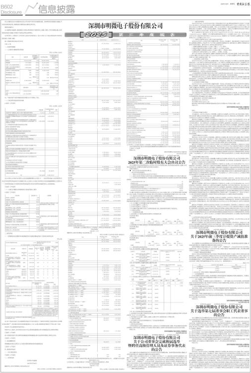 本公司董事会及全体董事保证本公告内容不存在任何虚假记载、误导性陈述或者重大遗漏,并对其内容的真实性、准确性和完整性依法承担法律责任。 重要内容提示: 公司董事会及董事、高级管理人员保证季度报告内容的真实、准确、完整,不存在虚假记载、误导性陈述或重大遗漏,并承担个别和连带的法律责任。 公司负责人、主管会计工作负责人及会计机构负责人(会计主管人员)保证季度报告中财务信息的真实、准确、完整。 第三季度财务报表是否经审计 □是 √否 一、主要财务数据 (一)主要会计数据和财务指标 单位:元币种:人民币 ■ 注:“本报告期”指本季度初至本季度末3个月期间,下同。 (二)非经常性损益项目和金额 √适用 □不适用 单位:元币种:人民币 ■ 对公司将《公开发行证券的公司信息披露解释性公告第1号一一非经常性损益》未列举的项目认定为非经常性损益项目且金额重大的,以及将《公开发行证券的公司信息披露解释性公告第1号一一非经常性损益》中列举的非经常性损益项目界定为经常性损益的项目,应说明原因。 □适用 √不适用 (三)主要会计数据、财务指标发生变动的情况、原因 √适用 □不适用 ■ 二、股东信息 (一)普通股股东总数和表决权恢复的优先股股东数量及前十名股东持股情况表 单位:股 ■ 注:前十名股东及前十名无限售条件股东中存在回购专户“深圳市明微电子股份有限公司回购专用证券账户”,报告期末持有的普通股数量为3,540,024股,根据规定回购专户不纳入前十名股 东及前十名无限售条件股东列示。 持股5%以上股东、前10名股东及前10名无限售流通股股东参与转融通业务出借股份情况 □适用 √不适用 前10名股东及前10名无限售流通股股东因转融通出借/归还原因导致较上期发生变化 □适用 √不适用 三、其他提醒事项 需提醒投资者关注的关于公司报告期经营情况的其他重要信息 □适用 √不适用 四、季度财务报表 (一)审计意见类型 □适用 √不适用 (二)财务报表 合并资产负债表 2025年9月30日 编制单位:深圳市明微电子股份有限公司 单位:元币种:人民币审计类型:未经审计 ■ 公司负责人:王乐康主管会计工作负责人:李泽会计机构负责人:李泽 合并利润表 2025年1一9月 编制单位:深圳市明微电子股份有限公司 单位:元币种:人民币审计类型:未经审计 ■ 本期发生同一控制下企业合并的,被合并方在合并前实现的净利润为:0元, 上期被合并方实现的净利润为:0元。 公司负责人:王乐康主管会计工作负责人:李泽会计机构负责人:李泽 合并现金流量表 2025年1一9月 编制单位:深圳市明微电子股份有限公司 单位:元币种:人民币审计类型:未经审计 ■ 公司负责人:王乐康主管会计工作负责人:李泽会计机构负责人:李泽 2025年起首次执行新会计准则或准则解释等涉及调整首次执行当年年初的财务报表 □适用 √不适用 特此公告。 深圳市明微电子股份有限公司董事会 2025年10月30日 证券代码:688699 证券简称:明微电子 公告编号:2025-036 深圳市明微电子股份有限公司 2025年第二次临时股东大会决议公告 本公司董事会及全体董事保证公告内容不存在任何虚假记载、误导性陈述或者重大遗漏,并对其内容的真实性、准确性和完整性依法承担法律责任。 重要内容提示: ● 本次会议是否有被否决议案:无 一、会议召开和出席情况 (一)股东大会召开的时间:2025年10月30日 (二)股东大会召开的地点:深圳市南山区粤海街道高新区社区沙河西路1801号国实大厦11层 (三)出席会议的普通股股东、特别表决权股东、恢复表决权的优先股股东及其持有表决权数量的情况: ■ 注:截止本次股东大会股权登记日的总股本为110,064,640股,其中,公司回购专用账户股份数为3,540,024股,不享有股东大会表决权,故公司本次股东大会表决权股份总数为106,524,616股。 (四)表决方式是否符合《公司法》及公司章程的规定,大会主持情况等。 本次股东大会由公司董事会召集,董事长王乐康先生主持,会议采用现场投票和网络投票相结合的表决方式。本次股东大会的召集和召开程序、出席会议人员的资格和召集人资格、会议的表决程序和表决结果均符合《公司法》《证券法》及《公司章程》的规定。 (五)公司董事、监事和董事会秘书的出席情况 1、公司在任董事7人,出席7人; 2、公司在任监事3人,出席3人; 3、公司董事会秘书郭王洁女士出席本次股东大会,其他高管均列席了本次会议。 二、议案审议情况 (一)非累积投票议案 1、议案名称:关于取消监事会及修改公司章程的议案 审议结果:通过 表决情况: ■ 2、议案名称:关于修订及制定公司内部治理制度的议案 审议结果:通过 表决情况: ■ 3、议案名称:关于续聘会计师事务所的议案 审议结果:通过 表决情况: ■ (二)累积投票议案表决情况 4.00、关于选举第七届董事会非独立董事的议案 ■ 5.00、关于选举第七届董事会独立董事的议案 ■ (三)涉及重大事项,应说明5%以下股东的表决情况 ■ (四)关于议案表决的有关情况说明 1、本次股东大会议案1为特别决议议案,已获出席本次股东大会的股东或者股东代理人所持表决权的三分之二以上审议通过。 2、本次股东大会议案1、议案3、议案4、议案5对中小投资者进行了单独计票。 三、律师见证情况 1、本次股东大会见证的律师事务所:广东华商律师事务所 律师