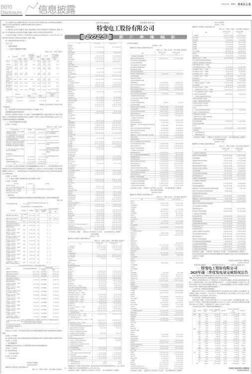 本公司董事会及全体董事保证本公告内容不存在任何虚假记载、误导性陈述或者重大遗漏,并对其内容的真实性、准确性和完整性承担法律责任。 重要内容提示: 公司董事会、监事会及董事、监事、高级管理人员保证季度报告内容的真实、准确、完整,不存在虚假记载、误导性陈述或重大遗漏,并承担个别和连带的法律责任。 公司负责人张新、主管会计工作负责人白云罡及会计机构负责人(会计主管人员)李爱华保证季度报告中财务信息的真实、准确、完整。 第三季度财务报表是否经审计 □是 √否 一、主要财务数据 (一)主要会计数据和财务指标 单位:万元 币种:人民币 ■ / 特变电工股份有限公司2025年第三季度报告 注:“本报告期”指本季度初至本季度末3个月期间,下同。 追溯调整或重述的原因说明 报告期,公司控股公司受让了公司第一大股东新疆特变电工集团有限公司下属公司的股权,公司财务报表合并范围发生变化。按照同一控制下企业合并的相关规定,公司对上年同期财务报表数据进行追溯调整。 (二)非经常性损益项目和金额 √适用 □不适用 单位:元 币种:人民币 ■ 对公司将《公开发行证券的公司信息披露解释性公告第1号一一非经常性损益》未列举的项目认定为非经常性损益项目且金额重大的,以及将《公开发行证券的公司信息披露解释性公告第1号一一非经常性损益》中列举的非经常性损益项目界定为经常性损益的项目,应说明原因。 □适用 √不适用 (三)主要会计数据、财务指标发生变动的情况、原因 √适用 □不适用 ■ 二、股东信息 (一)普通股股东总数和表决权恢复的优先股股东数量及前十名股东持股情况表 单位:股 ■ 持股5%以上股东、前10名股东及前10名无限售流通股股东参与转融通业务出借股份情况 □适用 √不适用 前10名股东及前10名无限售流通股股东因转融通出借/归还原因导致较上期发生变化 □适用 √不适用 三、其他提醒事项 需提醒投资者关注的关于公司报告期经营情况的其他重要信息 □适用 √不适用 四、季度财务报表 (一)审计意见类型 □适用 √不适用 (二)财务报表 合并资产负债表 2025年9月30日 编制单位:特变电工股份有限公司 单位:元 币种:人民币 审计类型:未经审计 ■ 公司负责人:张新 主管会计工作负责人:白云罡 会计机构负责人:李爱华 合并利润表 2025年1一9月 编制单位:特变电工股份有限公司 单位:元 币种:人民币 审计类型:未经审计 ■ 本期发生同一控制下企业合并的,被合并方在合并前实现的净利润为:1,325,130.99元, 上期被合并方实现的净利润为:2,187,942.17元。 公司负责人:张新 主管会计工作负责人:白云罡 会计机构负责人:李爱华 合并现金流量表 2025年1一9月 编制单位:特变电工股份有限公司 单位:元 币种:人民币 审计类型:未经审计 ■ 公司负责人:张新 主管会计工作负责人:白云罡 会计机构负责人:李爱华 母公司资产负债表 2025年9月30日 编制单位:特变电工股份有限公司 单位:元 币种:人民币 审计类型:未经审计 ■ 公司负责人:张新 主管会计工作负责人:白云罡 会计机构负责人:李爱华 母公司利润表 2025年1一9月 编制单位:特变电工股份有限公司 单位:元 币种:人民币 审计类型:未经审计 ■ 公司负责人:张新 主管会计工作负责人:白云罡 会计机构负责人:李爱华 母公司现金流量表 2025年1一9月 编制单位:特变电工股份有限公司 单位:元 币种:人民币 审计类型:未经审计 ■ 公司负责人:张新 主管会计工作负责人:白云罡 会计机构负责人:李爱华 2025年起首次执行新会计准则或准则解释等涉及调整首次执行当年年初的财务报表 □适用 √不适用 特此公告。 特变电工股份有限公司董事会 2025年10月31日 证券代码:600089 证券简称:特变电工 公告编号:临2025-073 特变电工股份有限公司 2025年前三季度发电量完成情况公告 本公司董事会及全体董事保证本公告内容不存在任何虚假记载、误导性陈述或者重大遗漏,并对其内容的真实性、准确性和完整性承担法律责任。 特变电工股份有限公司(以下简称公司)主营业务涉及煤电、风电及光伏发电业务,根据《上海证券交易所上市公司自律监管指引第3号一一行业信息披露第三号电力》《上海证券交易所上市公司自律监管指引第3号一一行业信息披露第九号光伏》的要求,现将公司2025年前三季度发电量完成情况披露如下: 1、2025年前三季度装机容量情况 截至2025年9月末,公司电站装机容量为9,286.45MW,其中:煤电5,040.00MW(含自备电厂装机1,000MW),占比54.27%,风电自营电站2,881.00MW,占比31.03%,光伏发电自营电站1,365.45MW,占比14.70%。 2、2025年前三季度发电量完成情况 2025年前三季度,公司电站发电量2,213,738.20万千瓦时,其中煤电发电量1,564,483.55万千瓦时;风电自营电站发电量508,788.33万千瓦时;光伏发电自营电站发电量140,466.32万千瓦时。上网电量共计2,048,623.56万千瓦时。 公司电站2025年前三季度发电量等数据如下: ■ 特变电工股份有限公司董事会 2025年10月31日 证券代码:600089 证券简称:特变电工